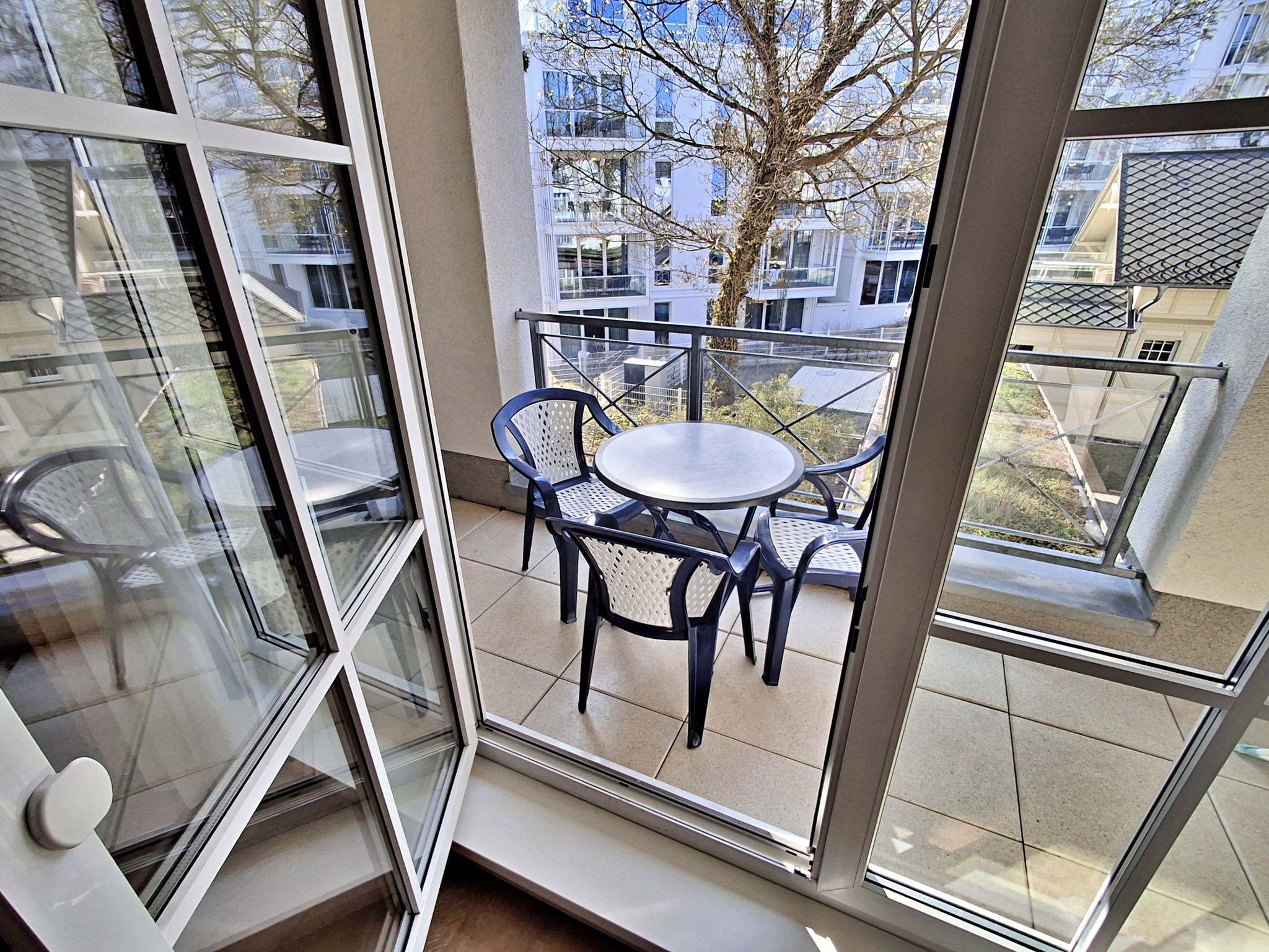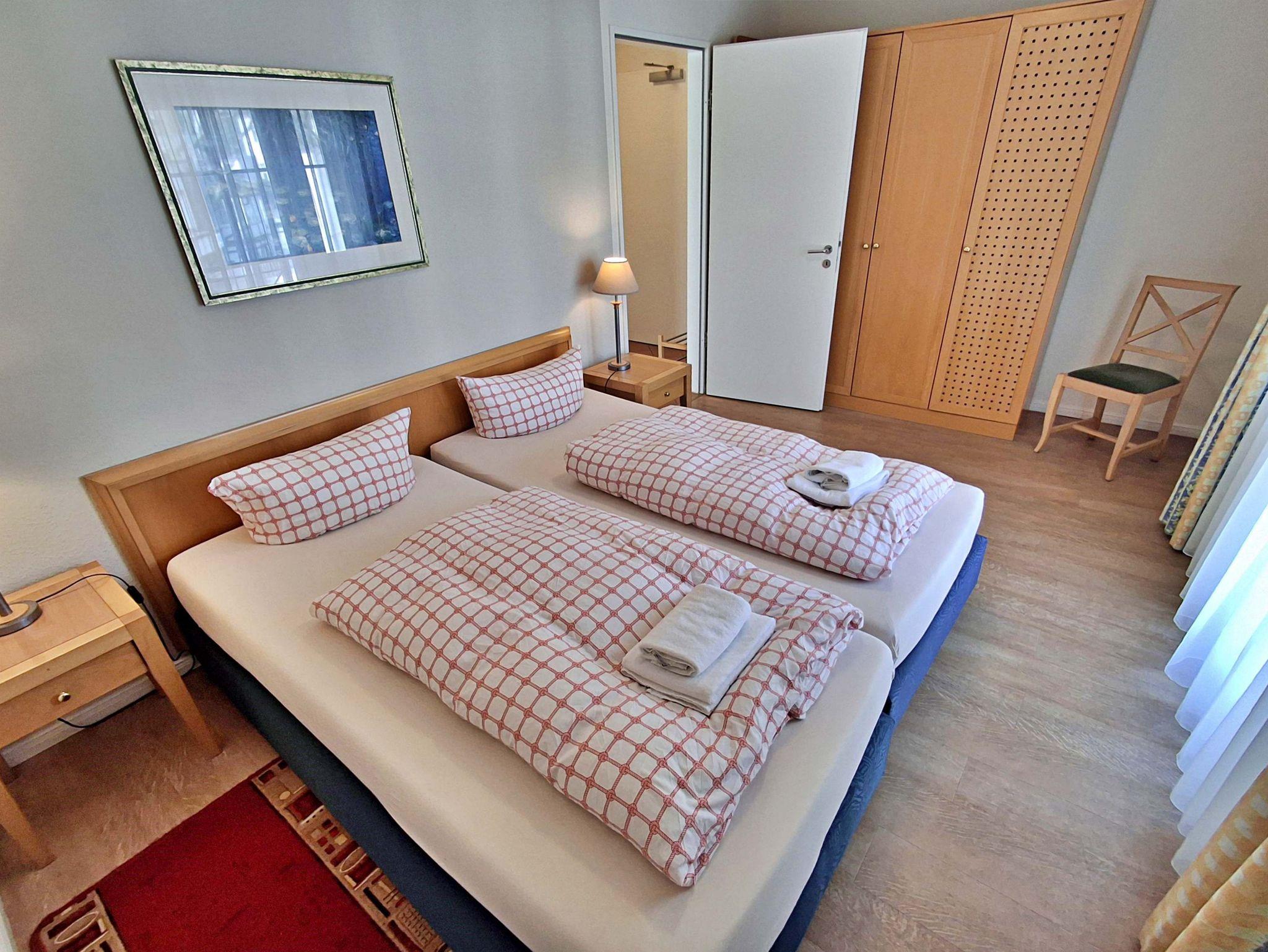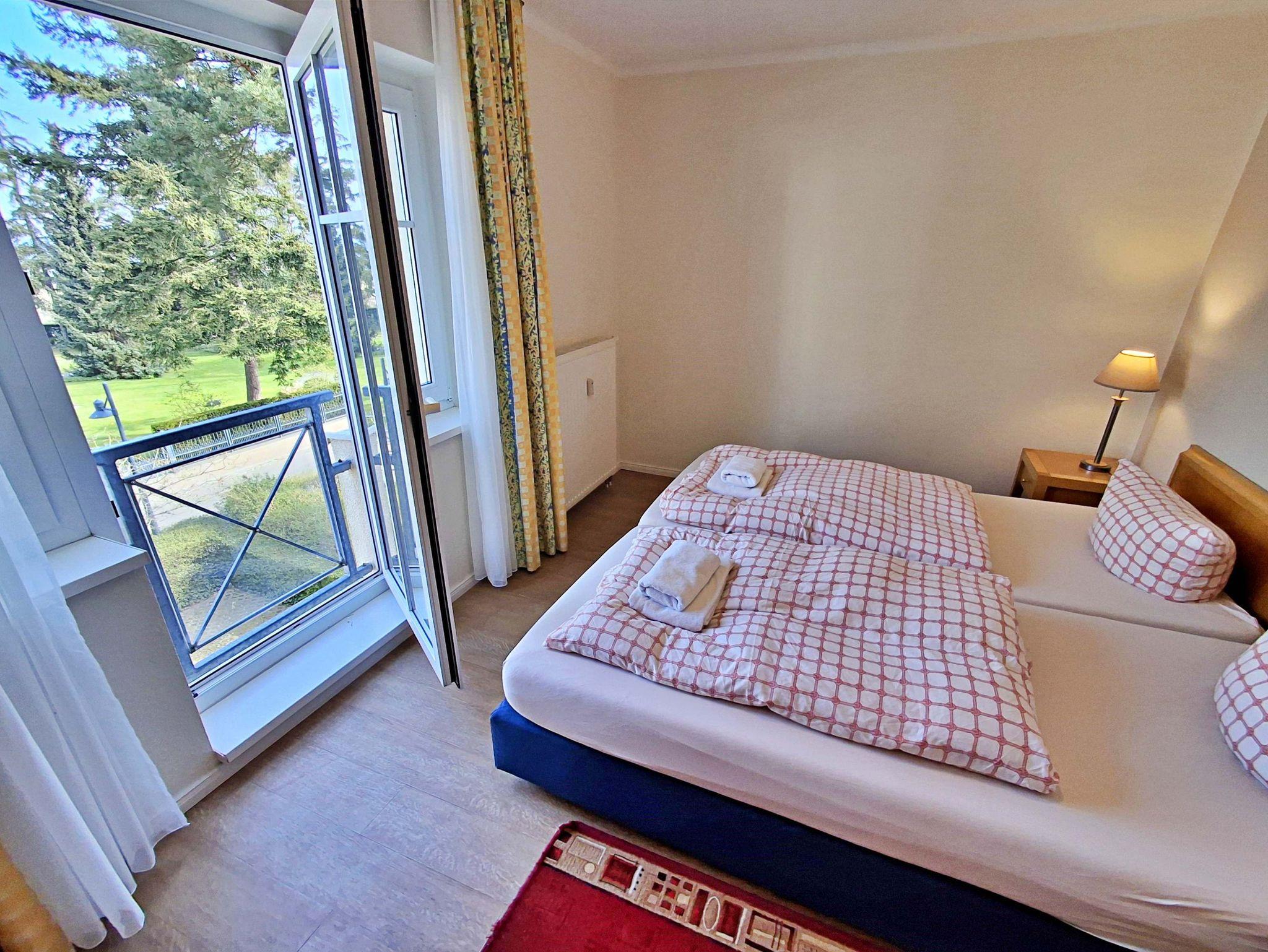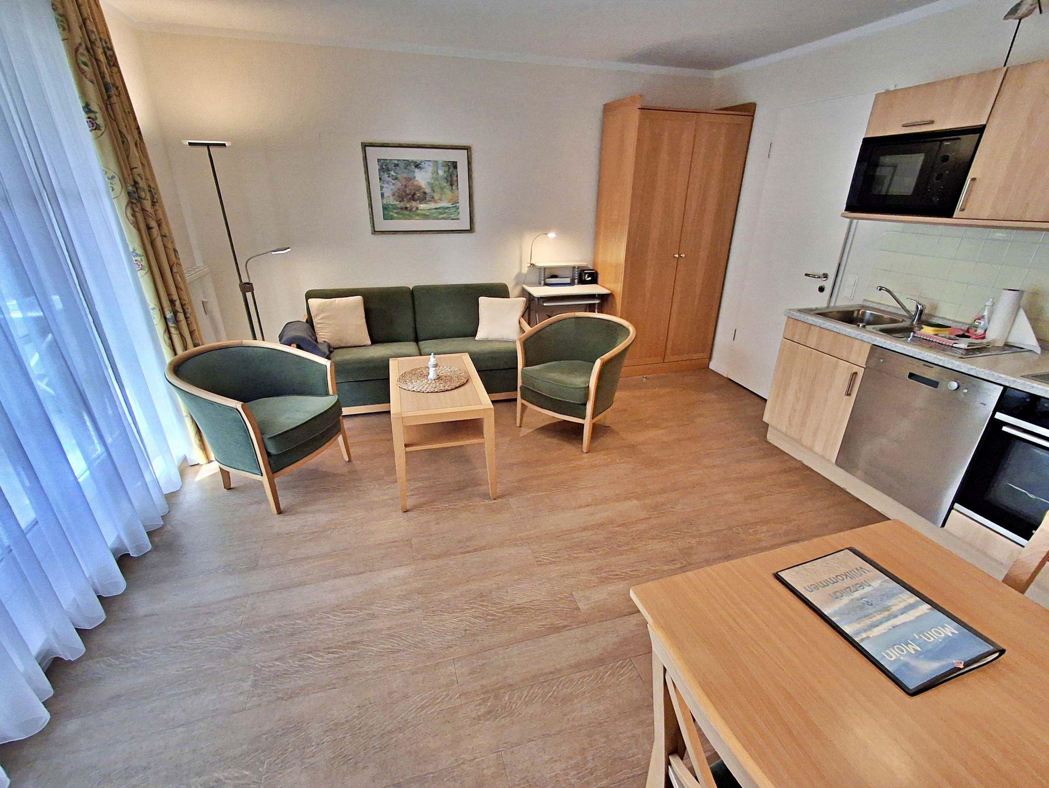 Die 47 qm große 2-Raum-Ferienwohnung mit eingeschränktem Meerblick befindet sich im zweiten Obgeschoss der Appartementanlage (Fahrstuhl vorhanden). Die Wohnung verfügt über ein Wohnzimmer mit Couch, welche auch zum Schlafen geeignet ist, bequeme Sessel sowie eine Essecke mit 4 Stühlen. Für die Unterhaltung sorgt ein Flachbild-TV, Stereo-Anlage, DVD-Player und eine Spielesammlung. Die vollständig ausgestattete Küchenzeile mit 4-Plattenherd, Backofen, Mikrowelle, Kühlschrank mit Gefrierfach, Spülmaschine, Sandwichtoaster lässt keine Wünsche offen. Im gemütlichen Schlafzimmer befindet sich ein Doppelbett (2,20 m lang und ohne Fußende). Das Tageslicht-Bad ist mit Dusche/WC und Haarfön ausgestattet. Eine Loggia zur Südseite lädt zum Sitzen und Verweilen ein.
