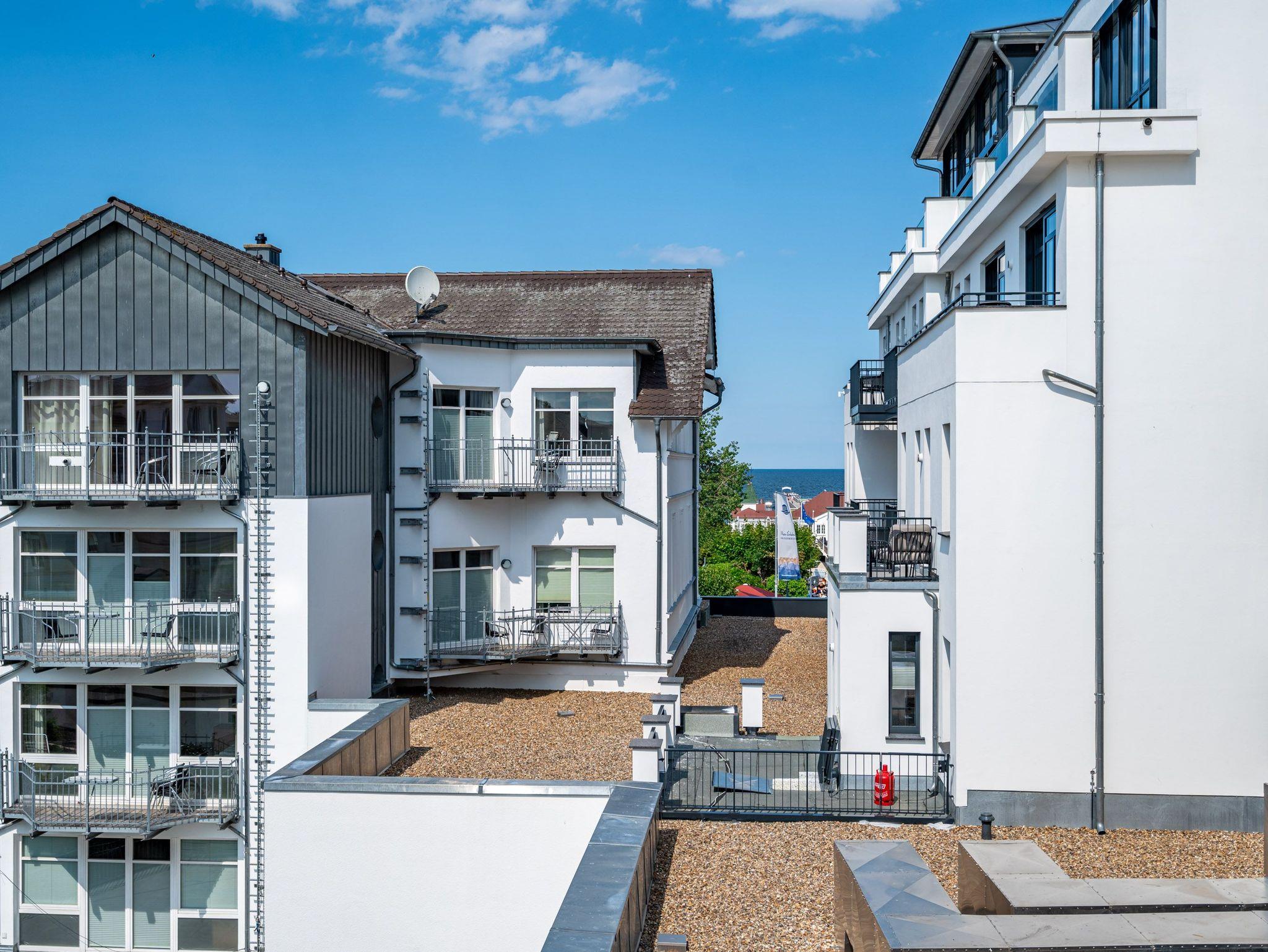 Die 2024 fertig gestellte Strandterrasse liegt direkt an der belebten Strandpromenade und bietet einen einzigartigen Ausblick auf die Grand Dame der historischen Seebrücken sowie die historische Konzertmuschel, einem beliebten Treffpunkt für Kunst und Kultur. Dahinter liegt die Ostsee ? ein Panorama, das zu den schönsten in den Kaiserbädern gehört. Es ist wie das Abtauchen in eine andere Zeit. In eine Zeit, in der man mit Stock, Sonnenschirm und Hut fürs ?Sehen und gesehen werden? über die Promenade schlenderte; aber auch in eine Zeit, in der ? damals wie heute ? Zeit einmal für eine kurze Weile keine Rolle spielt. Weil man angekommen ist im Loslassen, Entspannen und Genießen. Es ist dieser besondere Geruch nach Meeresluft und Freiheit, der in Erinnerung bleibt. Dazu die Bilder, die man mitnimmt. Von langen Strandspaziergängen, vom Lachen in fröhlich schäumenden Ostseewellen, von der Zeit in einem wunderschönen Urlaubsdomizil. Denn genau das ist die Strandterrasse mit ihren 56 modernen und exklusiven Ferienappartements direkt gegenüber der Ahlbecker Seebrücke. Die Ein-, Zwei- oder Dreizimmerwohnungen ? zwischen 40 und 70 Quadratmeter groß ? sind von einer Innenarchitektin gemeinsam mit unserem Erfahrungsschatz an Gästewünschen mit viel Liebe zum Detail und ganz individuell konzipiert worden. Entspannung und Wohlfühlen stehen an erster Stelle. Alles ist aufeinander abgestimmt und sorgt für eine gemütliche Atmosphäre. Wählen Sie zwischen einem Domizil in einem hellen, sandfarbenen Designkonzept oder einem Appartement mit anthrazitfarbenen Farbakzenten. Alle Appartements verfügen gleichermaßen über eine stilvolle und komfortable Einrichtung, die passgenau angefertigt worden ist, sowie über moderne Küchen und Bäder. Jedem Schlafzimmer ist ein eigenes Bad mit Dusche zugeordnet (außer App. B4.5). Die Appartements besitzen fast alle einen Balkon ? viele schauen sogar zur Ostsee hinaus. Die meisten Feriendomizile haben einen Elektrokamin und Infrarotsaunen. Im Erdgeschoss befindet sich ein separater Gemeinschaftsraum für Fahrräder. Außerdem besteht die Möglichkeit, im Gemeinschaftswaschraum 2 Waschmaschinen [&] Trockner zu nutzen. Ergänzt wird das Angebot durch eine Gemeinschaftssauna, die täglich von 11:00 bis 22:00 Uhr nutzbar ist. In der Tiefgarage (Einfahrtshöhe 2,03 Meter) steht für jede Wohnung 1 Pkw-Stellplatz zur Verfügung. Ist alles zur Zufriedenheit untergebracht? Dann kann der Urlaub ja beginnen. Und beim Blick vom Balkon über die Ostsee treffen sich zum Sonnenaufgang das Heute und das Damals. Gelassenheit legt sich beim Gang hinunter an den Strand auf die Seele. Jetzt darf die Zeit stehenbleiben.