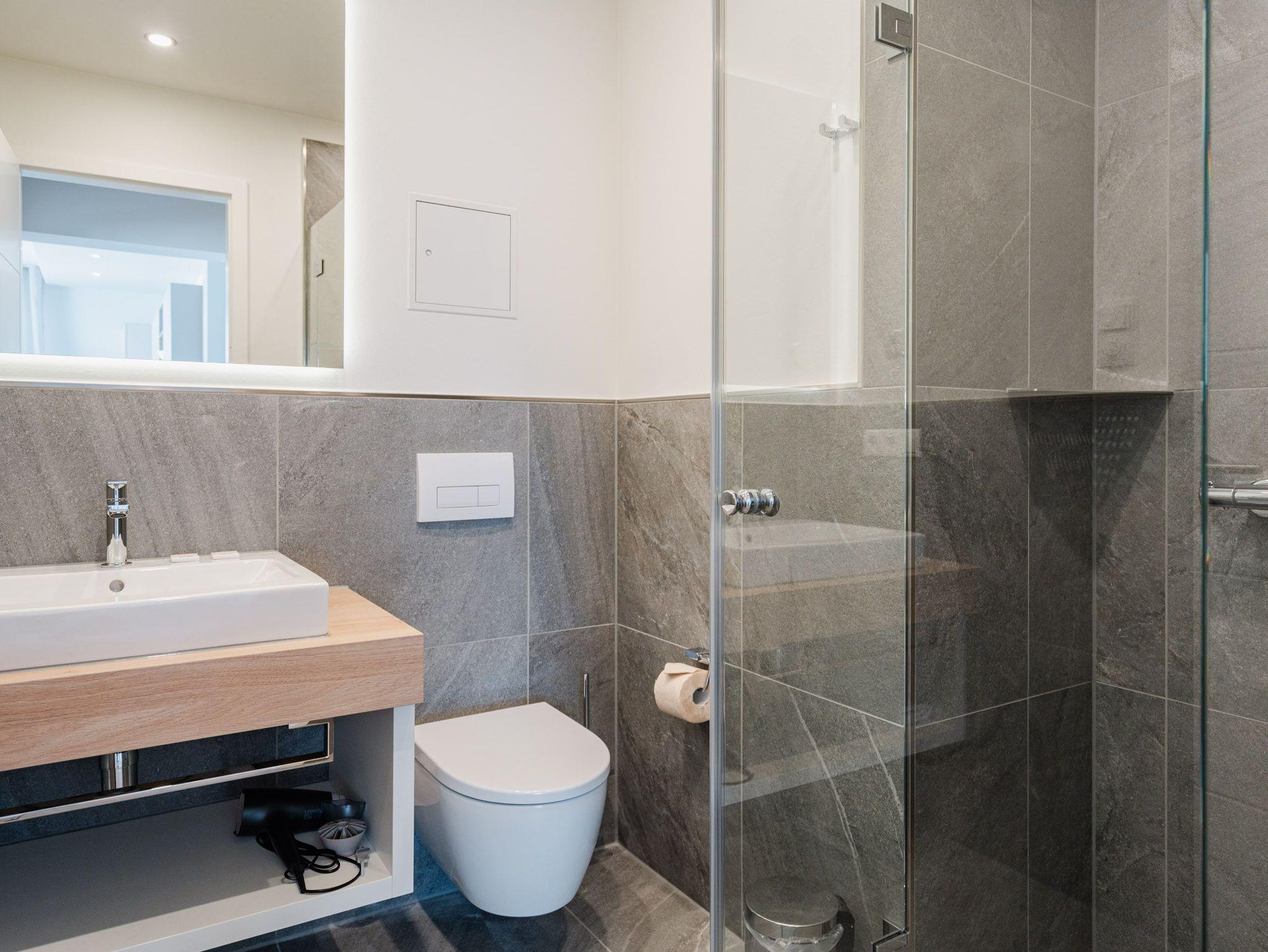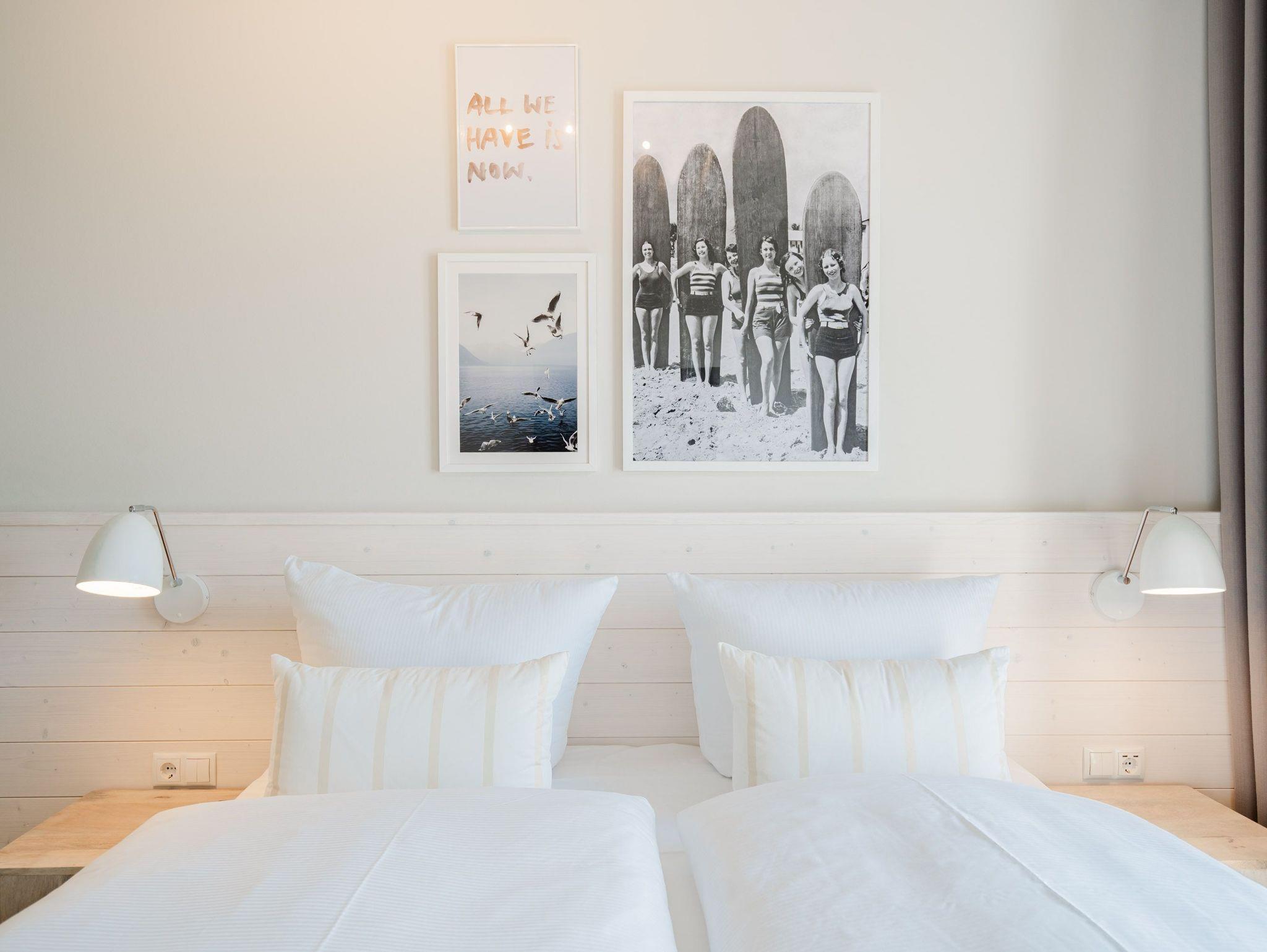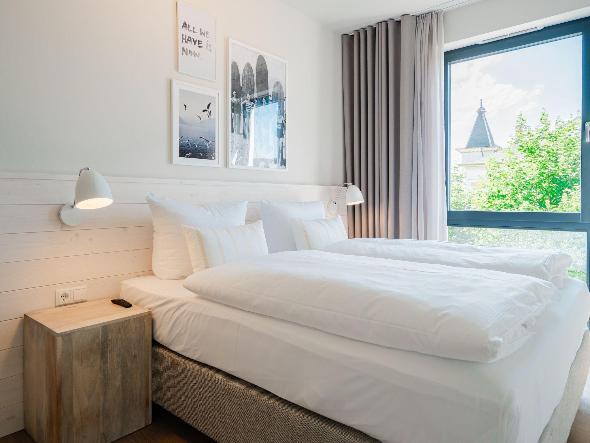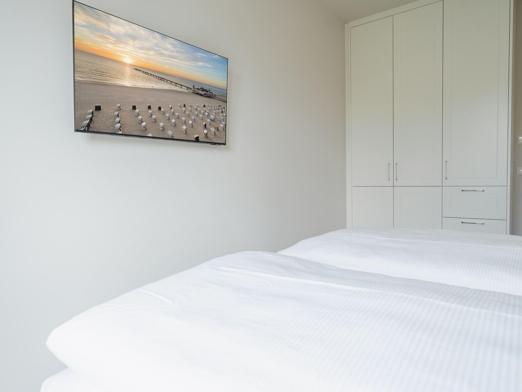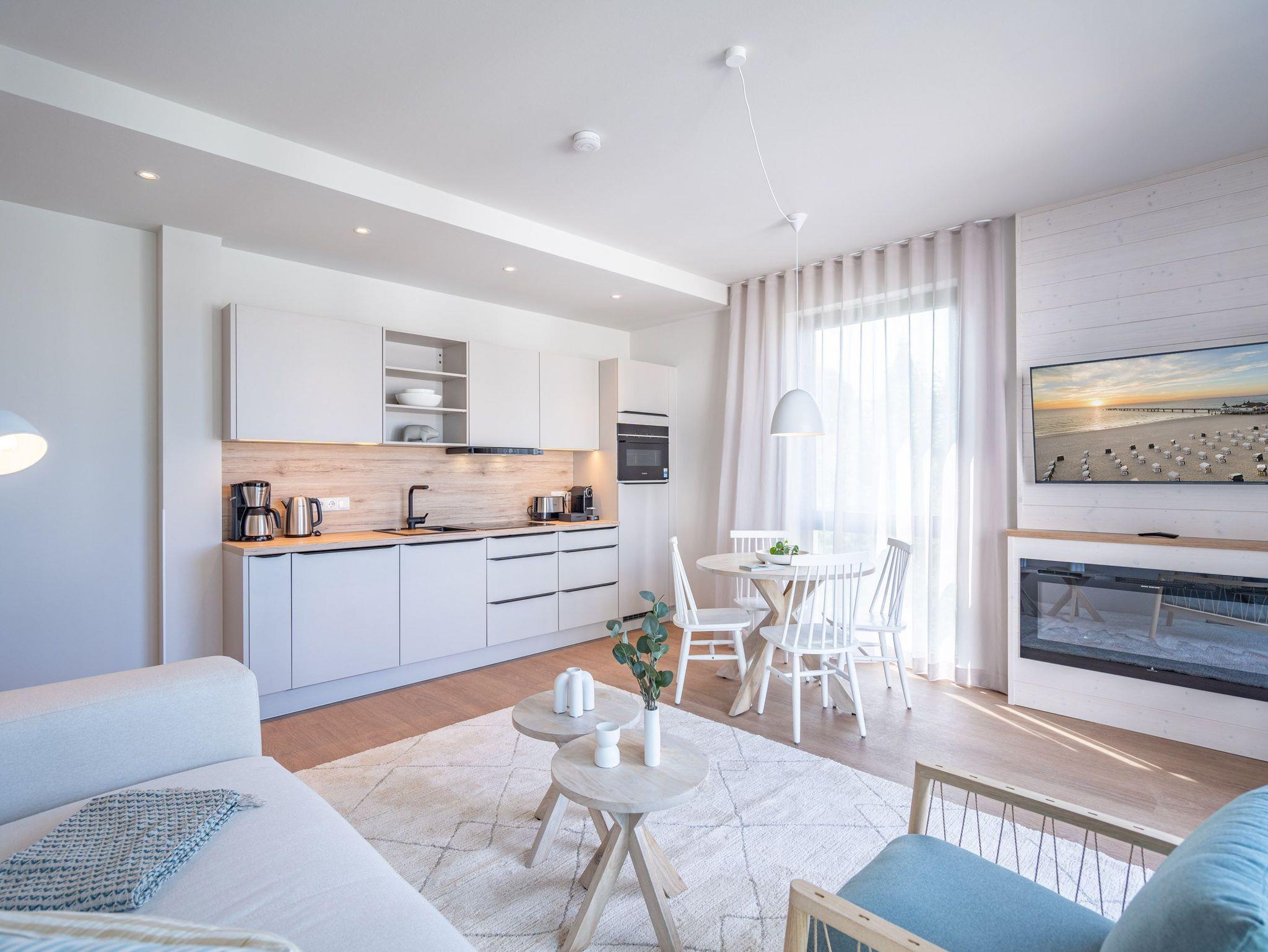 Ein helles und freundliches Urlaubsparadies empfängt Sie im 3-Raum-Appartement B 2.8 (Haus B) in der 2. Etage der Strandterrasse. Freuen Sie sich auf viel Gemütlichkeit und Komfort, denn die Wohnung ist ein absolutes Wohlfühlreich für bis zu 4 Personen. Viel Licht und wunderschöne Designmöbel verschönern Ihren Aufenthalt in den 62 Quadratmetern ungemein. Schon beim Eintreten bekommen Sie ein entspanntes Urlaubsgefühl. Der offene Wohn- und Essbereich bietet eine moderne Küchenzeile mit vielen Annehmlichkeiten wie einem Backofen, einem 4-Platten-Induktionsherd und einer Nespresso-Kapselmaschine. Hier macht das Kochen und das Zubereiten von Frühstück, Mittag oder Abendessen richtig Spaß. Essen können Sie am großen Esstisch mit 4 Stühlen. Viel Vergnügen beim Entspannen auf dem Sofa oder dem Sessel. Für Unterhaltung sorgt ein großer Flat-TV (50 Zoll). Wer es gern romantisch mag, kann sich mit dem Elektrokamin (ohne Wärmeabgabe) eine kuschelige Atmosphäre zaubern. Das Appartement verfügt über einen Nord-Ost-Balkon. Treten Sie aus dem Wohnzimmer hinaus und schnuppern Sie frische Ostseeluft. Und hinten schimmert es Blau: Denn zwischen der Strandterrasse und der Villa Seedüwel können Sie vom Balkon aus sogar aufs Meer schauen. Die Wohnung besitzt zwei Schlafzimmer. Beide sind mit einem komfortablen Boxspringdoppelbett (je 1,80m x 2,00m), einem Kleiderschrank und einem Flat-TV (43 Zoll) aufs Trefflichste eingerichtet. Viel Platz also für Privatsphäre und entspannte Nächte. Zwei moderne Bäder mit Dusche, Waschtisch und WC sind Ihre ganz persönlichen Wellnesszonen. Zum Appartement gehört in der Tiefgarage auch ein PKW-Stellplatz. Bei so viel Aussicht auf erholsame Tage kann Ihre Meerauszeit nur wunderschön werden.