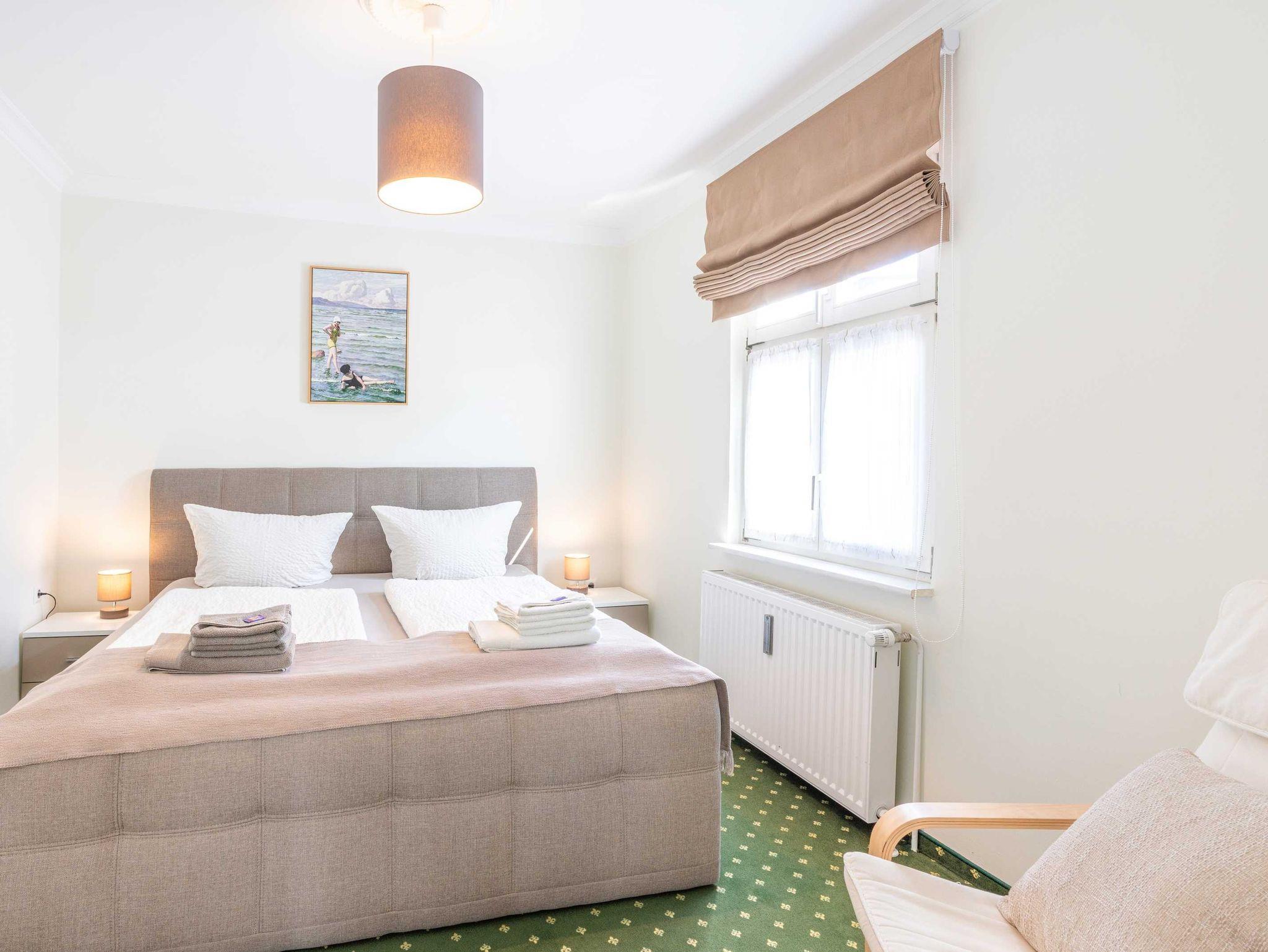 Die 64 m² große Ferienwohnung im ersten Obergeschoss bietet Platz für 4 Personen, zwei Schlafzimmer, einen großzügigen Wohn- und Essbereich, eine vollausgestattete Küche und ein Badezimmer mit Dusche. Außerdem verfügt die Wohnung über eine geschlossene Veranda.