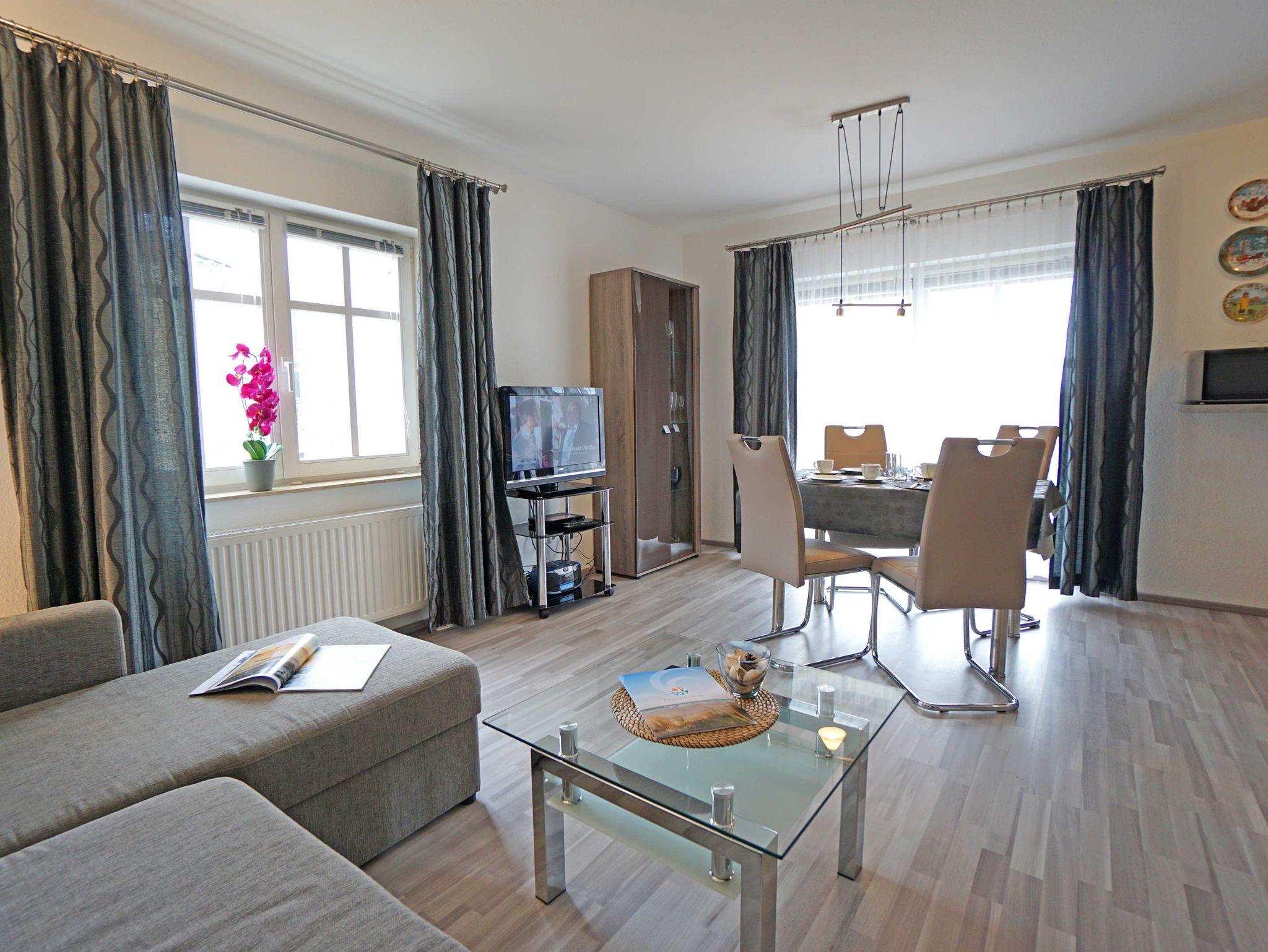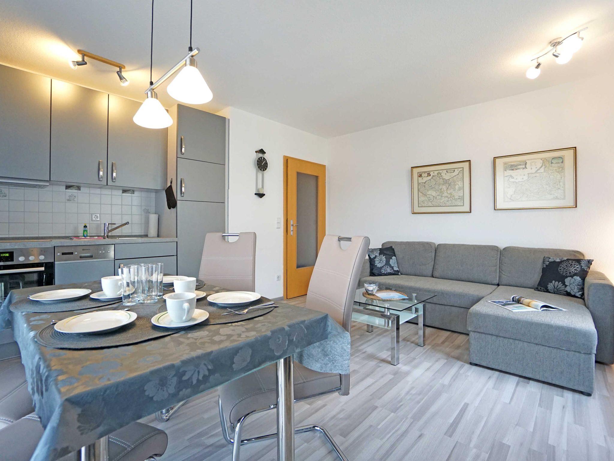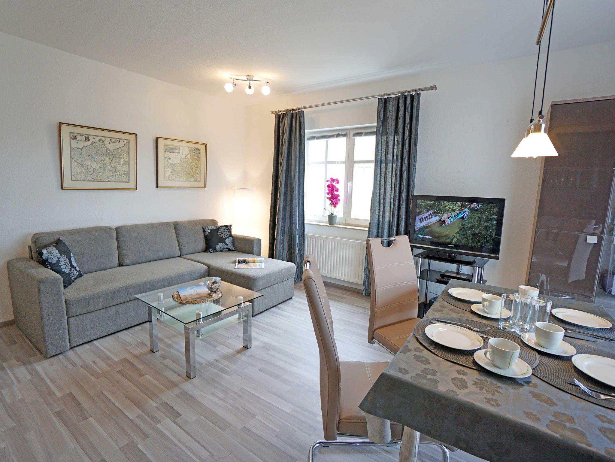 Die hochwertig eingerichtete, helle 2-Zimmer-Ferienwohnung verfügt über ein komfortabel eingerichtetes Wohnzimmer (Flachbildfernseher, DVD-Player, etc.) mit einer komplett ausgestatteten Küchenzeile (Geschirrspüler, Mikrowelle, etc.). Das Schlafzimmer ist mit einem Doppelbett ausgestattet. Ein kleiner sonniger Südbalkon rundet dieses schöne Appartment ab. Ein WLAN-Zugang steht Ihnen kostenfrei zur Verfügung.