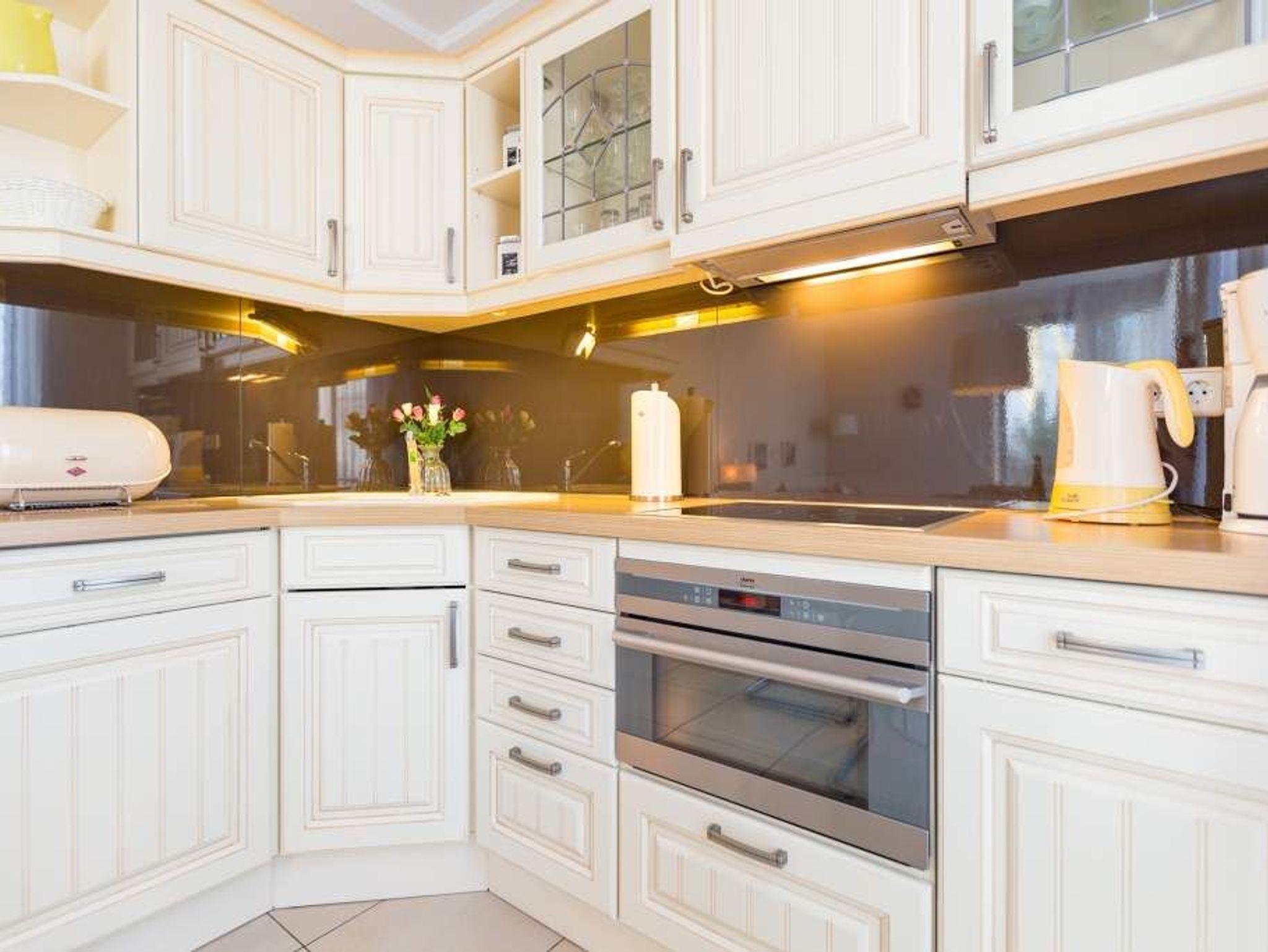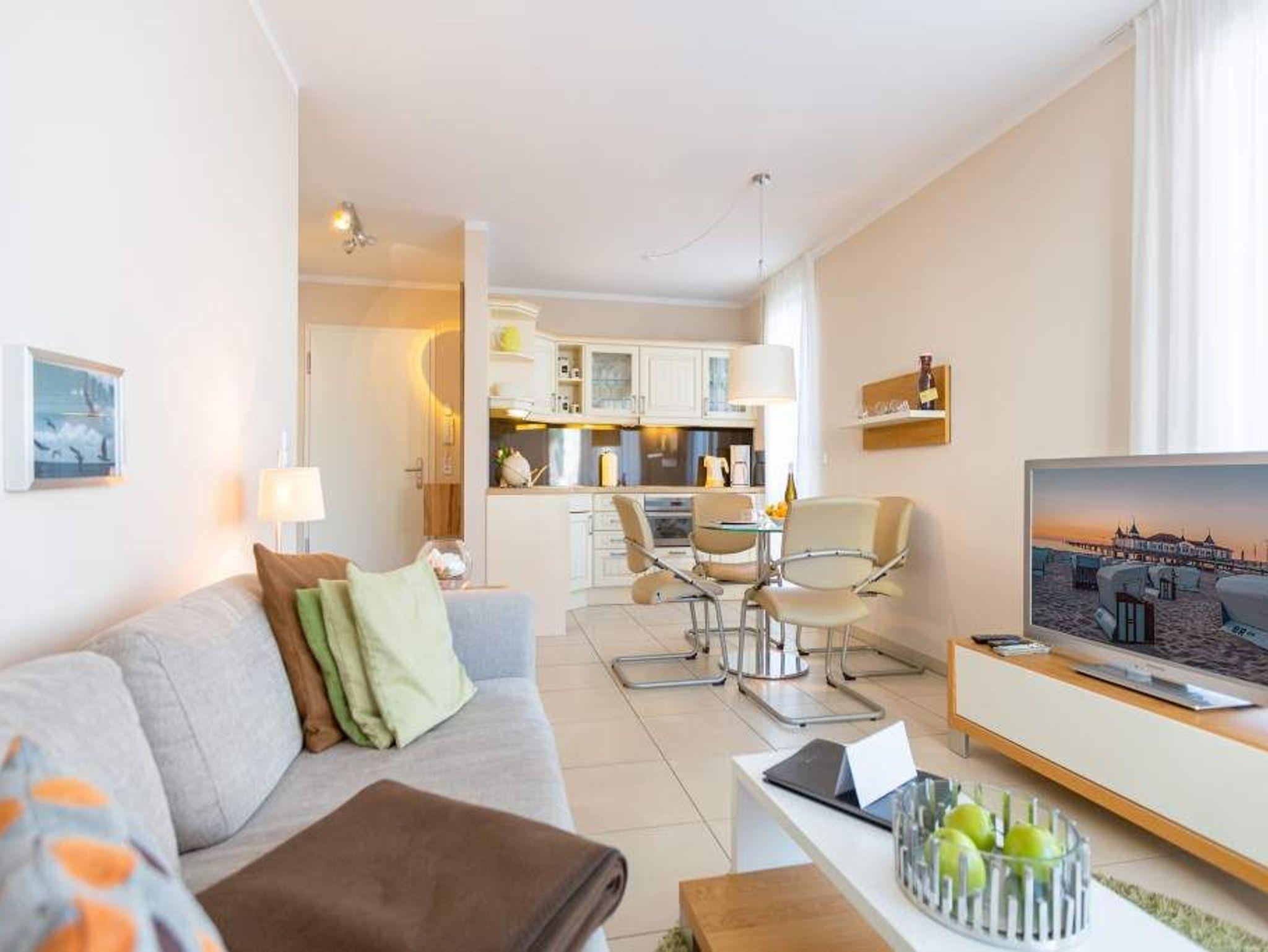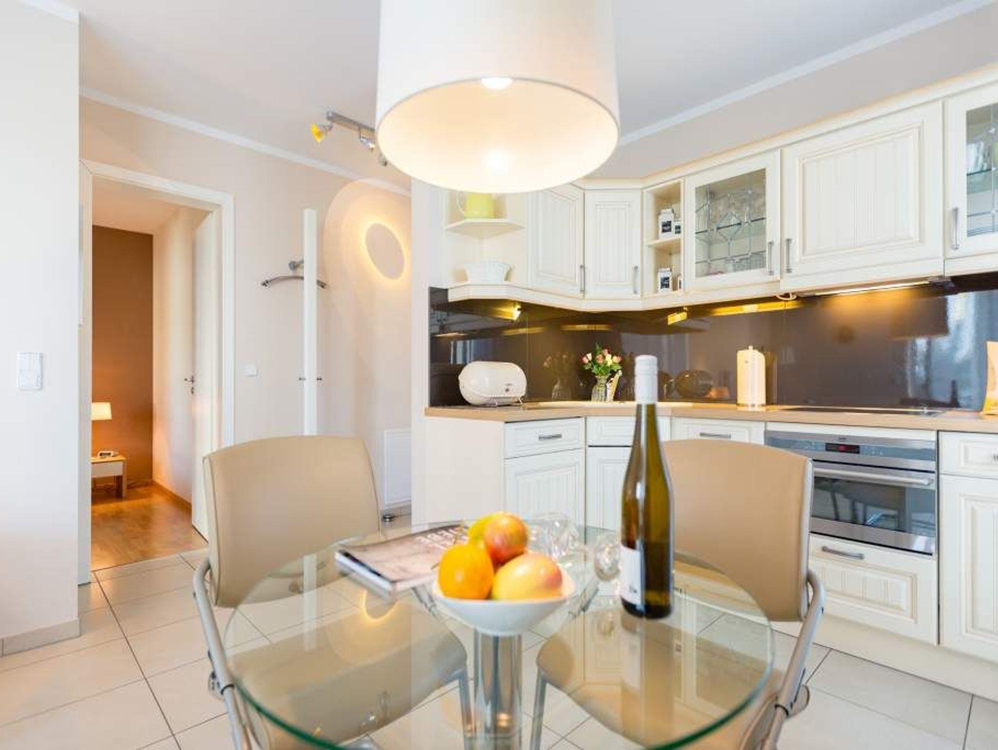 Die stilvolle 2-Raum-Ferienwohnung in der Villa Estrelia bietet auf 48 m² Platz für zwei Erwachsene und ein Kleinkind (bis 3 Jahre). Sie befindet sich im Hochparterre. Der helle Wohnbereich mit Sitzgruppe und Zugang zum Westbalkon lädt zum Entspannen ein. Die offene Küchenzeile ist voll ausgestattet und verfügt über Kochfeld, Backofen, Geschirrspüler und Kühlschrank. Das separate Schlafzimmer mit Doppelbett bietet ausreichend Stauraum. Ein Kinderreisebett (ohne Matratze und Bettzeug) sowie ein Hochstuhl sind auf Wunsch verfügbar. Das moderne Duschbad bietet eine komfortable Dusche und genügend Ablagefläche. Ein kostenfreier Pkw-Stellplatz befindet sich in der Tiefgarage, auch Fahrräder können hier untergestellt werden. Das WLAN-Netz im Haus steht kostenfrei zur Verfügung. Die Villa Estrelia liegt nur wenige Gehminuten vom Strand entfernt und bietet mit ihrer hochwertigen Ausstattung den perfekten Rahmen für einen erholsamen Ostseeurlaub.
