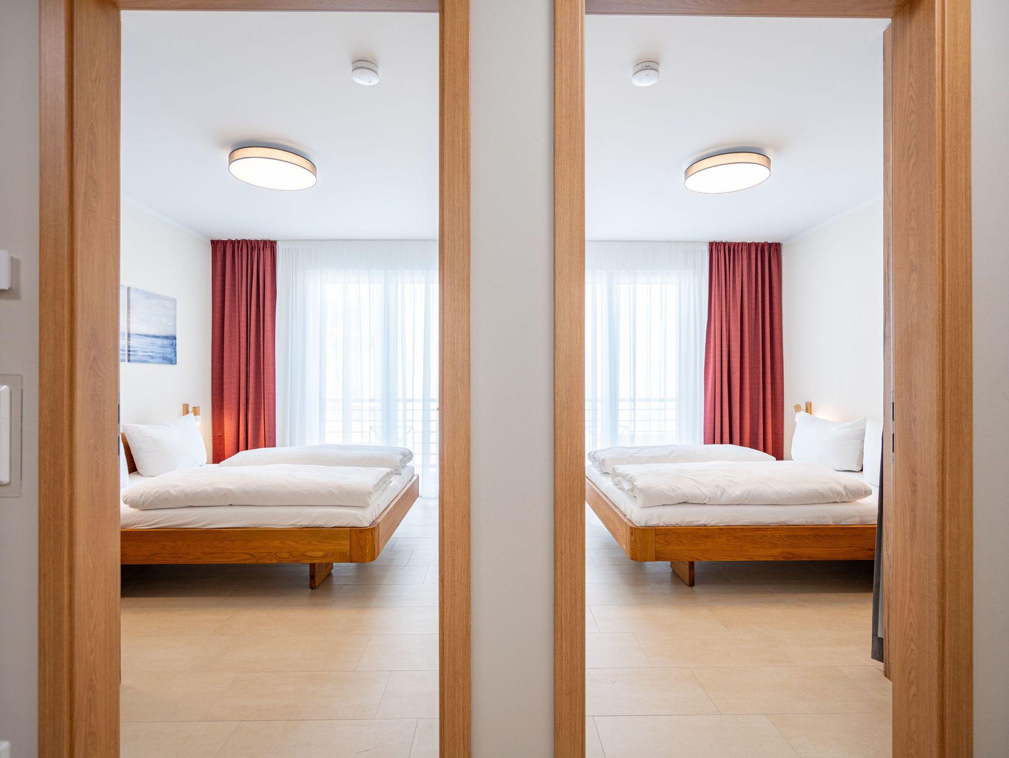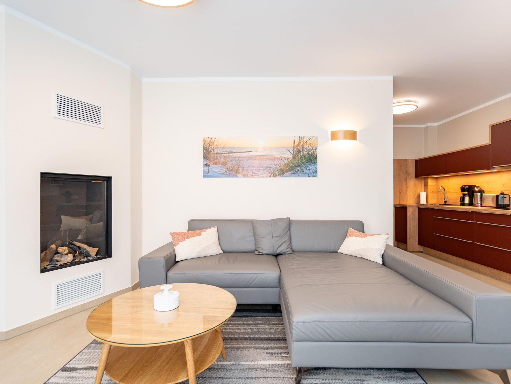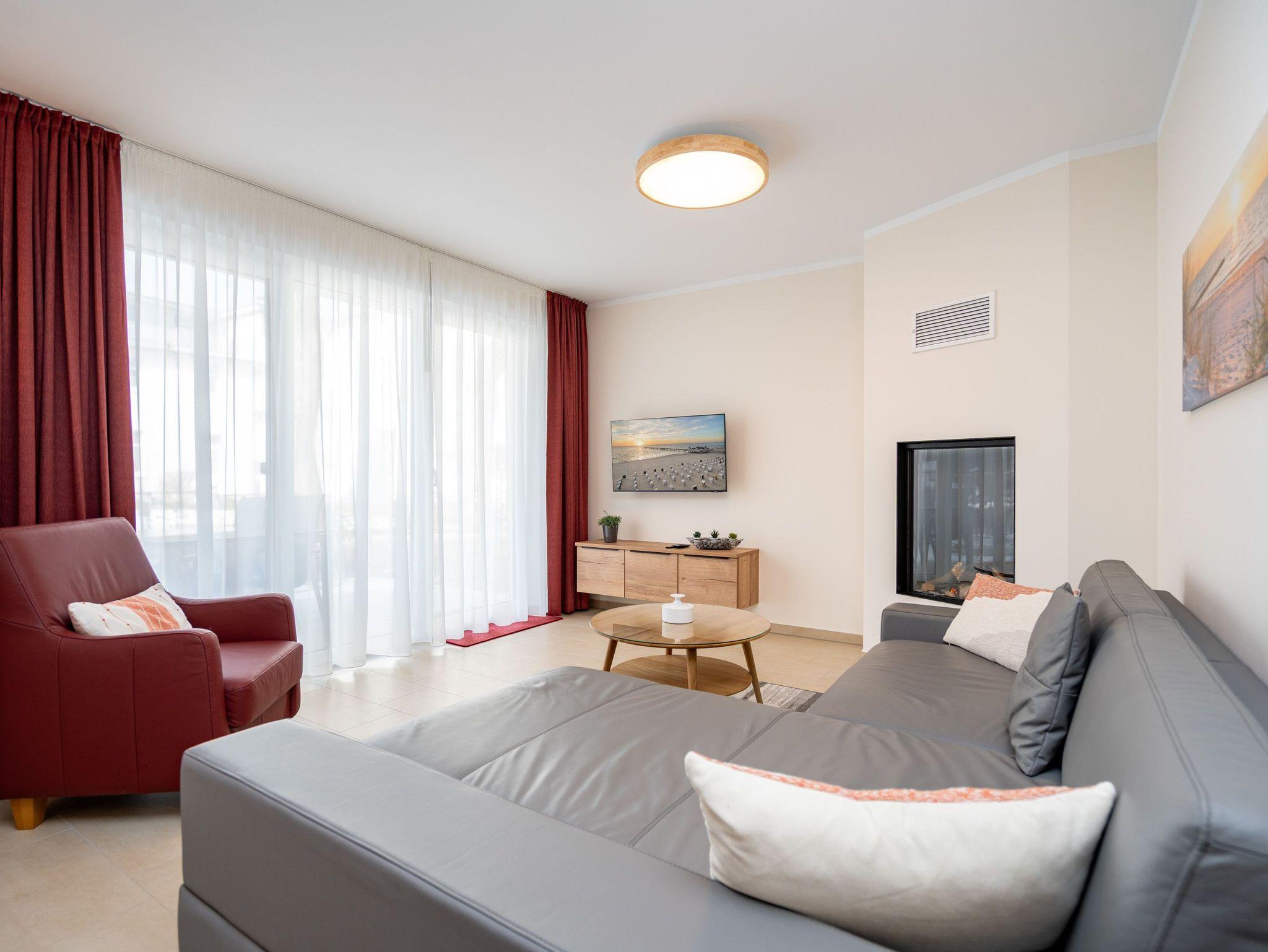 Die 3-Raum-Ferienwohnung Nr. 02 im Erdgeschoss des Quartier 6 bietet auf 73 m² Platz für bis zu 4 Personen und überzeugt mit einer modernen und komfortablen Ausstattung. Der offene Wohnbereich verfügt über eine voll ausgestattete Küchenzeile mit Induktionsherd, Mikrowelle und Backofen. Ein Essplatz für 4 Personen lädt zu gemeinsamen Mahlzeiten ein, während die gemütliche Sitzgruppe mit Flat-TV und ein per Fernbedienung gesteuerter Gas-Kamin für entspannte Abende sorgen. Von hier aus gelangen Sie auf die sonnige Süd-West-Terrasse mit einer Fläche von 10 m², die einen seitlichen Blick in Richtung Ostsee bietet. Die Ferienwohnung verfügt über zwei Schlafzimmer, jeweils mit einem Doppelbett (1,60 m x 2,00 m), Kleiderschrank und Flat-TV ausgestattet. Es stehen Ihnen zwei Bäder zur Verfügung: das erste innenliegende Bad bietet eine Dusche, einen Waschtisch, einen Haarfön und ein WC, während das zweite Bad ebenfalls mit Dusche, Waschtisch und WC ausgestattet ist und zusätzlich über eine Infrarotwärmekabine verfügt. Ein Hauswirtschaftsraum mit Waschmaschine und Trockner sorgt für zusätzlichen Komfort. Zur Wohnung gehört ein PKW-Stellplatz in der Tiefgarage sowie ein eigener Abstellraum im Keller für Fahrräder.