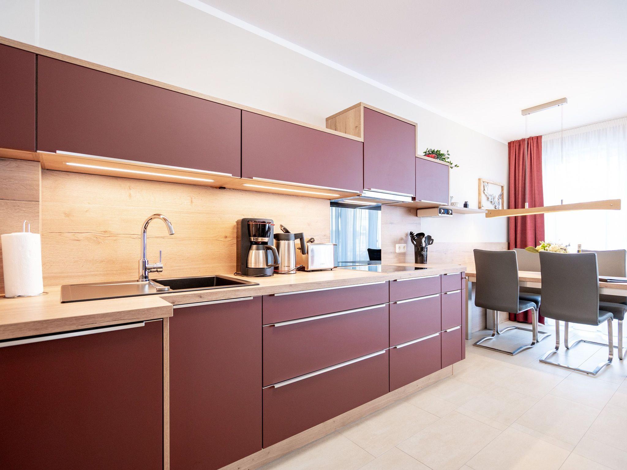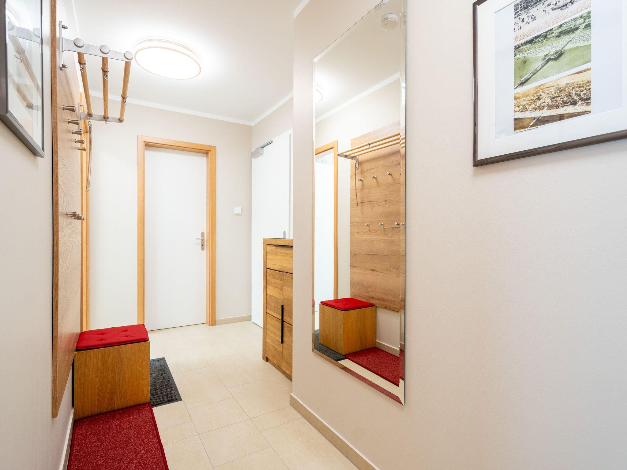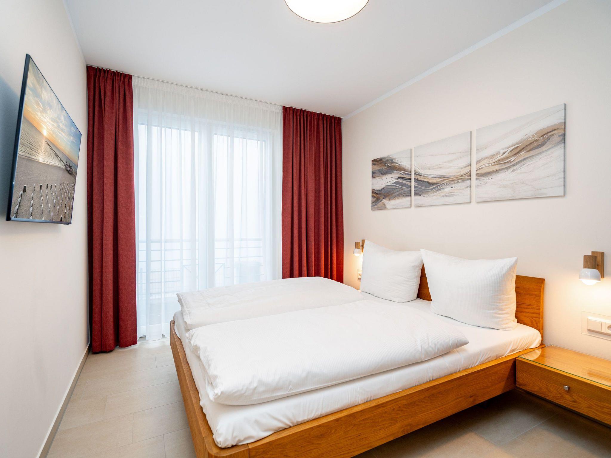 Die 3-Raum-Ferienwohnung Nr. 02 im Erdgeschoss des Quartier 6 bietet auf 73 m² Platz für bis zu 4 Personen und überzeugt mit einer modernen und komfortablen Ausstattung. Der offene Wohnbereich verfügt über eine voll ausgestattete Küchenzeile mit Induktionsherd, Mikrowelle und Backofen. Ein Essplatz für 4 Personen lädt zu gemeinsamen Mahlzeiten ein, während die gemütliche Sitzgruppe mit Flat-TV und ein per Fernbedienung gesteuerter Gas-Kamin für entspannte Abende sorgen. Von hier aus gelangen Sie auf die sonnige Süd-West-Terrasse mit einer Fläche von 10 m², die einen seitlichen Blick in Richtung Ostsee bietet. Die Ferienwohnung verfügt über zwei Schlafzimmer, jeweils mit einem Doppelbett (1,60 m x 2,00 m), Kleiderschrank und Flat-TV ausgestattet. Es stehen Ihnen zwei Bäder zur Verfügung: das erste innenliegende Bad bietet eine Dusche, einen Waschtisch, einen Haarfön und ein WC, während das zweite Bad ebenfalls mit Dusche, Waschtisch und WC ausgestattet ist und zusätzlich über eine Infrarotwärmekabine verfügt. Ein Hauswirtschaftsraum mit Waschmaschine und Trockner sorgt für zusätzlichen Komfort. Zur Wohnung gehört ein PKW-Stellplatz in der Tiefgarage sowie ein eigener Abstellraum im Keller für Fahrräder.