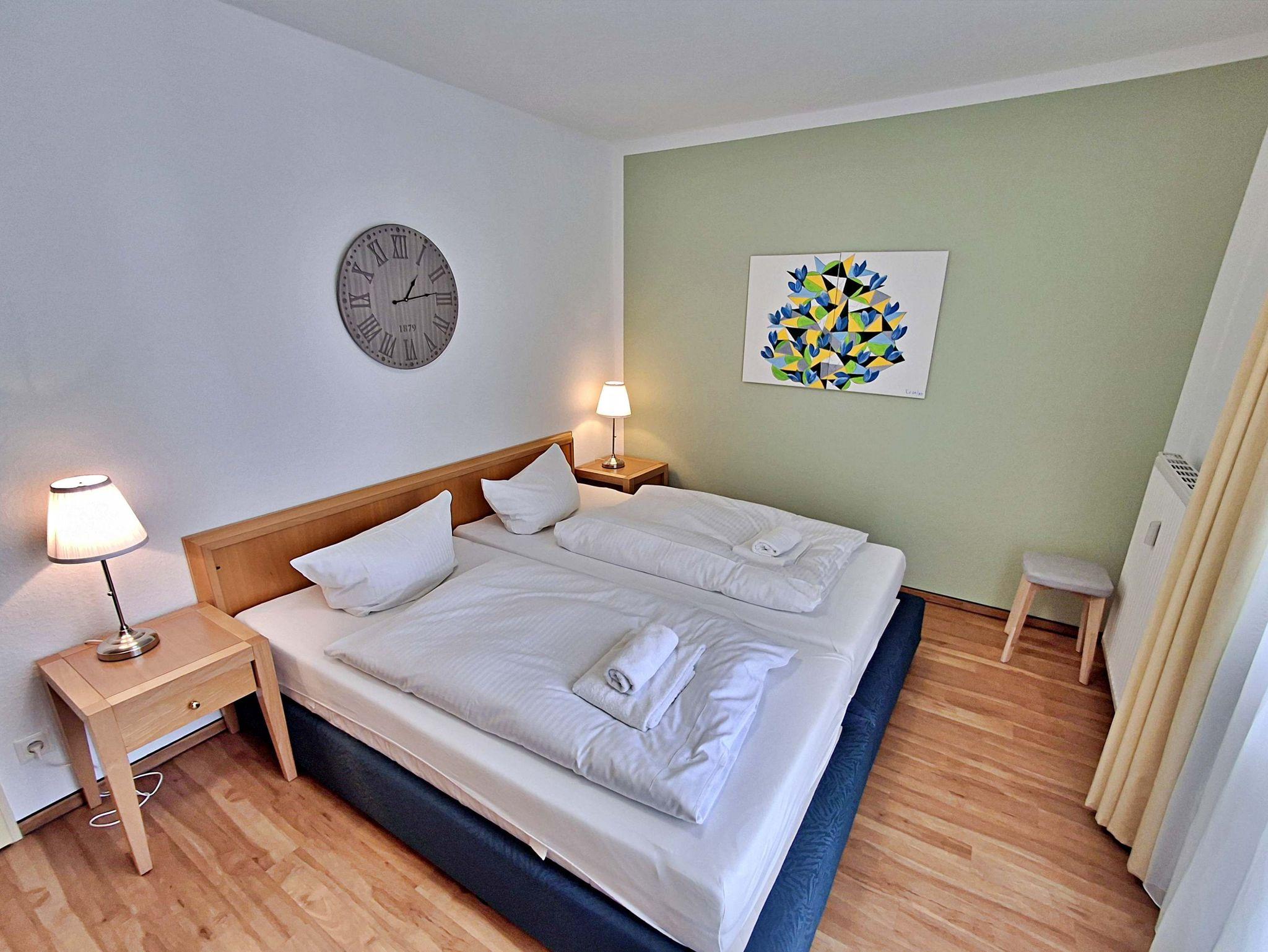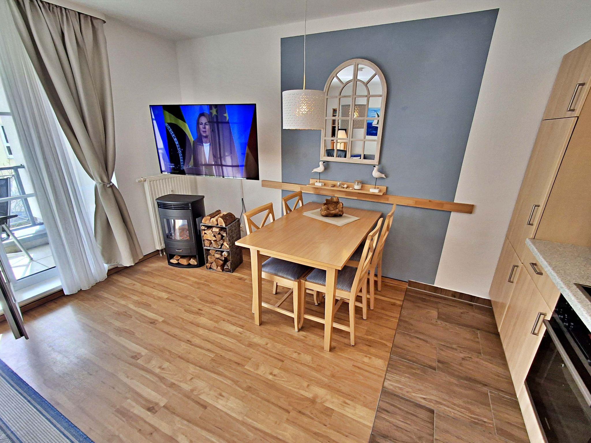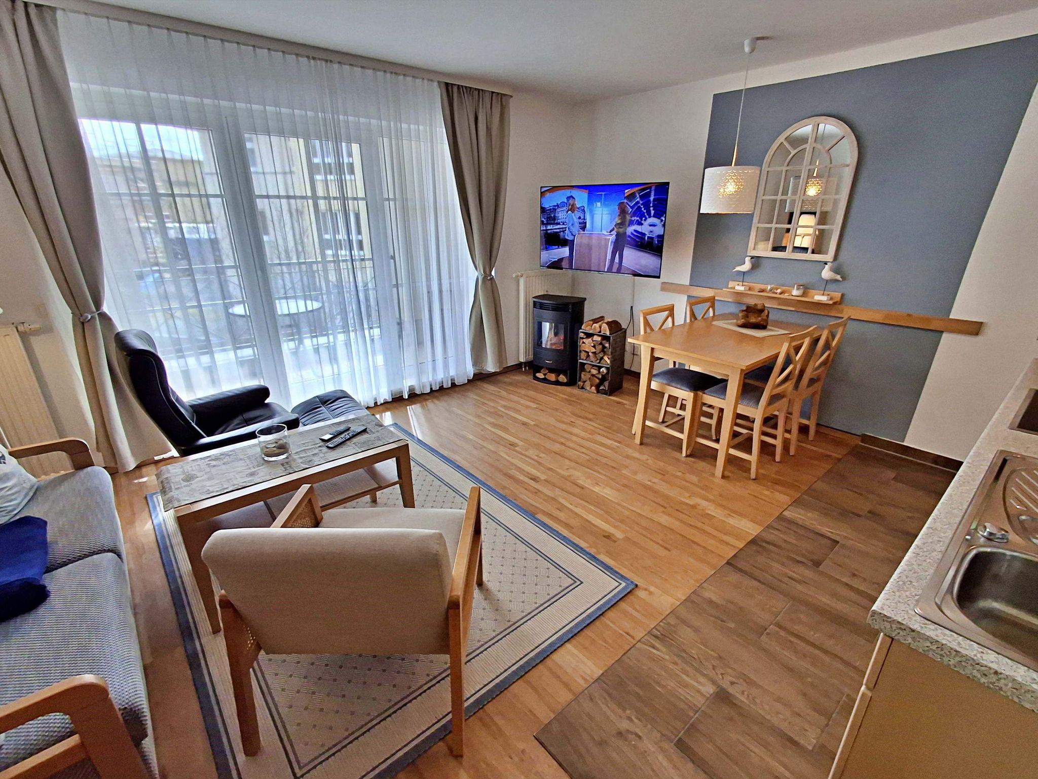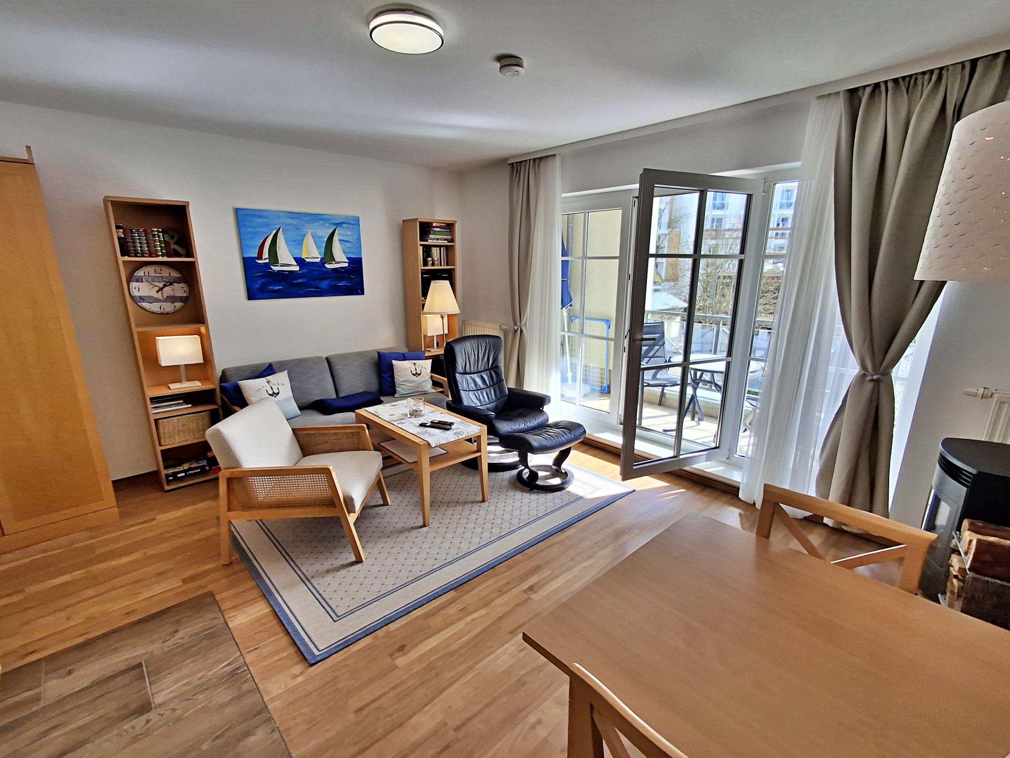 Die 47 qm große 2-Raum-Ferienwohnung befindet sich im zweiten Obgeschoss der Appartementanlage (Fahrstuhl vorhanden, ein stufenloses Erreichen der Wohnung ist gegeben). Die Wohnung verfügt über ein Wohnzimmer mit einem gemütlichen Sofa, Sessel, Elektro-Kamin sowie Esstisch mit 4 Stühlen. Für Unterhaltung sorgen ein internetfähiger Flachbild-TV, eine Stereo-Anlage, DVD-Player und eine Spielesammlung. Die vollständig ausgestattete Küche mit Ceranherd, Backofen, Mikrowelle, Kühlschrank mit Gefrierfach und Spülmaschine lässt keine Wünsche offen. Im Schlafzimmer befinden sich ein Doppelbett, ein Schlafsessel (90cm x 190 cm) und ein zweiter internetfähiger Flachbild-TV. Das Tageslicht-Bad ist mit Dusche/WC, Haarfön nebst Kosmetikspiegel ausgestattet. Eine möblierte Loggia zur Süd-Seite lädt zum Sitzen und Verweilen ein. WLAN steht Ihnen kostenfrei zur Verfügung. Ein Kinderbett mit Wäsche sowie ein Hochstuhl können auf Anfrage gegen eine Gebühr von einmalig 50 € vom Verwalter zur Verfügung gestellt werden.