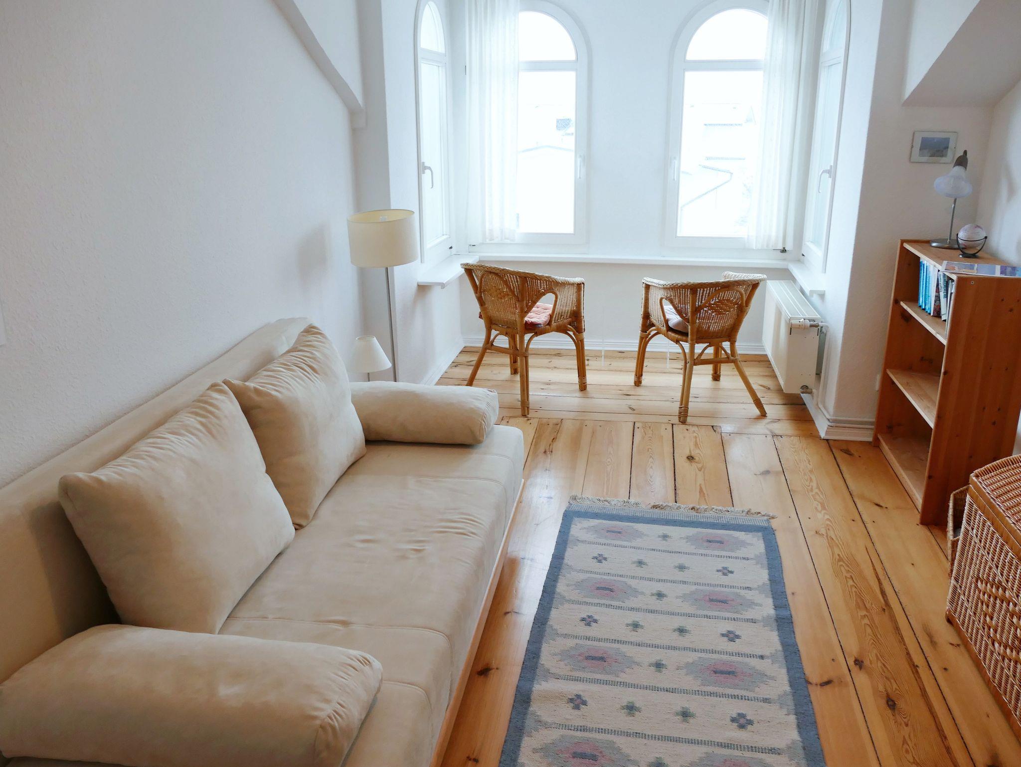 Genießen Sie Ihren Urlaub in unserer charmanten Dachgeschosswohnung mit Meerblick im 2. Obergeschoss. Die liebevoll eingerichtete Nichtraucherwohnung bietet auf drei Zimmern - Wohnzimmer mit offener Küche, Schlafzimmer mit Doppelbett sowie Gästezimmer mit Schlafcouch - ausreichend Platz für Paare, Familien oder Freunde. Die gesamte Wohnung ist mit originalen Holzdielen aus der Gründerzeit, hochwertigen Massivholzmöbeln und stilvollen Rattanmöbeln ausgestattet, was ihr ein besonderes, wohnliches Flair verleiht. In der modernen Küchenzeile finden Sie alles, was Sie im Urlaub benötigen: Herd, Backofen, Spülmaschine, Kühlschrank und Mikrowelle. Das gemütliche Wohnzimmer lädt zum Entspannen ein - ausgestattet mit Fernseher und CD-Player. Auch eine Waschmaschine steht Ihnen direkt in der Wohnung zur Verfügung. Ein eigener Parkplatz gehört zur Ferienwohnung, sodass Sie Ihr Auto bequem und sicher abstellen können. Für Familien bieten wir auf Anfrage Kinderbett und Hochstuhl kostenlos an. Bettwäsche und Handtücher können gegen Aufpreis hinzugebucht werden.