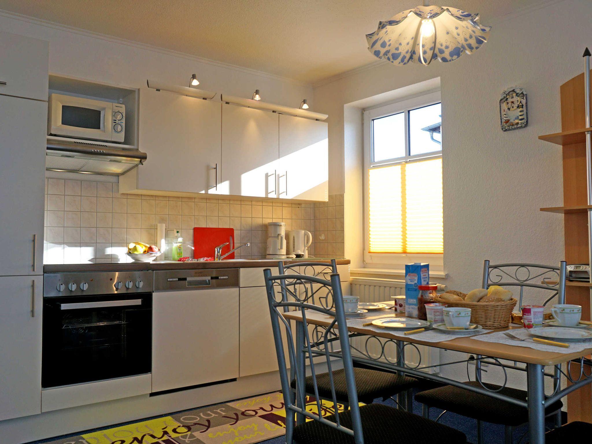 Die Ferienwohnung befindet sich im schönen frisch renovierten Haus Antje im 1. OG. Das gemütliche, komplett eingerichtete Wohnzimmer mit Couchgarnitur (Schlafcoch) und Küchenzeile lässt keine Wünsche offen. Das Schlafzimmer ist mit einem Doppelbett ausgestattet (genügend Platz für Babybett vorhanden). Das großzügige Bad ist ausgestattet mit Badewanne, Waschtisch und WC.