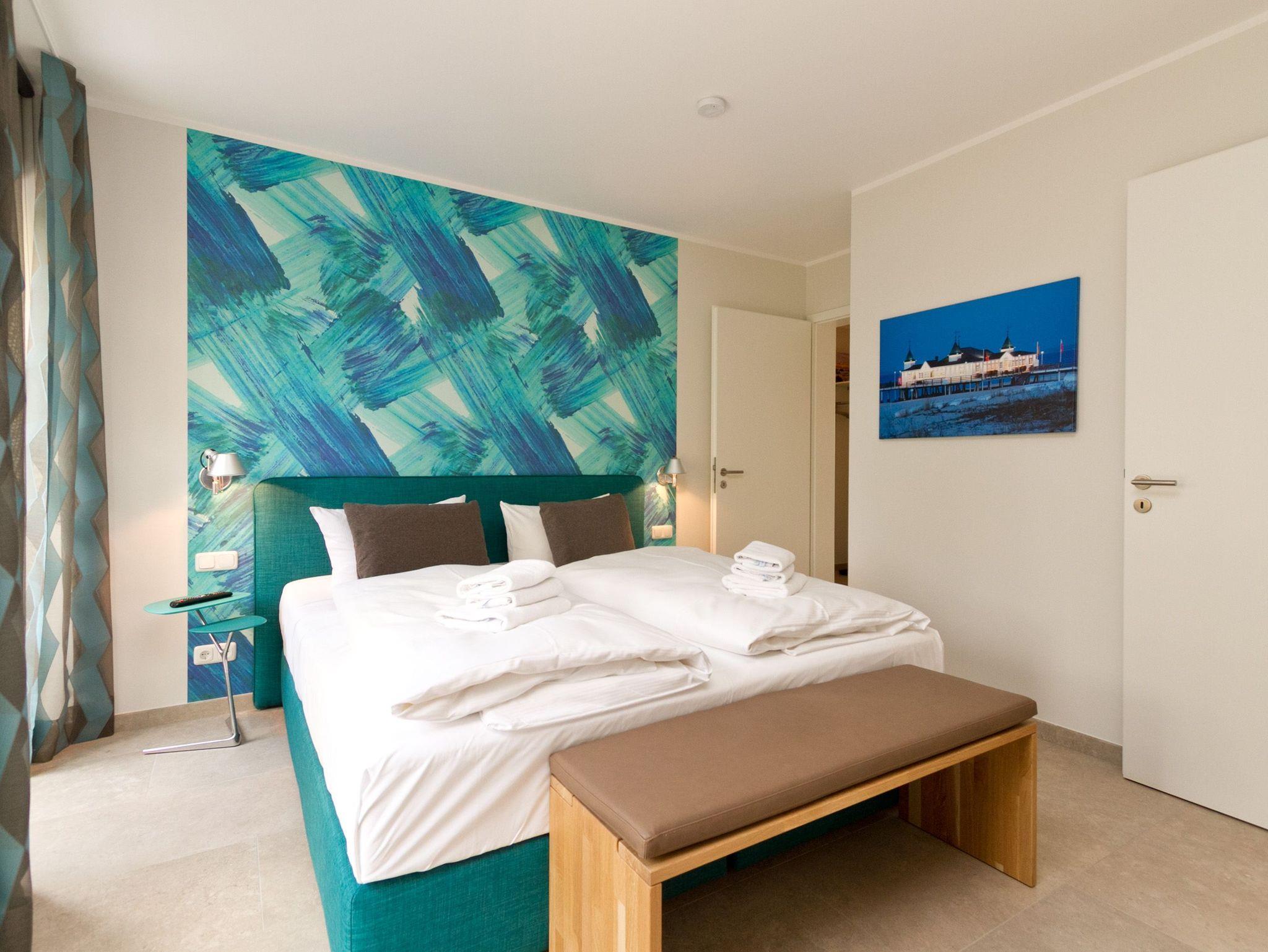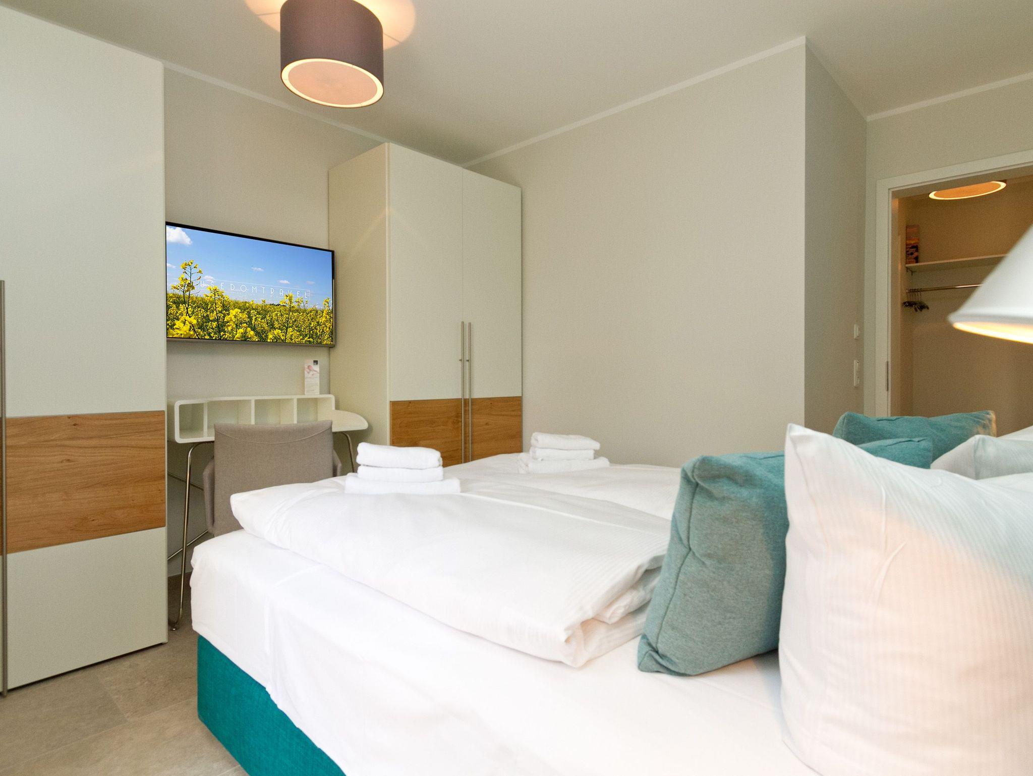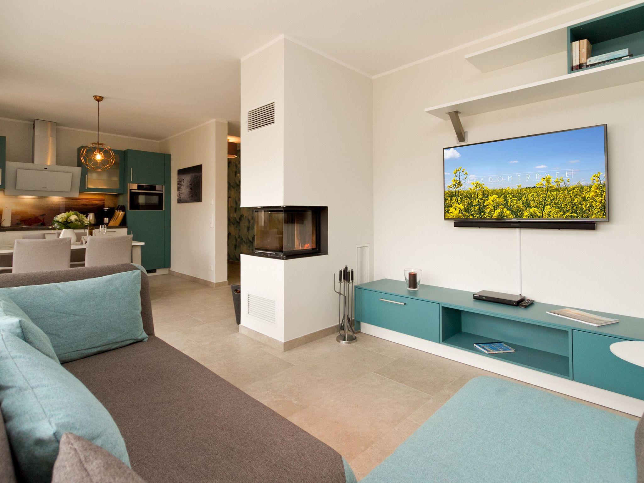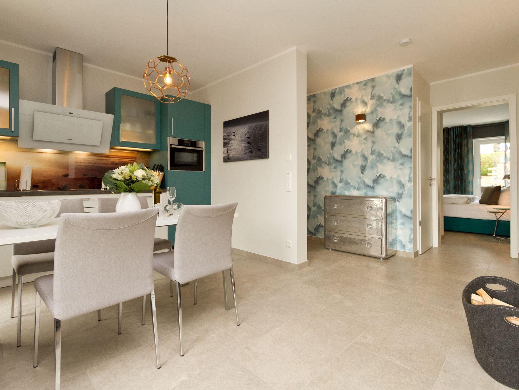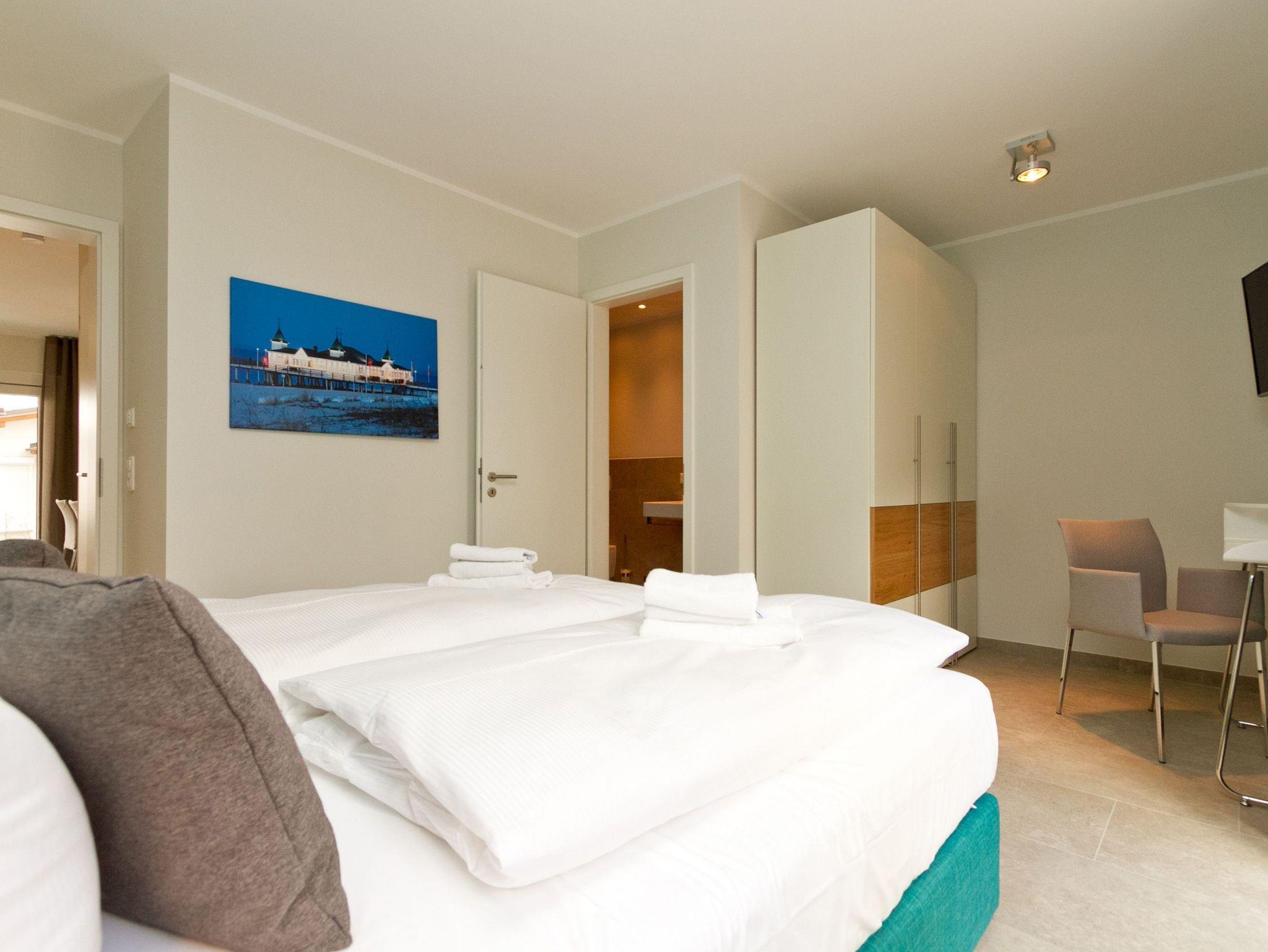 Hell, offen und luftig ist das Ferienappartement 01 in dem wunderschönen Neubau des Quartier Ahlbeck. Modernes Design mit einem ausgewählten Farbkonzept aus hellen Tönen kombiniert mit an das Grün der Insel und das Blau der Ostsee anlehnende Töne geben diesem Feriendomizil einen ganz eigenes Flair. Eine 3-Zimmer-Wohlfühlwelt auf 80 Quadratmetern erwartet Sie hier. Genug Platz für 4 Personen und 1 Kleinkind ( bis 3 Jahre im Kinderreisebett). Die Einrichtung ist elegant und komfortabel. Highlight des großen, offenen Wohn-Ess-Zimmers ist ein von drei Seiten sichtbarer Kamin. Romantisch und urgemütlich, wenn es draußen einmal nicht so schön ist. Ob Flat-TV im Wohnzimmer oder sämtliche hochwertigen Küchengeräte ? in diesem Appartement ist alles auf dem neuesten Stand. Lassen Sie sich in die bequeme Wohnlandschaft fallen, geben Sie sich am schönen Esstisch kulinarischen Köstlichkeiten hin oder genießen Sie auf der, vom Wohnzimmer aus begehbaren Südterrasse die herrliche Usedomer Sonne. Wahrhaft erholsam sind auch die Boxspringdoppelbetten (1,80 m x 2,00 m und 1,60 m x 2,00 m) in den beiden Schlafzimmern. Hier gibt es außerdem viel Ablagefläche für die Urlaubsgarderobe. In einem der Schlafzimmer steht sogar ein kleiner Sekretär. Die beiden Bäder sind mit geräumigen Echtglasduschen, unter denen man auch locker zu zweit seinen Spaß haben könnte, Doppelwaschtischen und WC ausgestattet. Eines der beiden Bäder besitzt darüber hinaus eine Waschmaschine mit Trockner und etwas ganz Besonderes: Eine finnische Sauna. Für einen rundum sorglosen Urlaub in diesem kleinen Paradies sind die Betten bezogen und Handtücher liegen für Sie bereit. Für Ihr Auto steht Ihnen ein Stellplatz am Haus zur Verfügung.