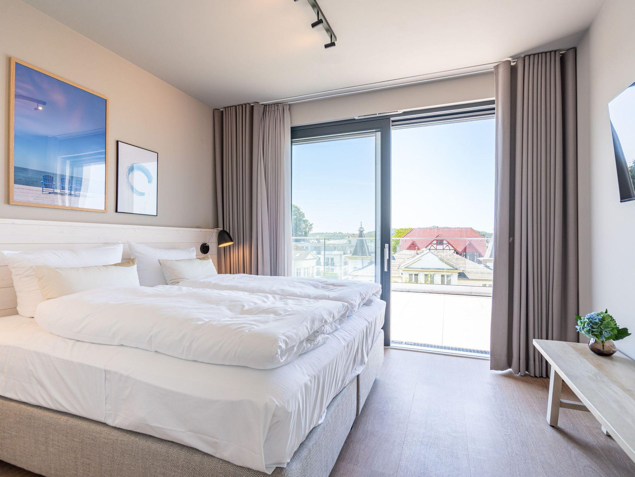 Träume ich? Das werden Sie sich fragen, wenn Sie auf dem Nord-Westbalkon des 2-Raum-Appartements B 4.7 in der 4. Etage der Strandterrasse über die Ostsee bis zum Horizont schauen. Nein! Dieser Ausblick ist Realität. Blau macht glücklich. Dieser Anblick erst recht! Bis zu zwei Gäste werden sich in den großzügigen 62 Quadratmetern dieses Urlaubstraums so wohl fühlen, dass sie sich in die charmante Ferienwohnung glatt verlieben. Ein schönes Wohn-Esszimmer bietet allen Komfort, den man sich für eine entspannte Auszeit nur wünschen kann. Das Interieur wurde mit viel Liebe eingerichtet und sorgt für eine gemütliche Atmosphäre. Dazu ist die Wohnung mit allen modernen Annehmlichkeiten ausgestattet. So zum Beispiel einer hochwertigen Küche mit Siemens-Elektrogeräten. Dazu zählen ein Backofen, ein 3-Platten-Induktionsherd sowie eine Nespresso-Kapselmaschine. Ein kuscheliges Sofa ist eine bequeme Ruhezone. Ob beim Träumen vor dem Elektrokamin (ohne Wärmeabgabe) oder beim Streamen eines spannenden Films auf dem großen Flat-TV (50 Zoll) ? hier kommen Sie auf alle Fälle runter und können neue Energie tanken. Ein großer Balkon lädt zum ausgiebigen Sonnenbaden auf den Liegen oder zum Essen unter freiem Himmel ein. Hier lässt es sich an sonnigen Tagen ? und von denen hat Usedom sehr, sehr viele zu bieten ? bestens aushalten. Lassen Sie den Blick über die Ostsee und die Dächer des Seebades schweifen. Genauso harmonisch wie das Wohnzimmer ist auch das Schlafzimmer eingerichtet. Ein komfortables Boxspringdoppelbett (1,80m x 2,00m), ein geräumiger Kleiderschrank und ein weiterer Flat-TV (43 Zoll) gehören hier zur Ausstattung. Der Zugang zur Dachterrasse ermöglicht es Ihnen, morgens von der frischen Meeresluft geweckt zu werden und den Tag mit einem atemberaubenden Blick zu beginnen. Das moderne Tageslicht-Badezimmer verfügt über eine Dusche, einen Waschtisch und ein WC. Damit Sie schon entspannt im Urlaubsziel ankommen, steht Ihnen in der Tiefgarage ein PKW-Stellplatz zur Verfügung. Dann kann es also losgehen mit der Zeit, in der Sie Hektik und Stress gegen Entschleunigung und Entspannung eintauschen.