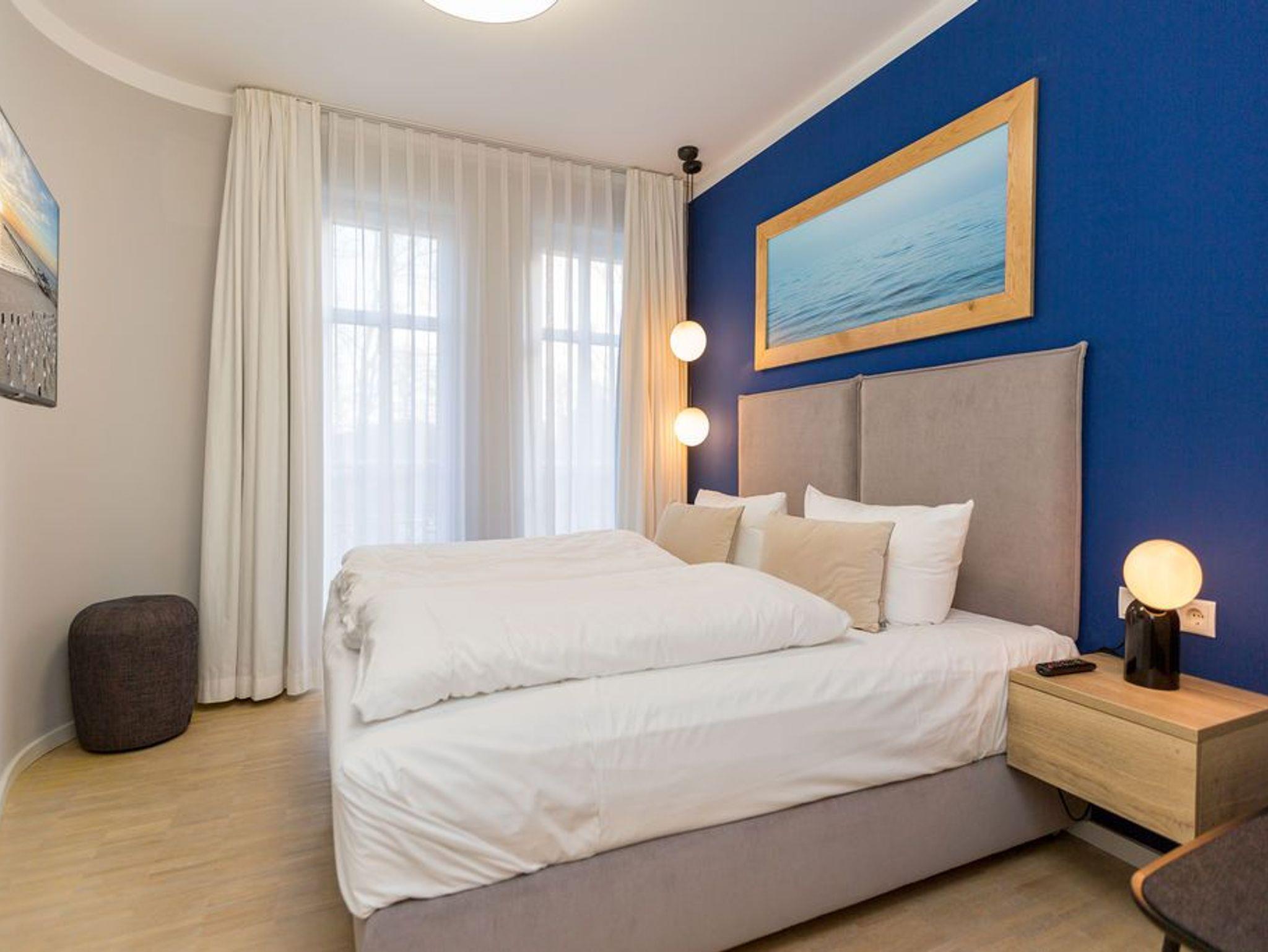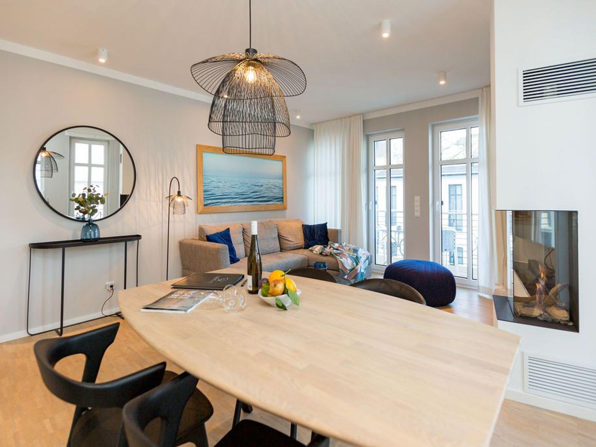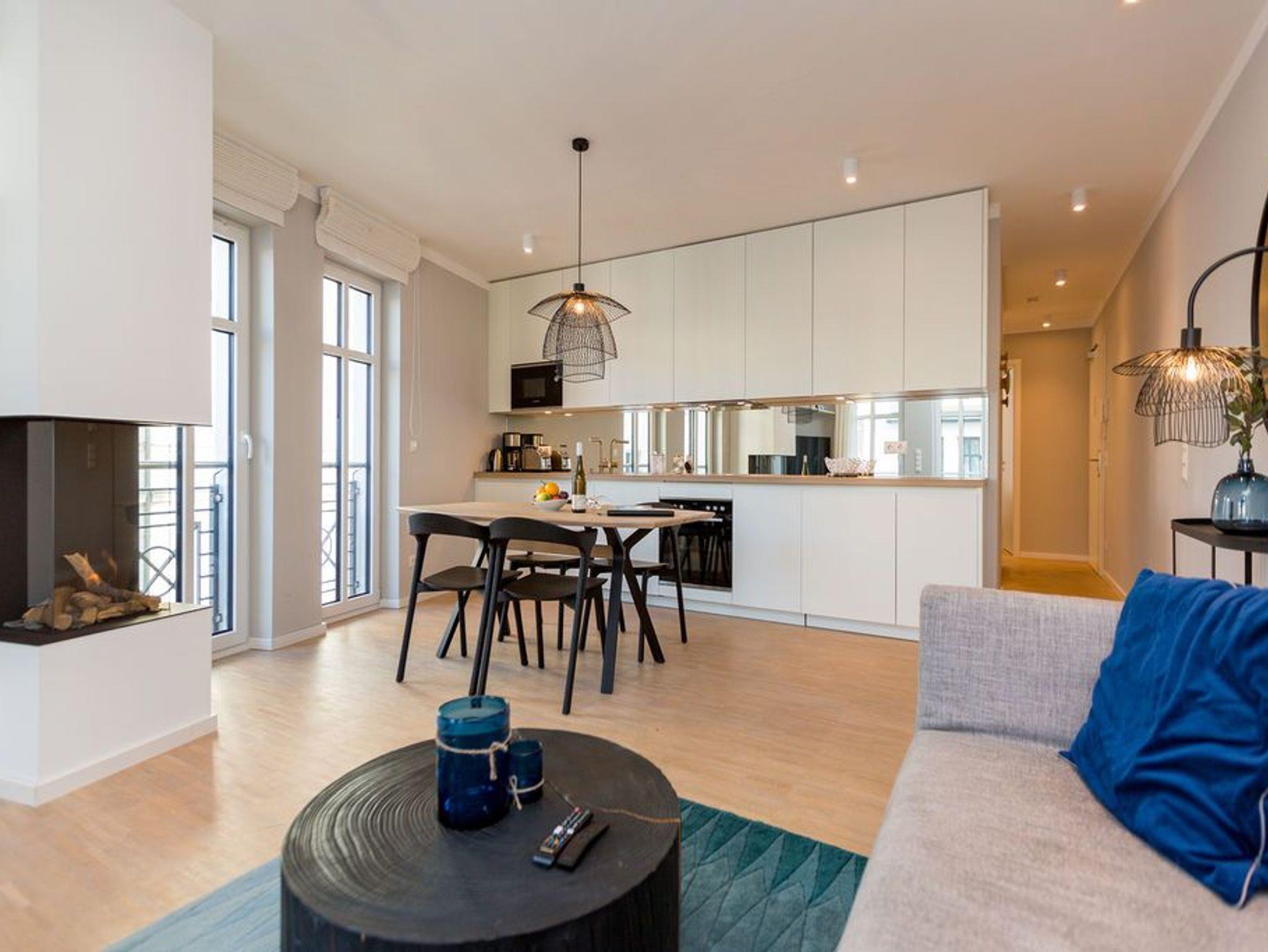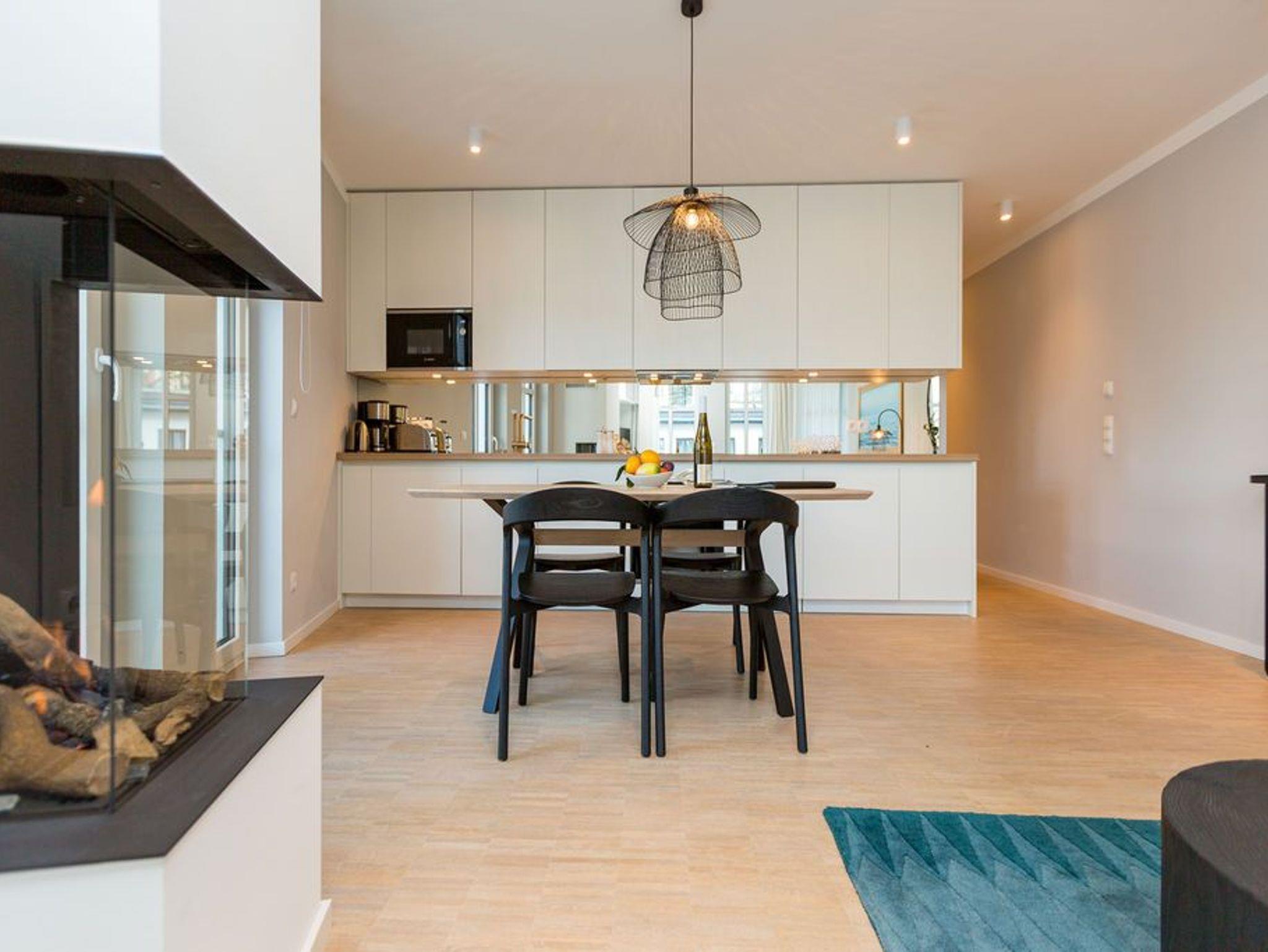 Die Räume - lichtdurchflutet, das Design - nordisch nobel: Für jeden, der ein geschmack- und stilvolles Urlaubszuhause an der Ostsee sucht, ist das Appartement Nummer 4 im ersten Obergeschoss genau das Richtige. Eine 74 Quadratmeter große Wohlfühlzone verteilt auf drei Zimmer wartet nur darauf, vier Urlaubssehnsüchtigen und einem Kleinkind bis zwei Jahre (im Kinderreisebett) ein unvergleichlich schönes und stylisches Domizil zu sein. Ein großes und geräumiges Wohnzimmer mit offener Küche, zwei Schlafzimmer, zwei Bädern und auch zwei Balkonen - da bleiben keine Urlaubswohnträume unerfüllt. Eine komfortable Sofalandschaft empfängt Auszeithungrige. Entspannen Sie vor dem Flammenspiel des 3-D-Gaskamins oder beim Schauen eines spannenden Films auf dem Flat-TV. Alles ist hell und freundlich. Der Design-Esstisch mit den Design-Stühlen lädt zum Schlemmen und gemeinsamen Zusammensitzen ein. Die dazu gehörige Küche ist mit hochwertigen Geräten der Marke Bosch voll ausgestattet. Induktionsherd, Mikrowelle, Geschirrspüler - alles Highend. Auch Geschirr ist in den Küchenschränken zu finden. Das Wohnzimmer hat einen Zugang zu einem der beiden Balkone in Richtung Nord-West. Wenn das Wetter es zulässt - was auf Usedom recht häufig der Fall ist - können Sie auch hier an den Gartenmöbeln entspannt dinieren. Der zweite Balkon in Richtung Süd-Ost ist von einem der beiden gemütlichen Schlafzimmer aus zugänglich. Maritimes Flair strahlen die beiden Zimmer aus. Je ein komfortables Boxspringdoppelbett (1,60 m x 2,00 m und 1,80 m x 2,00 m) schenkt erholsame Stunden. Jedes Schlafzimmer verfügt über einen Flat-TV und einen geräumigen Kleiderschrank. Das Master-Bad besitzt neben einer Dusche, Waschtisch und WC ein kleines Highlight. Eine Finnische Sauna heizt Ihnen an kühlen Tagen ordentlich ein. Das zweite Badezimmer hat ebenfalls eine Dusche, Waschtisch und WC. Wunderschöne Vintage-Fliesen geben ihm ein exklusives Ambiente. Zur Ausstattung der Wohnung gehört zudem ein Voll-Waschtrockner dazu. Um Handtücher oder das Beziehen der Betten, brauchen Sie sich nicht zu kümmern. Alles ist für Sie bei Anreise vorbereitet. Der Stellplatz Nummer 4 in der Tiefgarage ist für Sie reserviert.