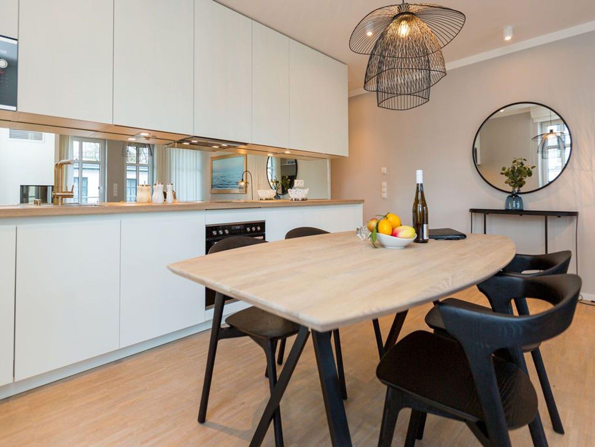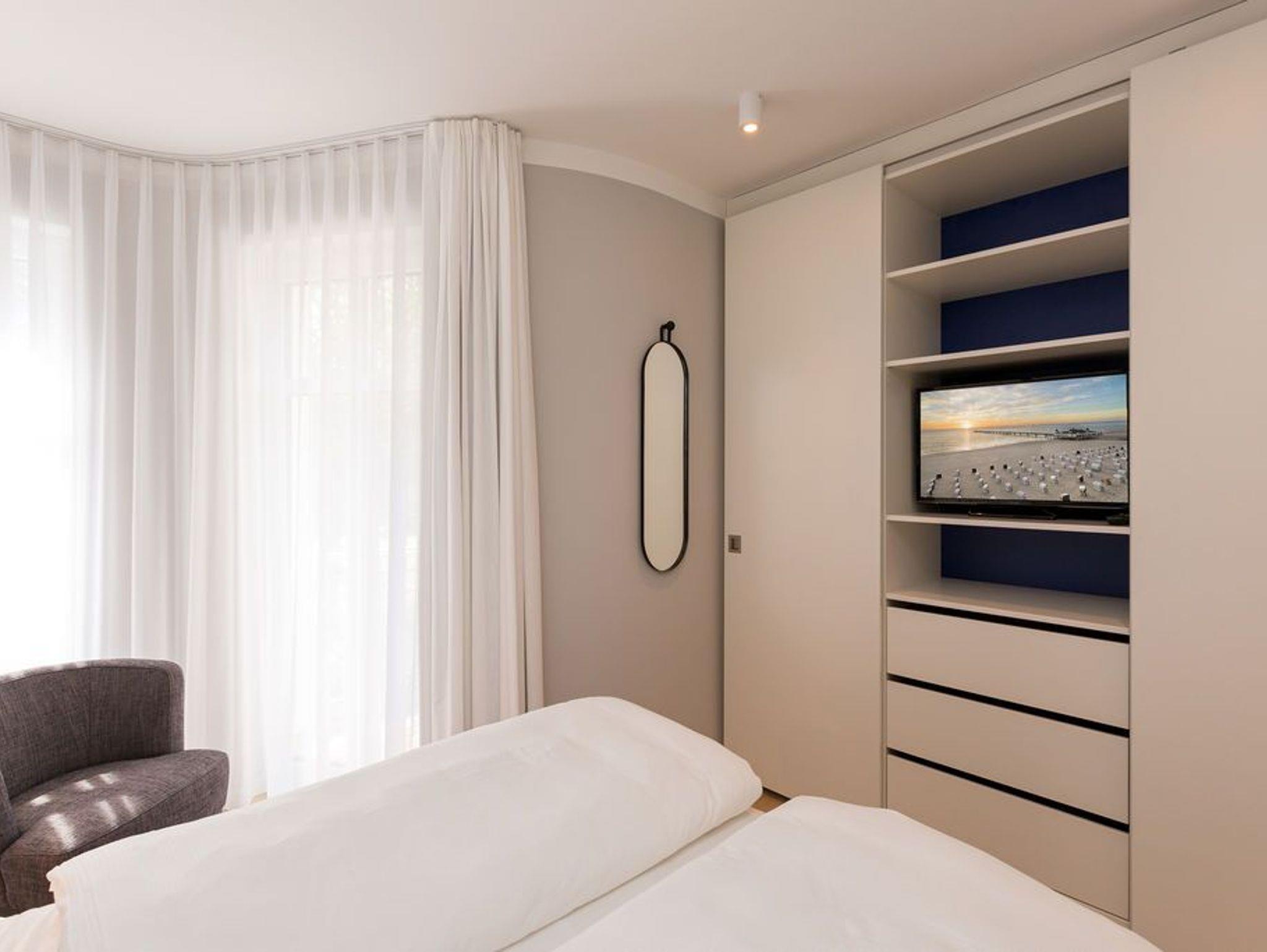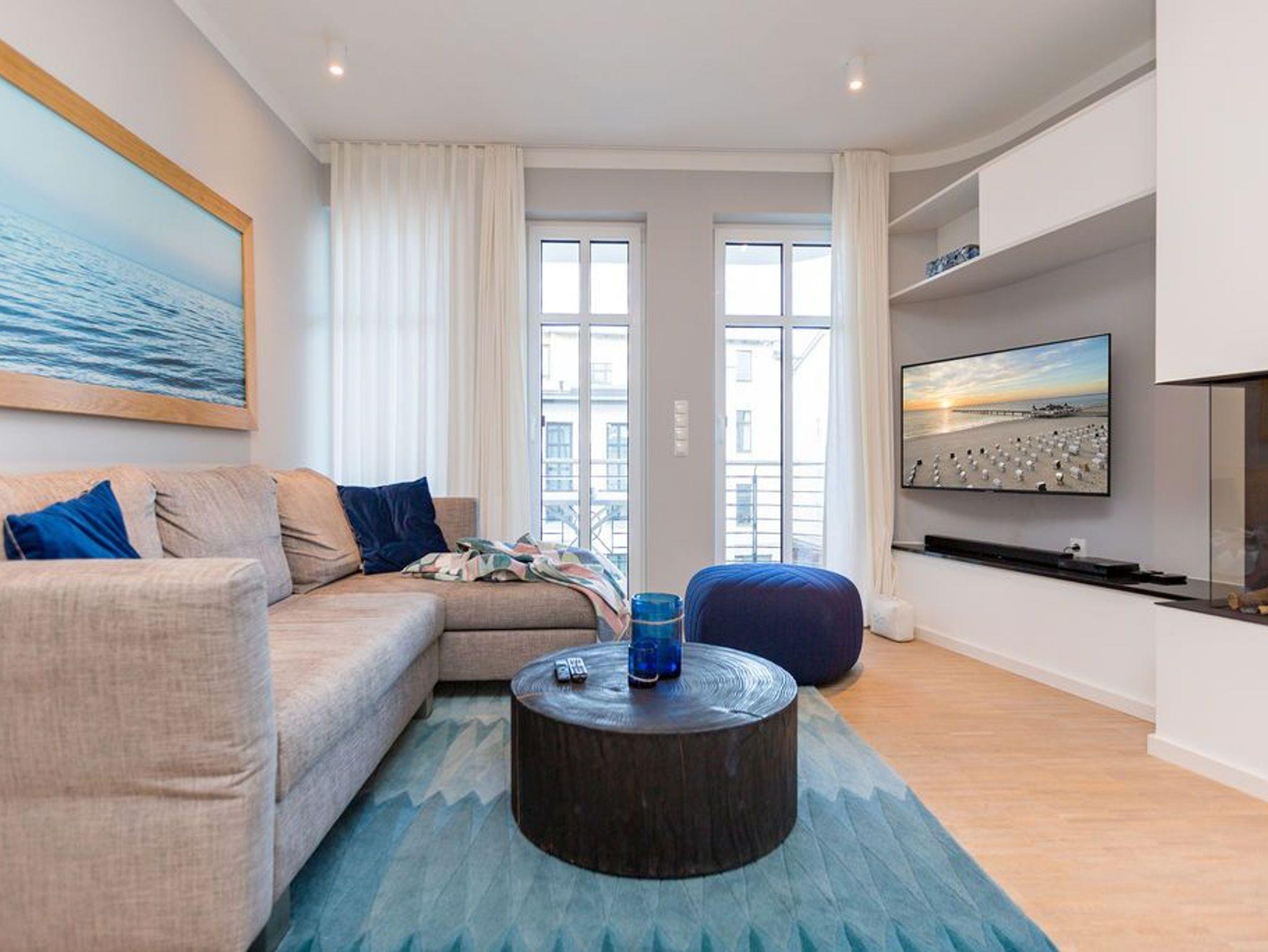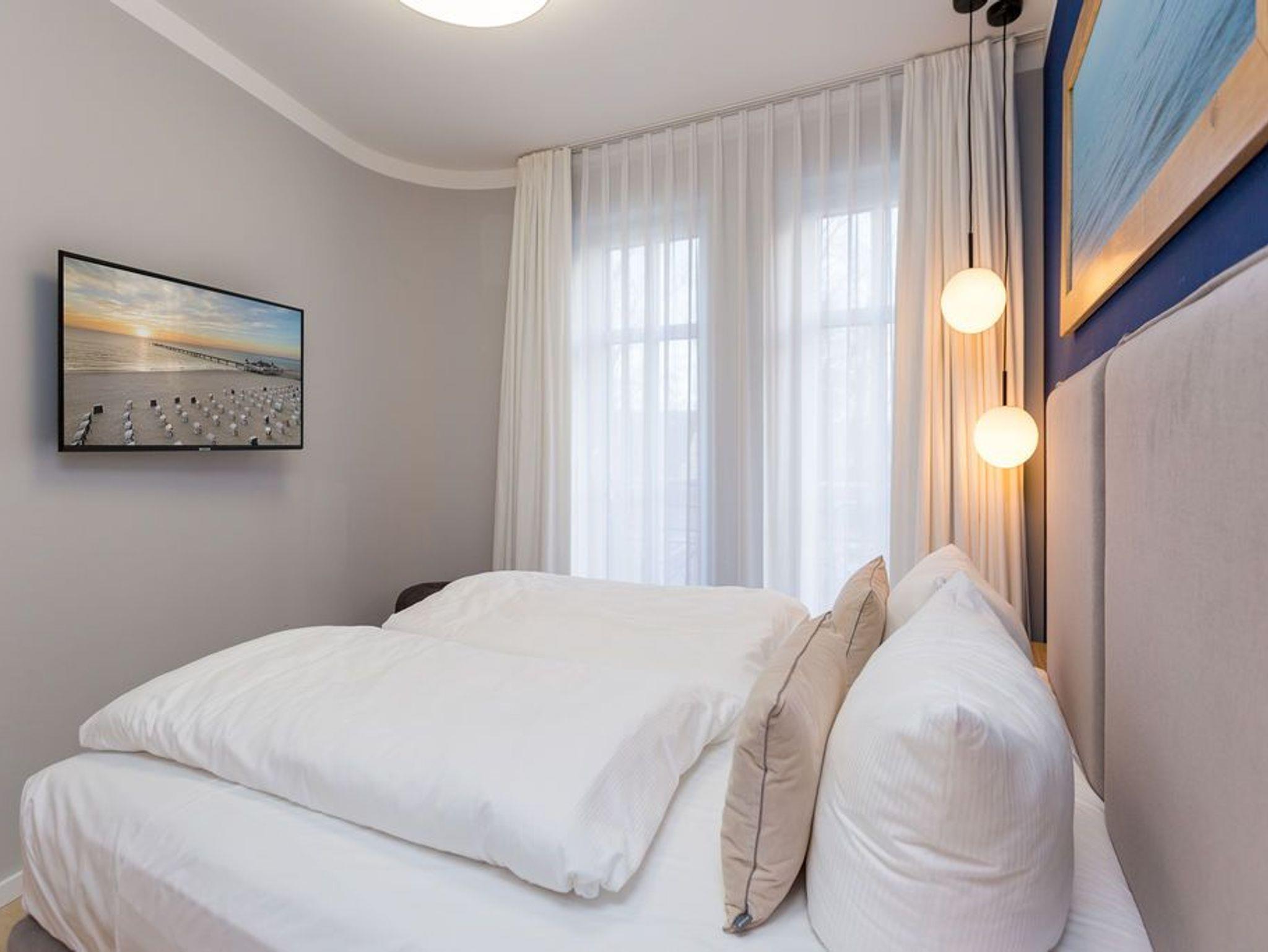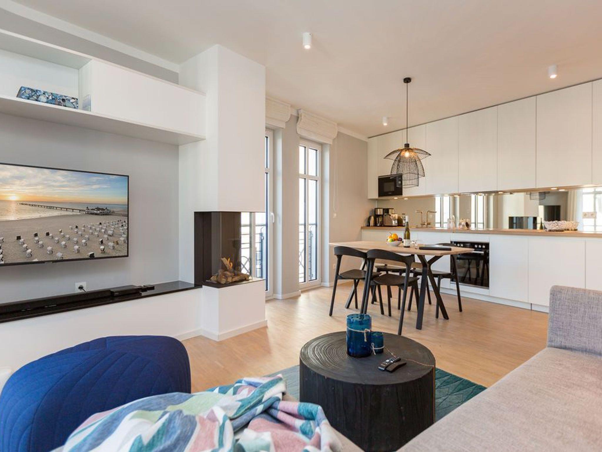 Die Räume - lichtdurchflutet, das Design - nordisch nobel: Für jeden, der ein geschmack- und stilvolles Urlaubszuhause an der Ostsee sucht, ist das Appartement Nummer 4 im ersten Obergeschoss genau das Richtige. Eine 74 Quadratmeter große Wohlfühlzone verteilt auf drei Zimmer wartet nur darauf, vier Urlaubssehnsüchtigen und einem Kleinkind bis zwei Jahre (im Kinderreisebett) ein unvergleichlich schönes und stylisches Domizil zu sein. Ein großes und geräumiges Wohnzimmer mit offener Küche, zwei Schlafzimmer, zwei Bädern und auch zwei Balkonen - da bleiben keine Urlaubswohnträume unerfüllt. Eine komfortable Sofalandschaft empfängt Auszeithungrige. Entspannen Sie vor dem Flammenspiel des 3-D-Gaskamins oder beim Schauen eines spannenden Films auf dem Flat-TV. Alles ist hell und freundlich. Der Design-Esstisch mit den Design-Stühlen lädt zum Schlemmen und gemeinsamen Zusammensitzen ein. Die dazu gehörige Küche ist mit hochwertigen Geräten der Marke Bosch voll ausgestattet. Induktionsherd, Mikrowelle, Geschirrspüler - alles Highend. Auch Geschirr ist in den Küchenschränken zu finden. Das Wohnzimmer hat einen Zugang zu einem der beiden Balkone in Richtung Nord-West. Wenn das Wetter es zulässt - was auf Usedom recht häufig der Fall ist - können Sie auch hier an den Gartenmöbeln entspannt dinieren. Der zweite Balkon in Richtung Süd-Ost ist von einem der beiden gemütlichen Schlafzimmer aus zugänglich. Maritimes Flair strahlen die beiden Zimmer aus. Je ein komfortables Boxspringdoppelbett (1,60 m x 2,00 m und 1,80 m x 2,00 m) schenkt erholsame Stunden. Jedes Schlafzimmer verfügt über einen Flat-TV und einen geräumigen Kleiderschrank. Das Master-Bad besitzt neben einer Dusche, Waschtisch und WC ein kleines Highlight. Eine Finnische Sauna heizt Ihnen an kühlen Tagen ordentlich ein. Das zweite Badezimmer hat ebenfalls eine Dusche, Waschtisch und WC. Wunderschöne Vintage-Fliesen geben ihm ein exklusives Ambiente. Zur Ausstattung der Wohnung gehört zudem ein Voll-Waschtrockner dazu. Um Handtücher oder das Beziehen der Betten, brauchen Sie sich nicht zu kümmern. Alles ist für Sie bei Anreise vorbereitet. Der Stellplatz Nummer 4 in der Tiefgarage ist für Sie reserviert.