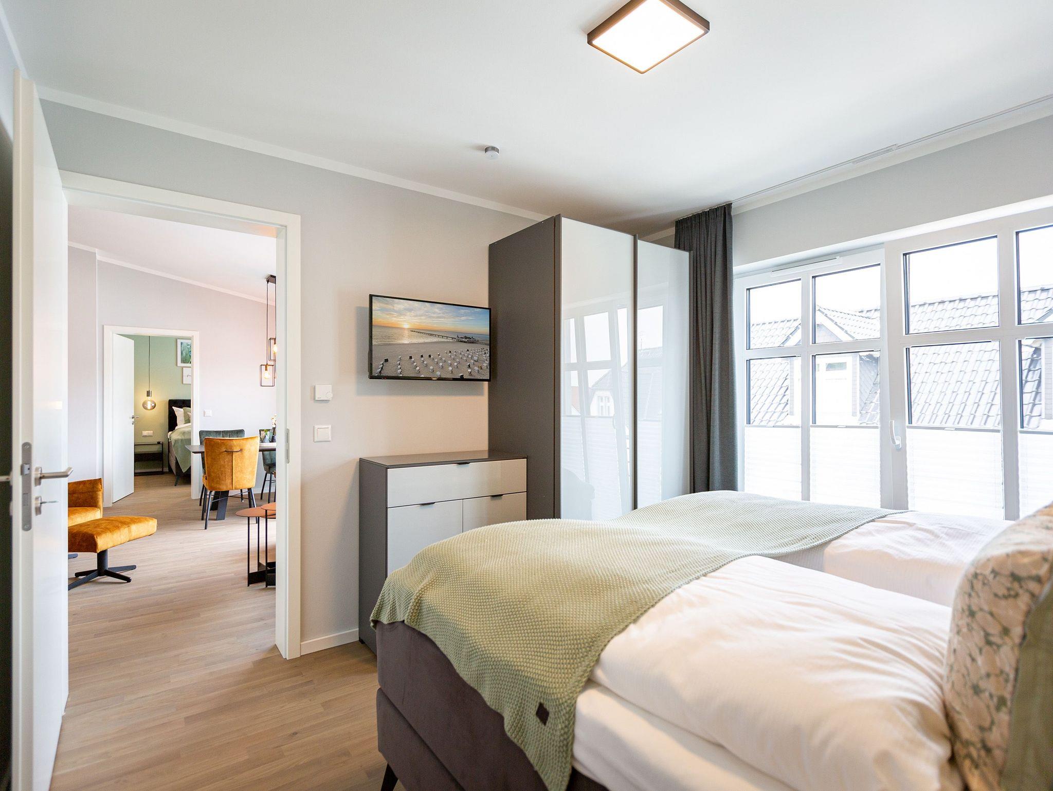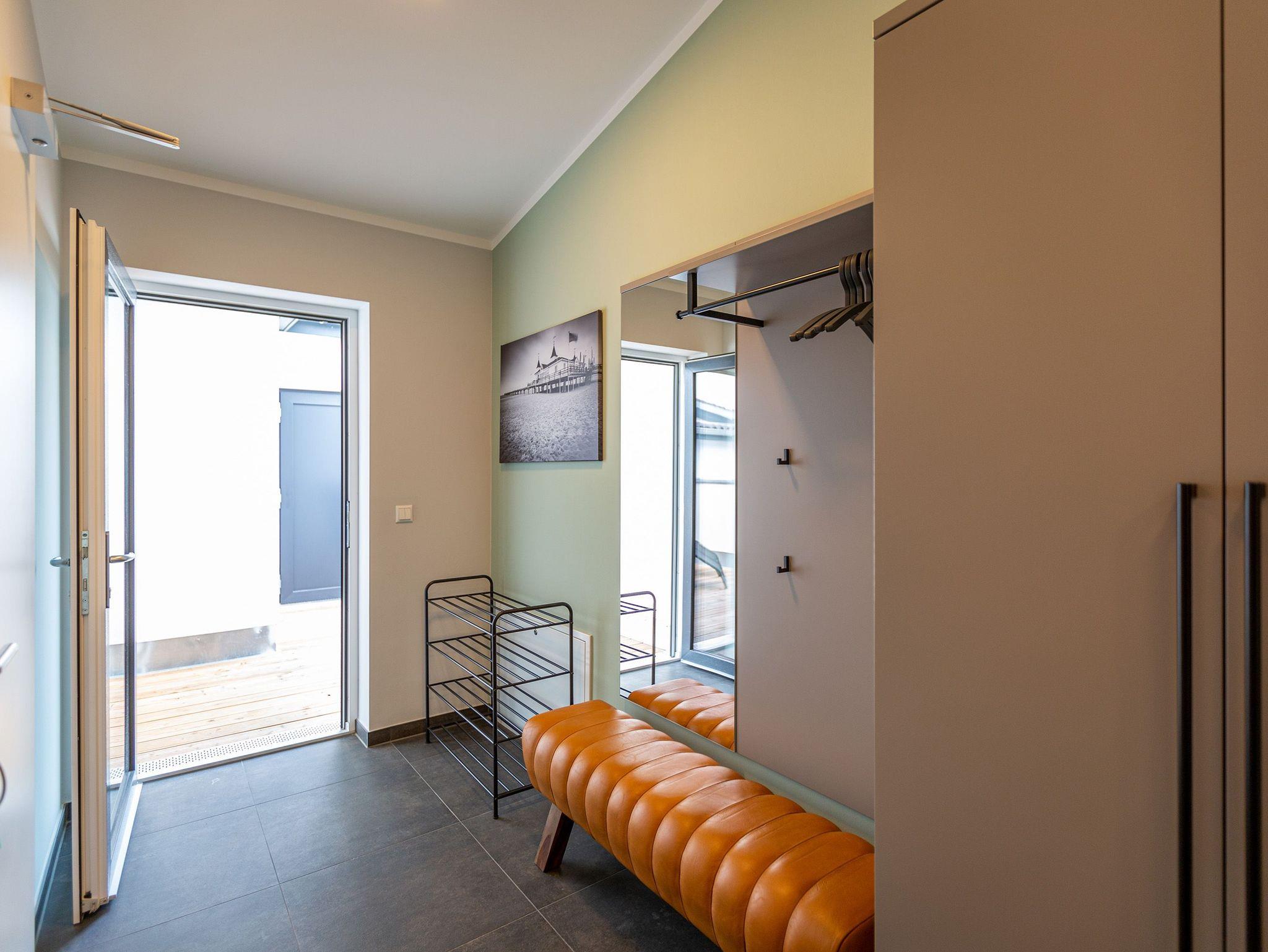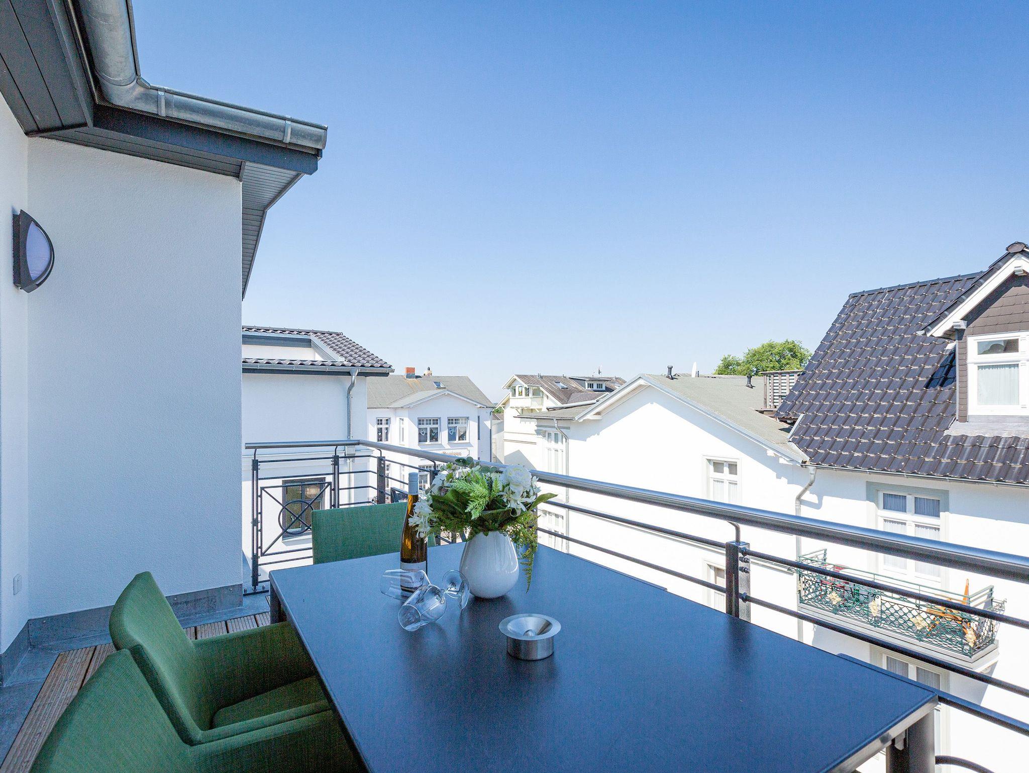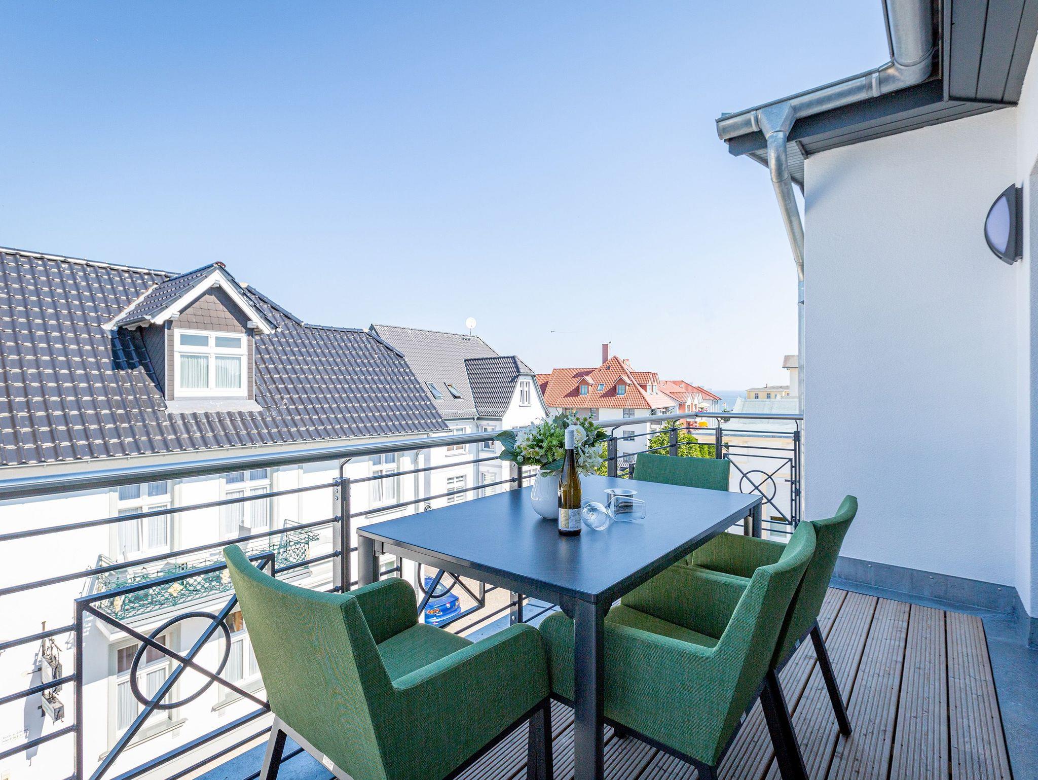Das Appartement 11 unter dem Dach des Quartiers ist mit seinen 83 luftig hellen Quadratmetern etwas ganz Besonderes. Drei Zimmer für bis zu vier Personen und ein Kleinkind (im Kinderreisebett) finden hier Platz und Ruhe für eine entspannte Ostseezeit. Viel Gemütlichkeit und wohliger Komfort erwartet die Bewohner auf Zeit. Pastelltöne, modernes Design und Wohnkomfort gehen in dieser Wohnung Hand in Hand. Ein geräumiges Wohn-Esszimmer weiß, mit bequemen Möbeln in den richtigen Urlaubsmodus zu versetzen. Eine Sofa-Sessellandschaft, ein Flat-TV, ein schöner, großer Esstisch ? alles ist erlesen und ausgewählt. Ein Balkon lädt bei schönem Wetter dazu ein, viel Zeit an der frischen Seeluft zu verbringen - von hier aus hat man einen seitlichen Blick auf die Ostsee und auf die Ahlbecker Seebrücke. Die offene Küche ist voll ausgestattet, verfügt über einen Induktionsherd mit den passenden Töpfen, eine Spülmaschine, einen Toaster, eine Kaffeemaschine und Geschirr. Auch eine Waschmaschine ist vorhanden. Zwei Schlafzimmer laden mit ihren großen Boxspringdoppelbetten (1,80 m x 2,00 m) zum Kuscheln und Träumen ein. Jedes Schlafzimmer hat einen Schrank, eine Kommode und einen Flat-TV. Zwei Bäder mit Dusche und WC sorgen für entspannte Badzeiten. Handtücher liegen bereit und die Betten sind bei Anreise bereits bezogen. Freuen Sie sich dann noch auf einen Extra-Clou. Denn die Wohnung verfügt über eine wunderschöne Dachterrasse mit Sonnenliegen. Hier lässt sich ein Sommertag relaxed angehen. Zudem befindet sich auf der Terrasse der Zugang zu einer Sauna. Ihr kleiner Private SPA verfügt über eine Außendusche. So können Sie direkt aus der Wärme unter das kühle Nass springen. In der Tiefgarage gibt es für Ihr Auto 2 Stellplätze hintereinander und einen separaten Fahrradraum. Das WLAN ist kostenfrei nutzbar.