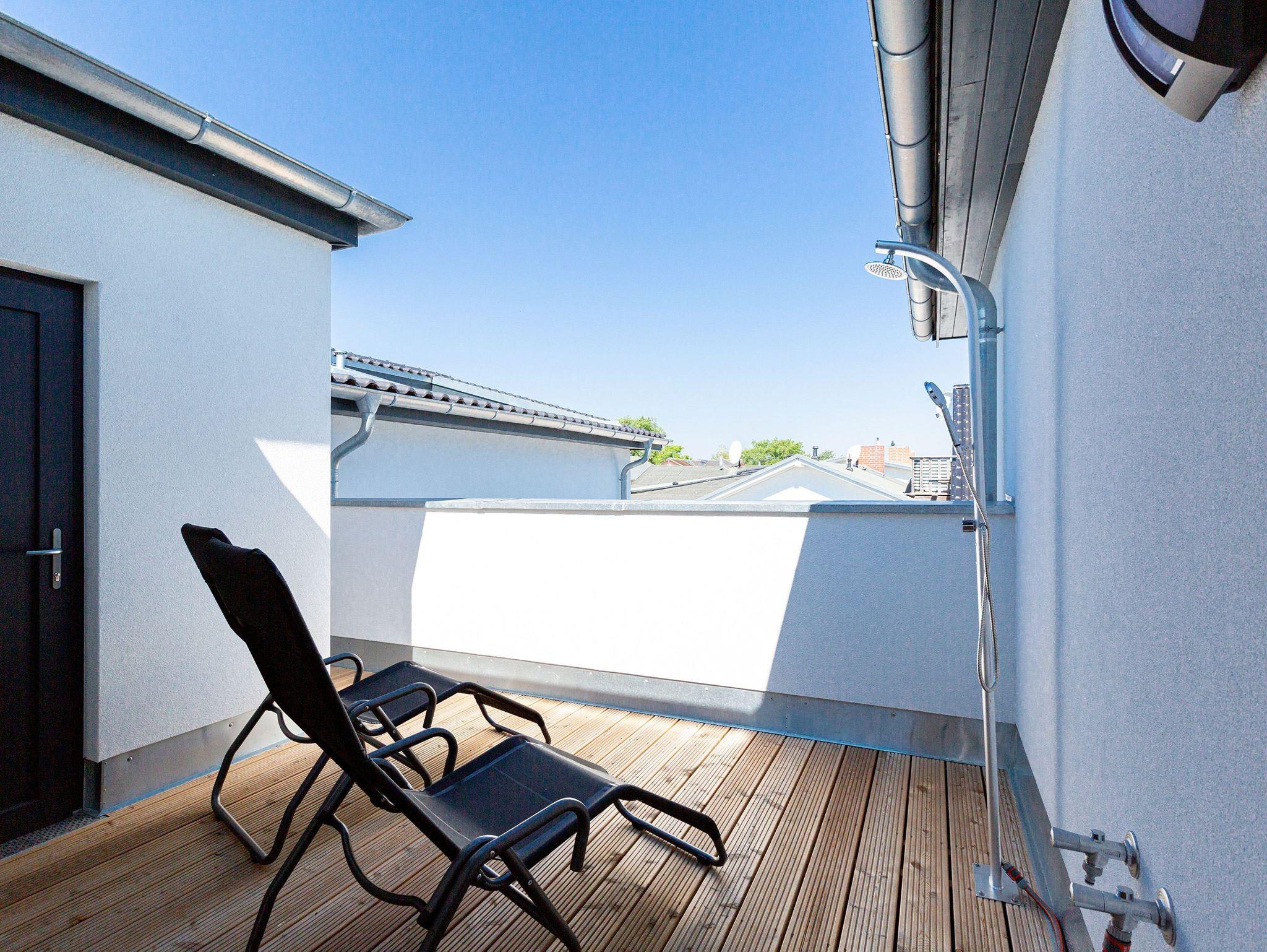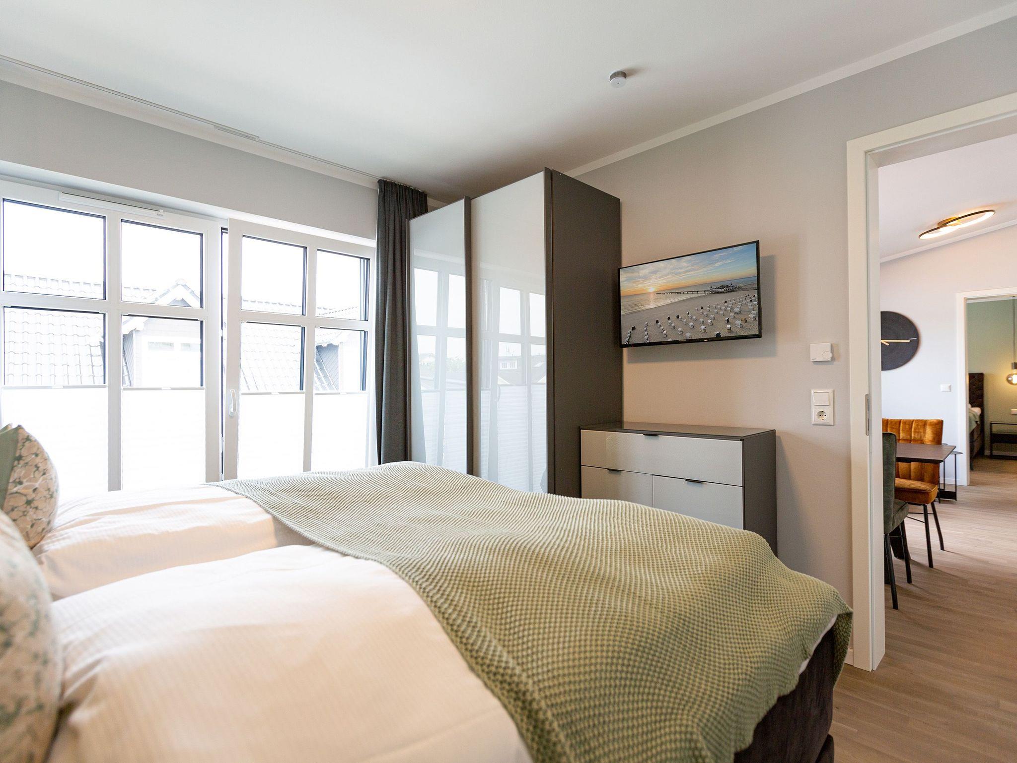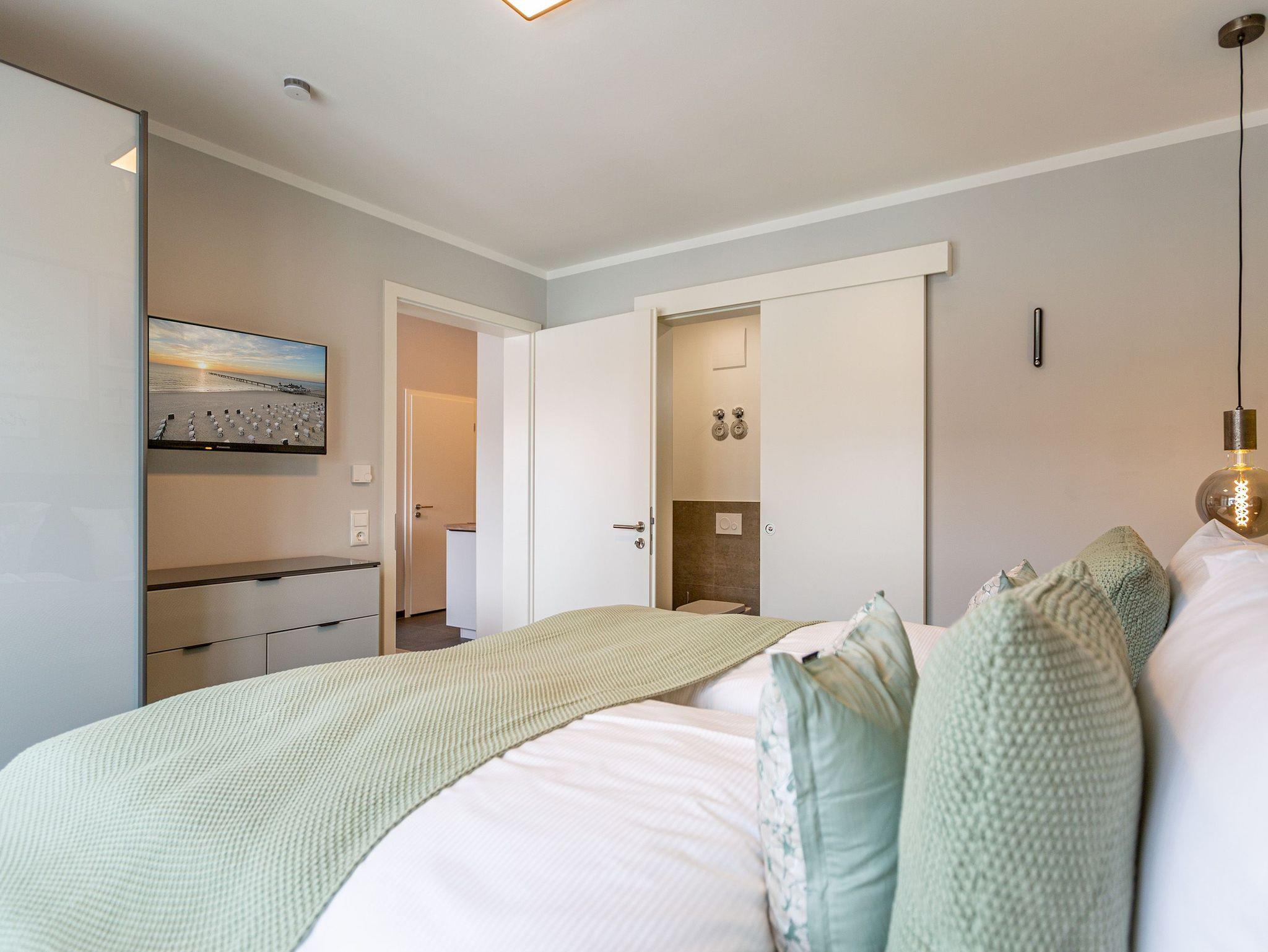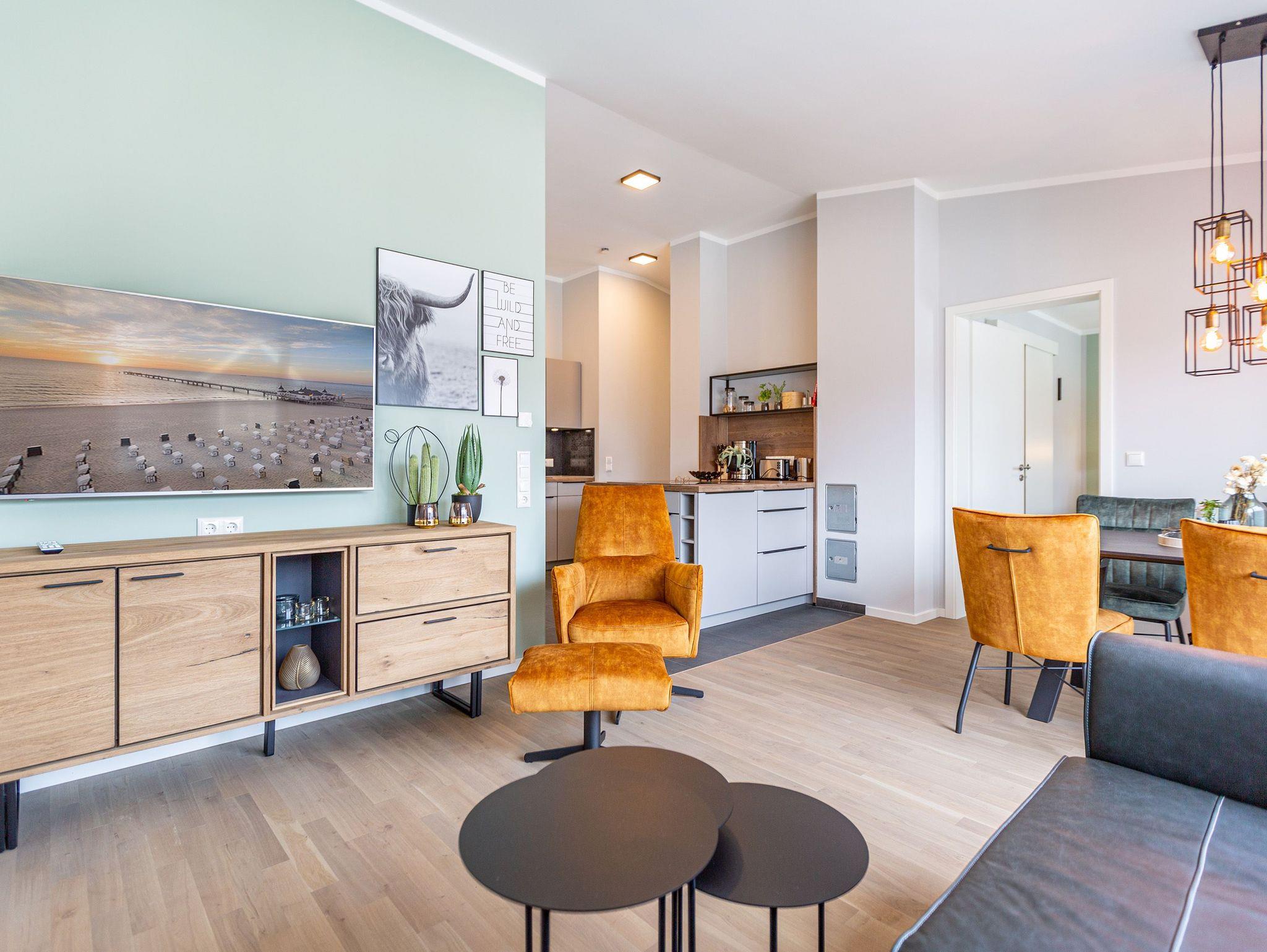 Das Appartement 11 unter dem Dach des Quartiers ist mit seinen 83 luftig hellen Quadratmetern etwas ganz Besonderes. Drei Zimmer für bis zu vier Personen und ein Kleinkind (im Kinderreisebett) finden hier Platz und Ruhe für eine entspannte Ostseezeit. Viel Gemütlichkeit und wohliger Komfort erwartet die Bewohner auf Zeit. Pastelltöne, modernes Design und Wohnkomfort gehen in dieser Wohnung Hand in Hand. Ein geräumiges Wohn-Esszimmer weiß, mit bequemen Möbeln in den richtigen Urlaubsmodus zu versetzen. Eine Sofa-Sessellandschaft, ein Flat-TV, ein schöner, großer Esstisch ? alles ist erlesen und ausgewählt. Ein Balkon lädt bei schönem Wetter dazu ein, viel Zeit an der frischen Seeluft zu verbringen - von hier aus hat man einen seitlichen Blick auf die Ostsee und auf die Ahlbecker Seebrücke. Die offene Küche ist voll ausgestattet, verfügt über einen Induktionsherd mit den passenden Töpfen, eine Spülmaschine, einen Toaster, eine Kaffeemaschine und Geschirr. Auch eine Waschmaschine ist vorhanden. Zwei Schlafzimmer laden mit ihren großen Boxspringdoppelbetten (1,80 m x 2,00 m) zum Kuscheln und Träumen ein. Jedes Schlafzimmer hat einen Schrank, eine Kommode und einen Flat-TV. Zwei Bäder mit Dusche und WC sorgen für entspannte Badzeiten. Handtücher liegen bereit und die Betten sind bei Anreise bereits bezogen. Freuen Sie sich dann noch auf einen Extra-Clou. Denn die Wohnung verfügt über eine wunderschöne Dachterrasse mit Sonnenliegen. Hier lässt sich ein Sommertag relaxed angehen. Zudem befindet sich auf der Terrasse der Zugang zu einer Sauna. Ihr kleiner Private SPA verfügt über eine Außendusche. So können Sie direkt aus der Wärme unter das kühle Nass springen. In der Tiefgarage gibt es für Ihr Auto 2 Stellplätze hintereinander und einen separaten Fahrradraum. Das WLAN ist kostenfrei nutzbar.