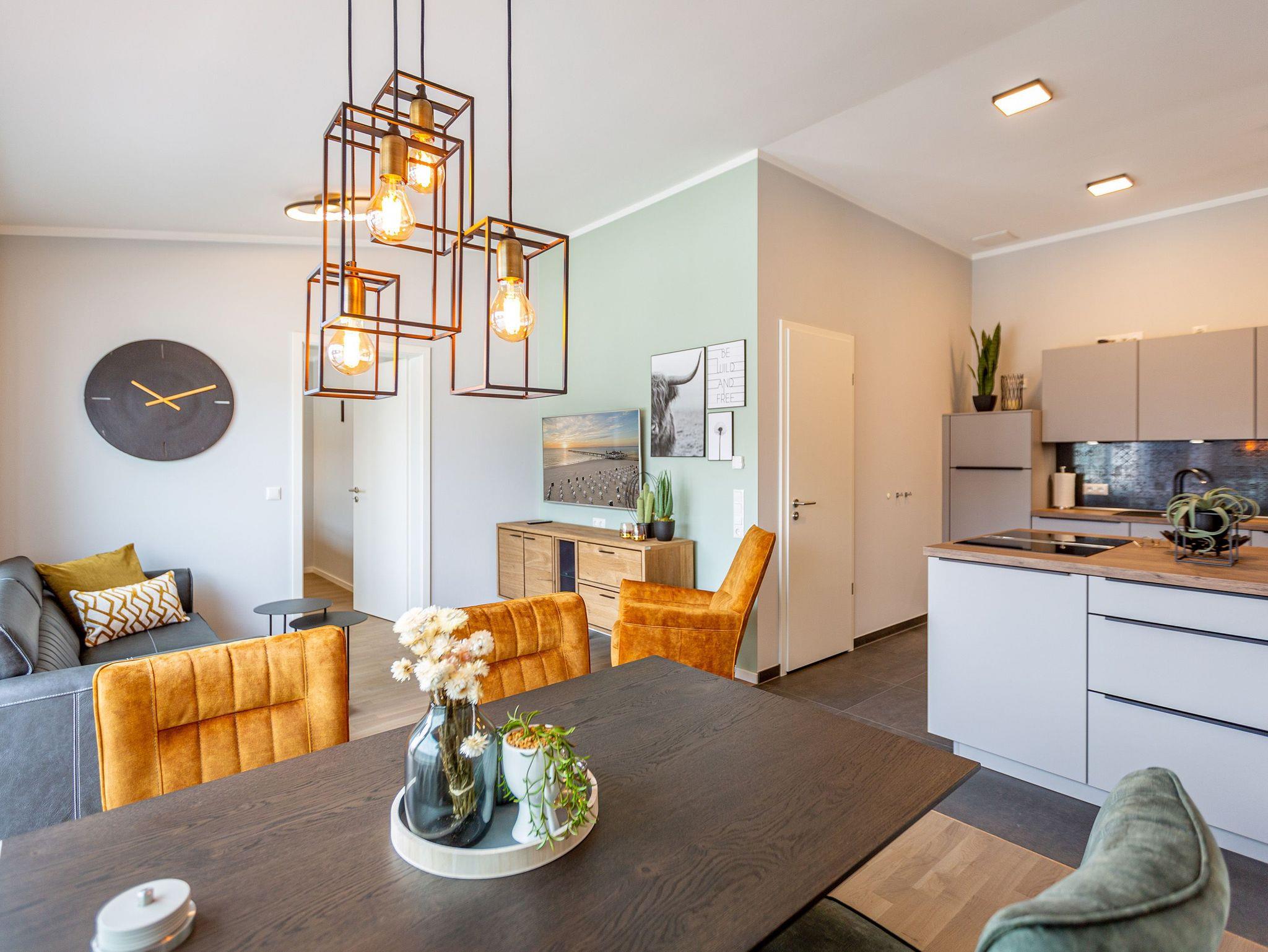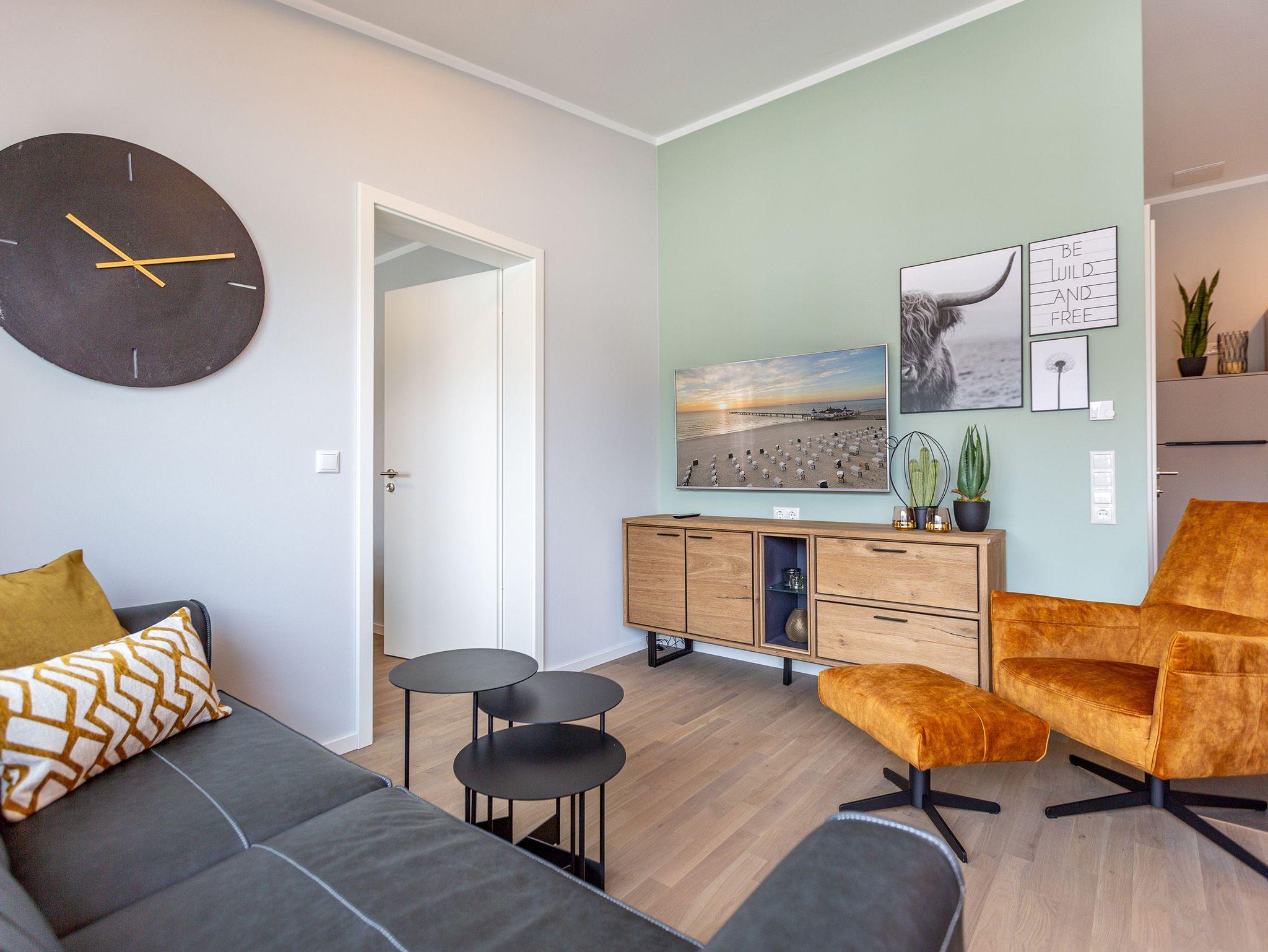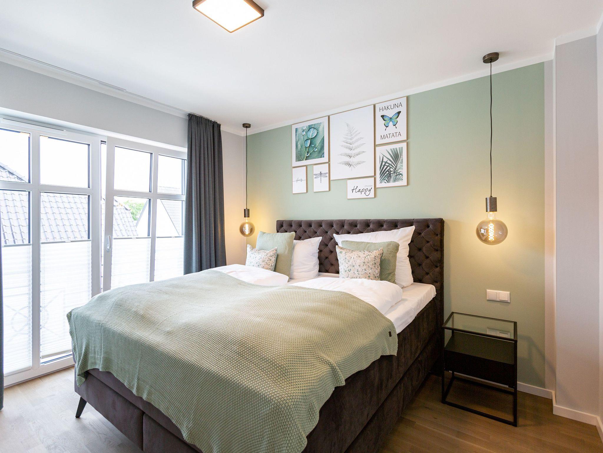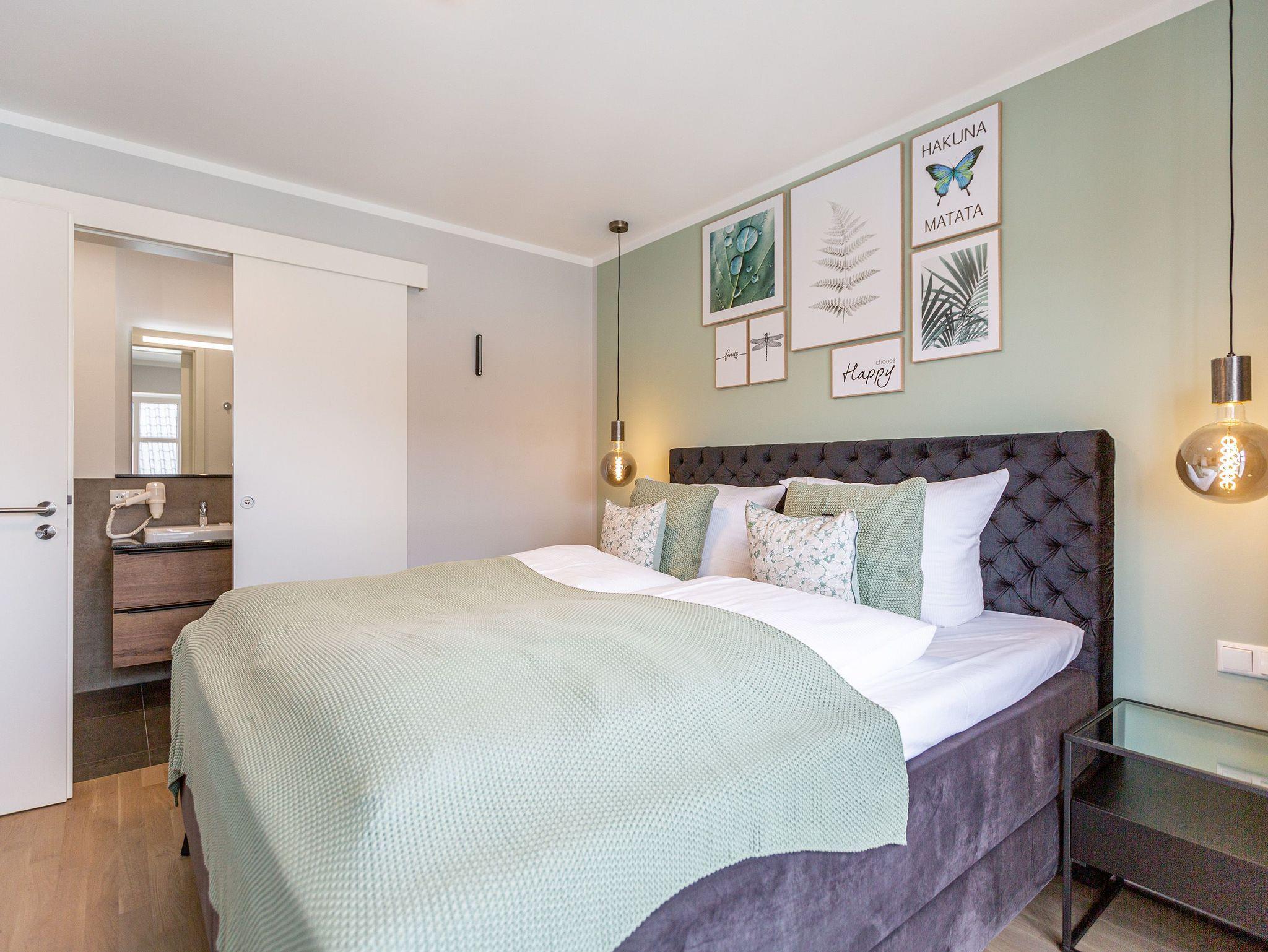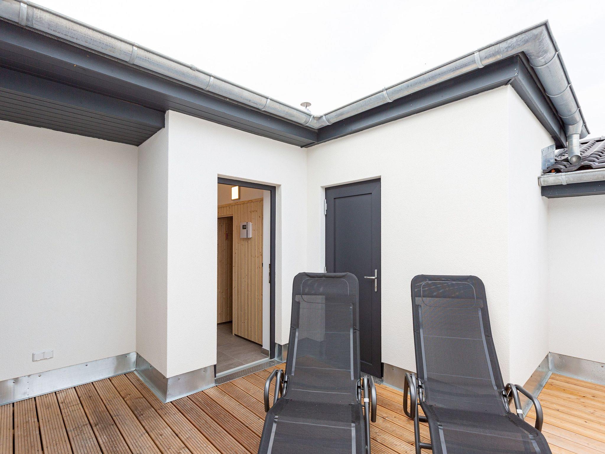 Das Appartement 11 unter dem Dach des Quartiers ist mit seinen 83 luftig hellen Quadratmetern etwas ganz Besonderes. Drei Zimmer für bis zu vier Personen und ein Kleinkind (im Kinderreisebett) finden hier Platz und Ruhe für eine entspannte Ostseezeit. Viel Gemütlichkeit und wohliger Komfort erwartet die Bewohner auf Zeit. Pastelltöne, modernes Design und Wohnkomfort gehen in dieser Wohnung Hand in Hand. Ein geräumiges Wohn-Esszimmer weiß, mit bequemen Möbeln in den richtigen Urlaubsmodus zu versetzen. Eine Sofa-Sessellandschaft, ein Flat-TV, ein schöner, großer Esstisch ? alles ist erlesen und ausgewählt. Ein Balkon lädt bei schönem Wetter dazu ein, viel Zeit an der frischen Seeluft zu verbringen - von hier aus hat man einen seitlichen Blick auf die Ostsee und auf die Ahlbecker Seebrücke. Die offene Küche ist voll ausgestattet, verfügt über einen Induktionsherd mit den passenden Töpfen, eine Spülmaschine, einen Toaster, eine Kaffeemaschine und Geschirr. Auch eine Waschmaschine ist vorhanden. Zwei Schlafzimmer laden mit ihren großen Boxspringdoppelbetten (1,80 m x 2,00 m) zum Kuscheln und Träumen ein. Jedes Schlafzimmer hat einen Schrank, eine Kommode und einen Flat-TV. Zwei Bäder mit Dusche und WC sorgen für entspannte Badzeiten. Handtücher liegen bereit und die Betten sind bei Anreise bereits bezogen. Freuen Sie sich dann noch auf einen Extra-Clou. Denn die Wohnung verfügt über eine wunderschöne Dachterrasse mit Sonnenliegen. Hier lässt sich ein Sommertag relaxed angehen. Zudem befindet sich auf der Terrasse der Zugang zu einer Sauna. Ihr kleiner Private SPA verfügt über eine Außendusche. So können Sie direkt aus der Wärme unter das kühle Nass springen. In der Tiefgarage gibt es für Ihr Auto 2 Stellplätze hintereinander und einen separaten Fahrradraum. Das WLAN ist kostenfrei nutzbar.