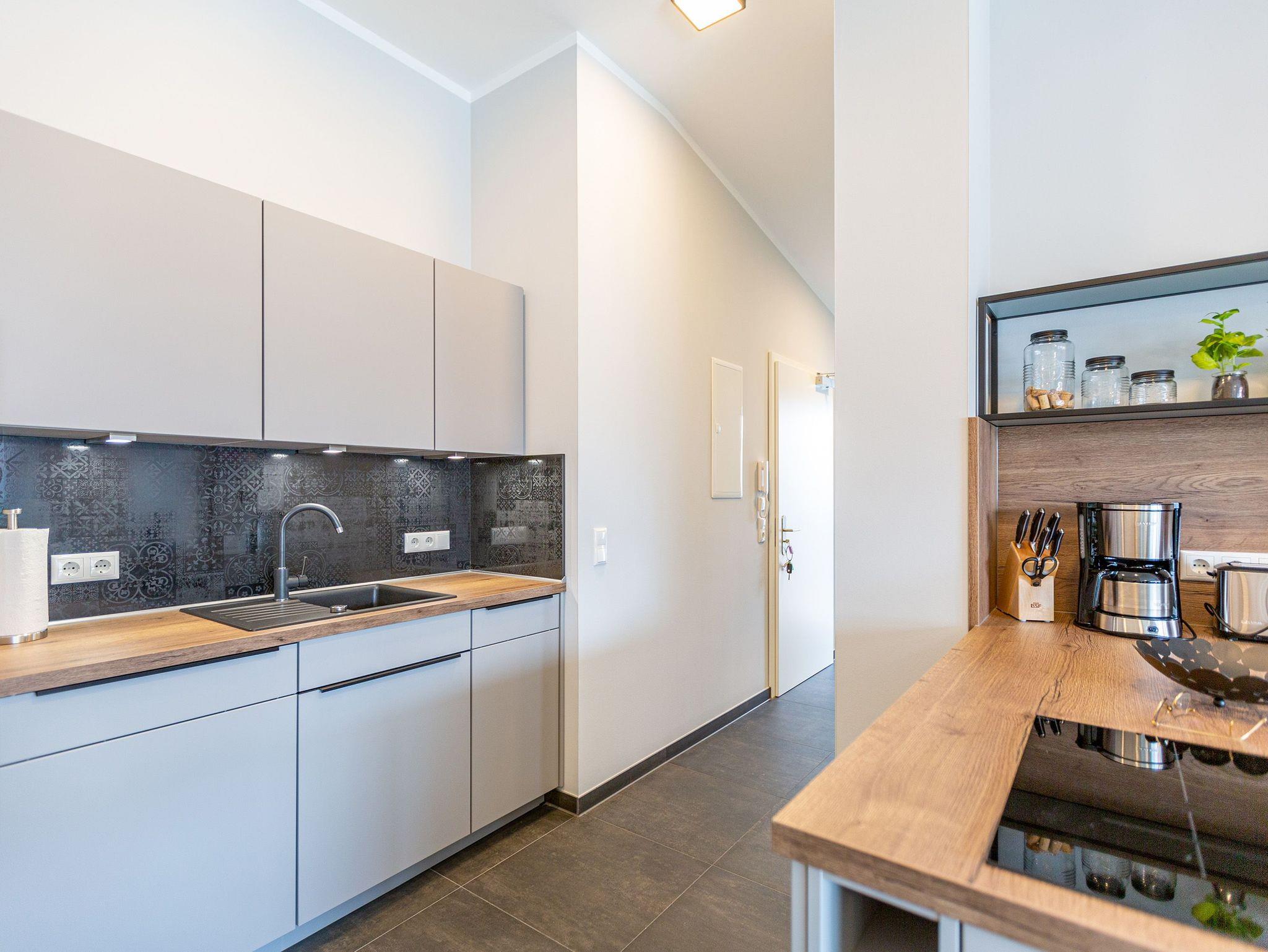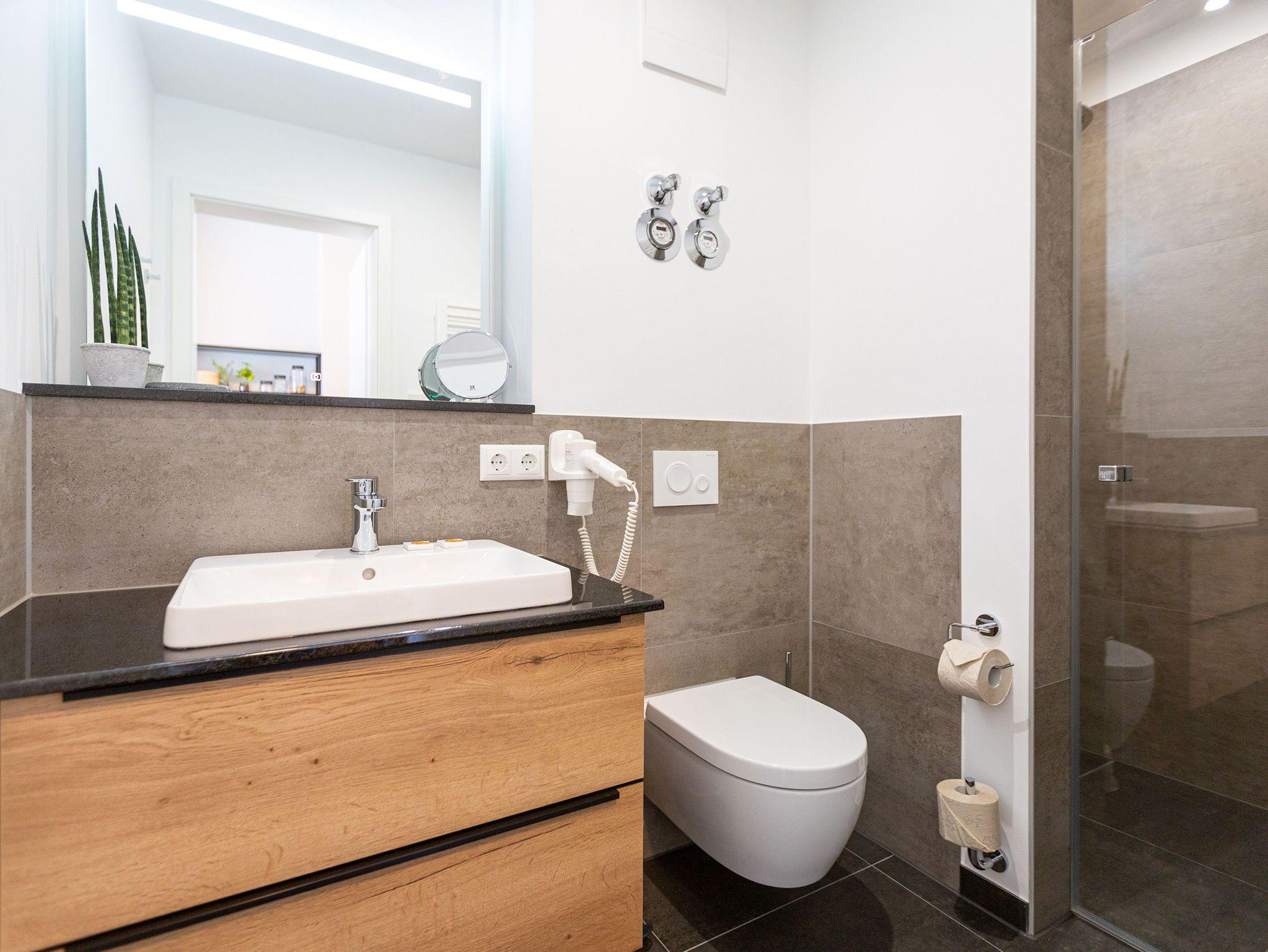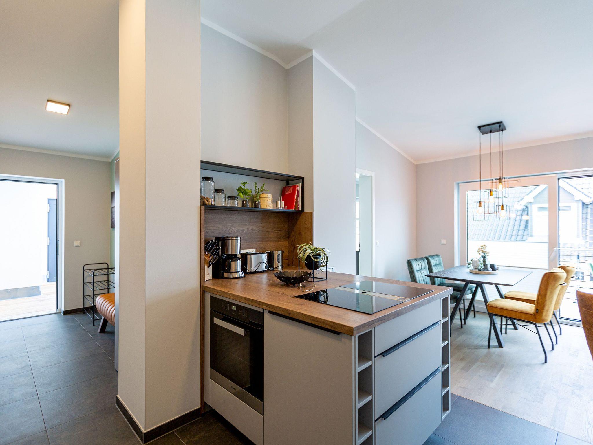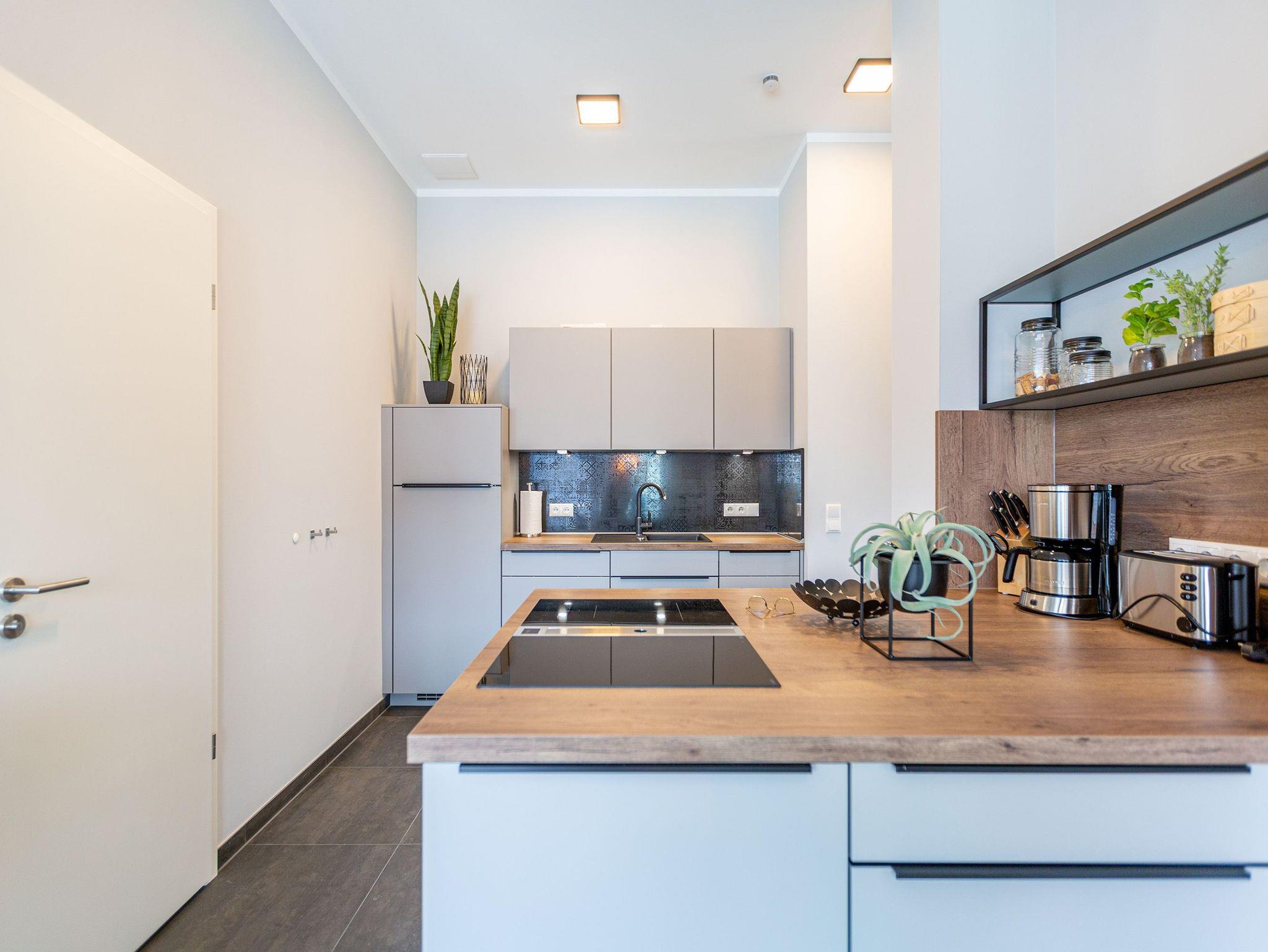Das Appartement 11 unter dem Dach des Quartiers ist mit seinen 83 luftig hellen Quadratmetern etwas ganz Besonderes. Drei Zimmer für bis zu vier Personen und ein Kleinkind (im Kinderreisebett) finden hier Platz und Ruhe für eine entspannte Ostseezeit. Viel Gemütlichkeit und wohliger Komfort erwartet die Bewohner auf Zeit. Pastelltöne, modernes Design und Wohnkomfort gehen in dieser Wohnung Hand in Hand. Ein geräumiges Wohn-Esszimmer weiß, mit bequemen Möbeln in den richtigen Urlaubsmodus zu versetzen. Eine Sofa-Sessellandschaft, ein Flat-TV, ein schöner, großer Esstisch ? alles ist erlesen und ausgewählt. Ein Balkon lädt bei schönem Wetter dazu ein, viel Zeit an der frischen Seeluft zu verbringen - von hier aus hat man einen seitlichen Blick auf die Ostsee und auf die Ahlbecker Seebrücke. Die offene Küche ist voll ausgestattet, verfügt über einen Induktionsherd mit den passenden Töpfen, eine Spülmaschine, einen Toaster, eine Kaffeemaschine und Geschirr. Auch eine Waschmaschine ist vorhanden. Zwei Schlafzimmer laden mit ihren großen Boxspringdoppelbetten (1,80 m x 2,00 m) zum Kuscheln und Träumen ein. Jedes Schlafzimmer hat einen Schrank, eine Kommode und einen Flat-TV. Zwei Bäder mit Dusche und WC sorgen für entspannte Badzeiten. Handtücher liegen bereit und die Betten sind bei Anreise bereits bezogen. Freuen Sie sich dann noch auf einen Extra-Clou. Denn die Wohnung verfügt über eine wunderschöne Dachterrasse mit Sonnenliegen. Hier lässt sich ein Sommertag relaxed angehen. Zudem befindet sich auf der Terrasse der Zugang zu einer Sauna. Ihr kleiner Private SPA verfügt über eine Außendusche. So können Sie direkt aus der Wärme unter das kühle Nass springen. In der Tiefgarage gibt es für Ihr Auto 2 Stellplätze hintereinander und einen separaten Fahrradraum. Das WLAN ist kostenfrei nutzbar.