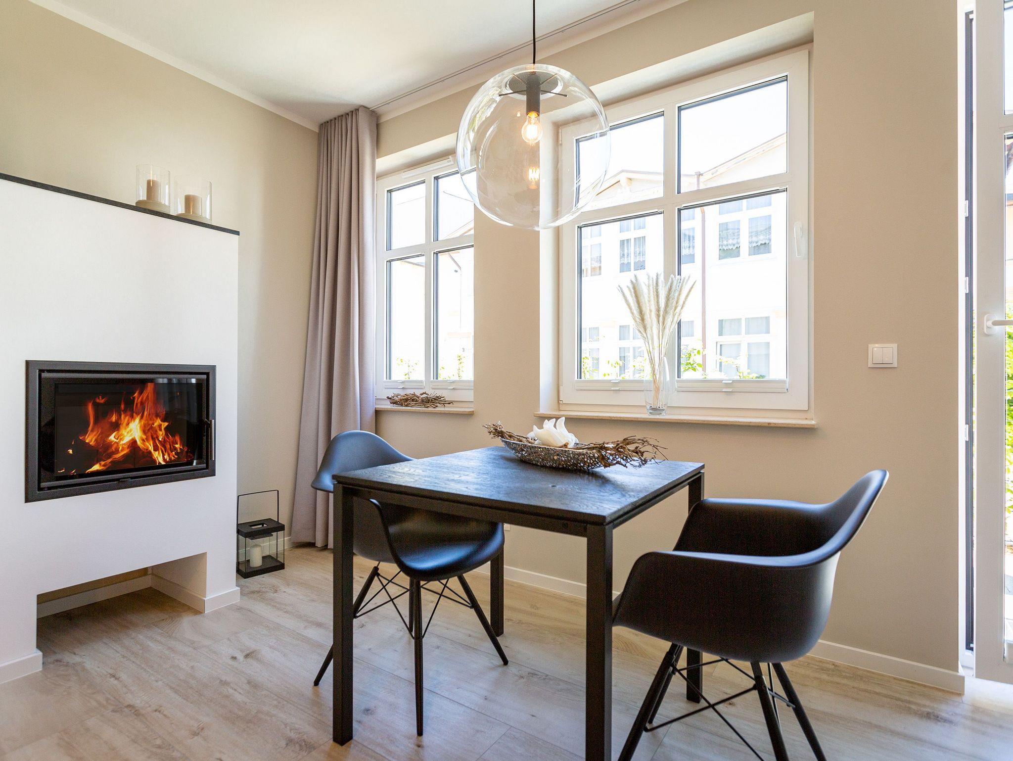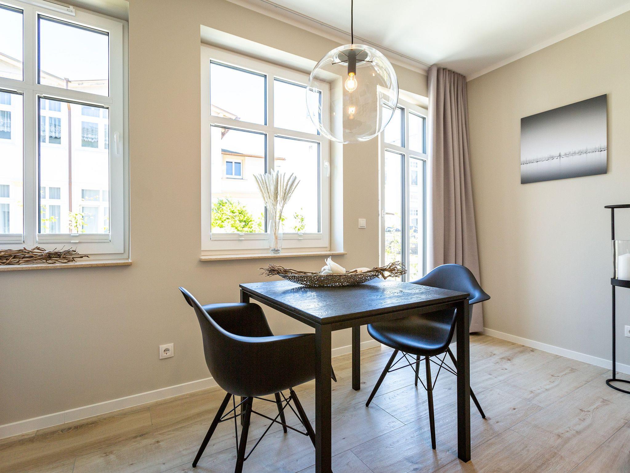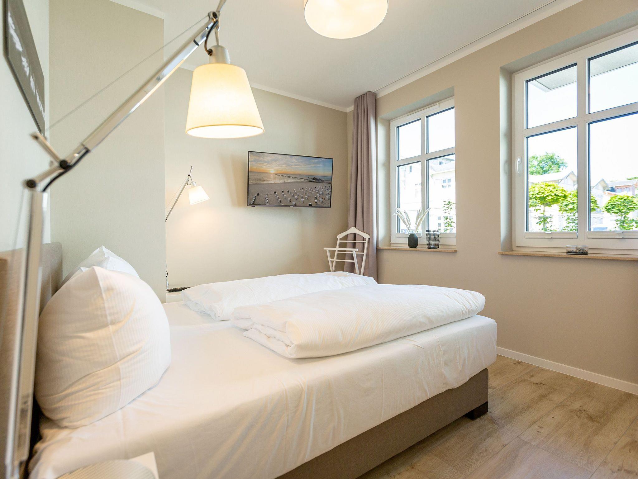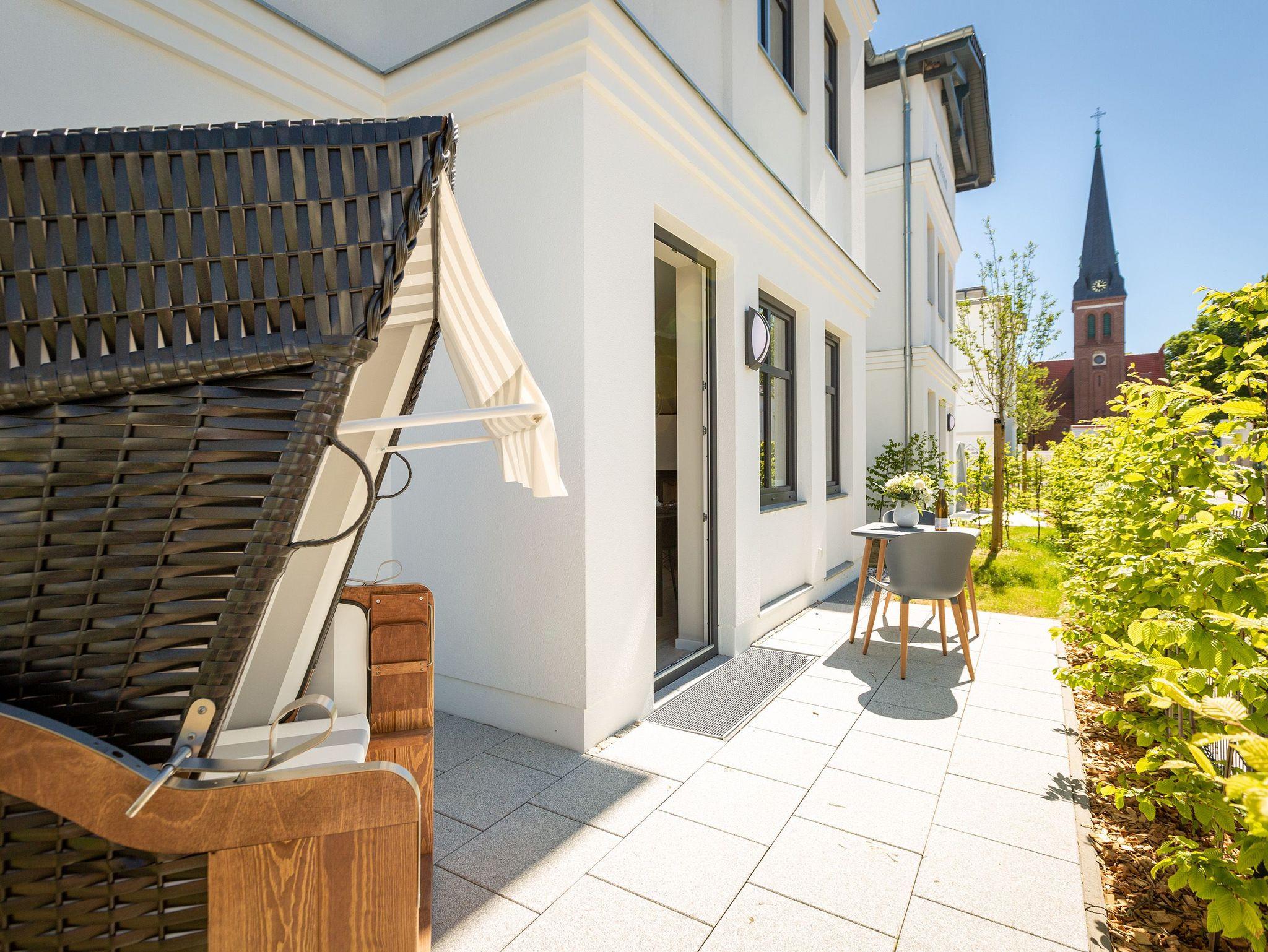 Dieses kleine, aber feine Design-Appartement für zwei Personen mit Kleinkind (im Kinderreisebett) ist das perfekte Erholungsrefugium für alle, die es gern schick, modern und stylisch mögen. Auch Ihren geliebten Vierbeiner dürfen Sie hier mitbringen. Wohlfühlen auf 50 Quadratmetern ist hier garantiert. Da sich das Appartement im Erdgeschoss befindet, hat es Zugang zu einer ? natürlich nur für Sie reservierten und zur Wohnung gehörenden ? Sonnenterasse mit Strandkorb und Gartenmöbeln. Mitten im Grün und umgeben von wunderschönen Bädervillen können Sie hier eine entspannte Zeit beim Essen oder Sonnenbaden genießen. Das Wohnzimmer dieses Zwei-Raum-Appartements ist modern und elegant mit ausgesuchten Design-Möbeln eingerichtet. Die Cassina Couch nach dem berühmten Design von Le Corbusier, aber auch der Schalen-Schaukelstuhl eignen sich perfekt zum Runterkommen und Faulenzen. Ein großer Flat TV (50 Zoll) sorgt für Unterhaltung. An kühlen Inseltagen wärmt der Kaminofen und sorgt für eine gemütliche und romantische Atmosphäre. Die an das Wohnzimmer angrenzende Küche ist mit hochwertigen Markengeräten voll ausgestattet. Ob Qualitätsmesser-Set, Induktionsherd, Senseo Padmaschine, Geschirrspüler oder das Geschirr selbst ? hier werden Sie alles zu Ihrer Zufriedenheit vorfinden. Kochen macht mit diesem Equipment sogar im Urlaub Spaß. Im Wohnzimmer befindet sich zudem ein schöner Essplatz. Im Schlafzimmer wartet viel Gemütlichkeit mit einem bequemen Boxspringdoppelbett (1,60 m x 2,00 m) auf Sie. Viel Platz für die Urlaubsgarderobe bietet der eigens angefertigte Einbauschrank. Das Bad hat Tageslicht und verfügt über eine Regendusche und ein WC. Bei Anreise sind die Betten bezogen und Handtücher liegen für Sie bereit. In der Tiefgarage gehört zu der Wohnung 4a ein Stellplatz. Ein separater Fahrradraum ist im Keller ebenfalls vorhanden.