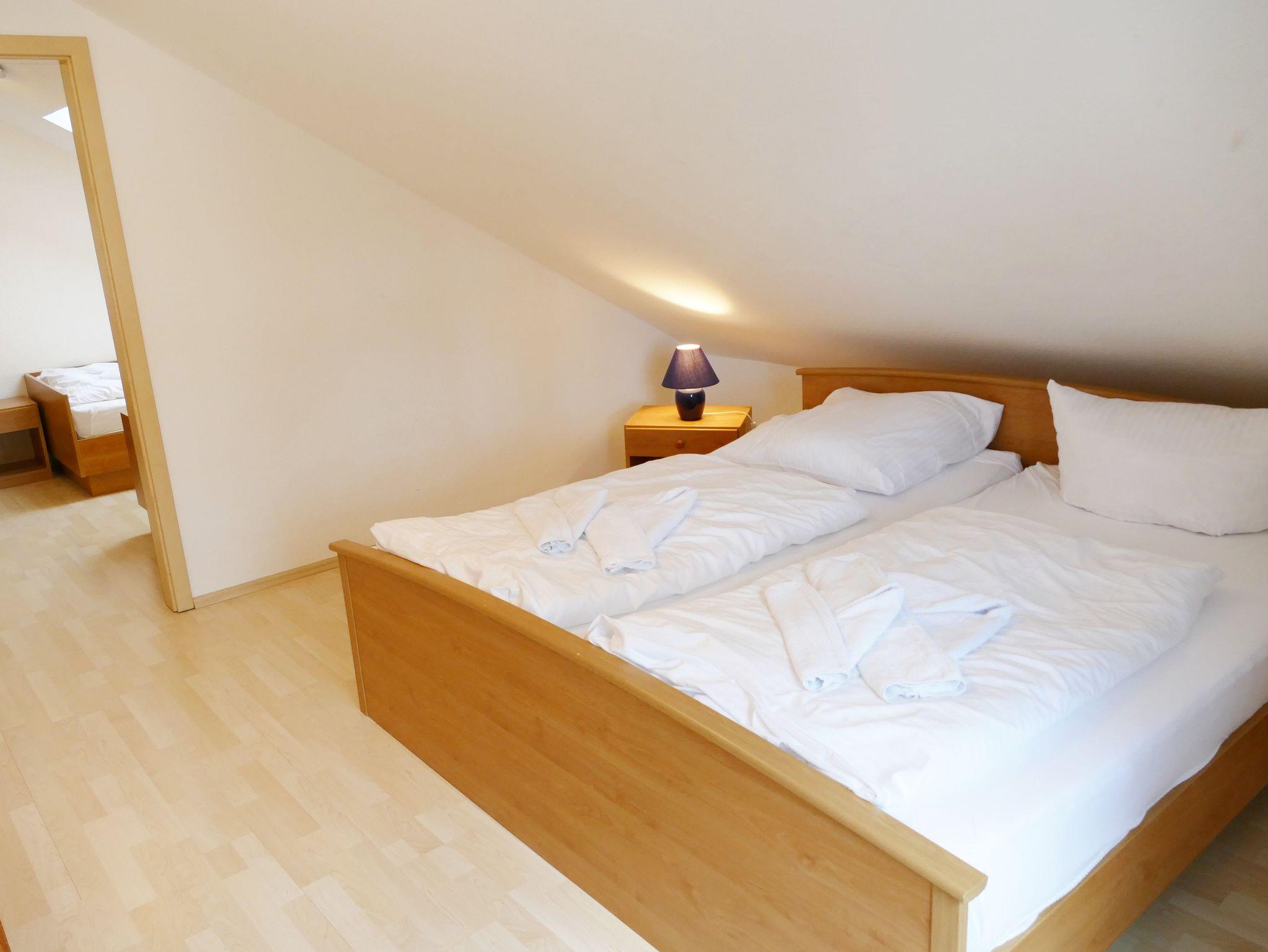 Die 53 qm große Maisonette-Ferienwohnung bietet Platz für max. 4 Personen. Die Wohnung verfügt über einen Wohnbereich und Küchenzeile, ein Badezimmer mit Dusche und WC und in der oberen Etage über ein Schlafzimmer mit einem Doppelbett und ein Schlafzimmer mit 2 Einzelbetten. Die Wohnung hat einen Balkon zur Gartenseite. Der Wohnbereich ist mit einer gemütlichen Sitzgruppe und einem Essplatz eingerichtet. Ebenso sind Kabel-TV und CD-Spieler mit Radio vorhanden.