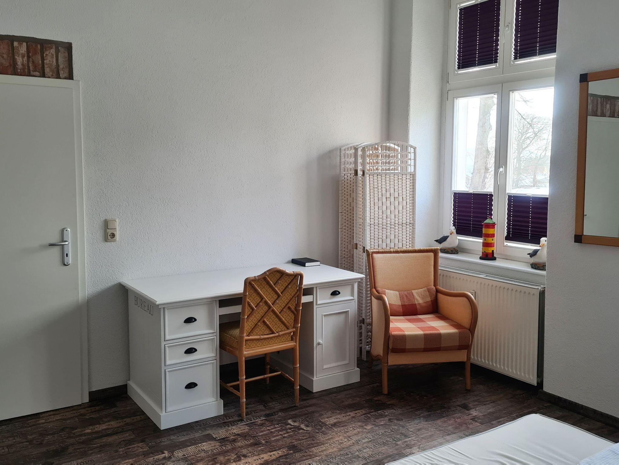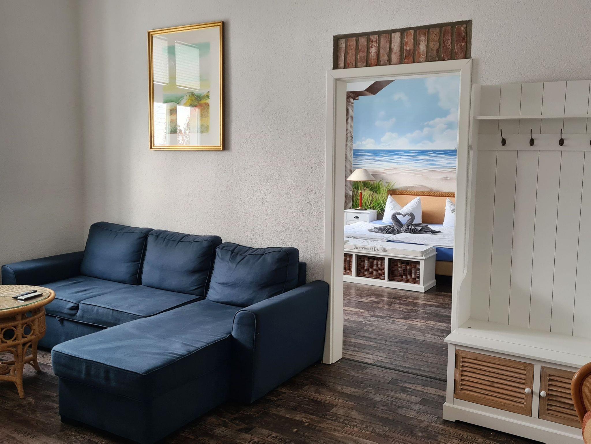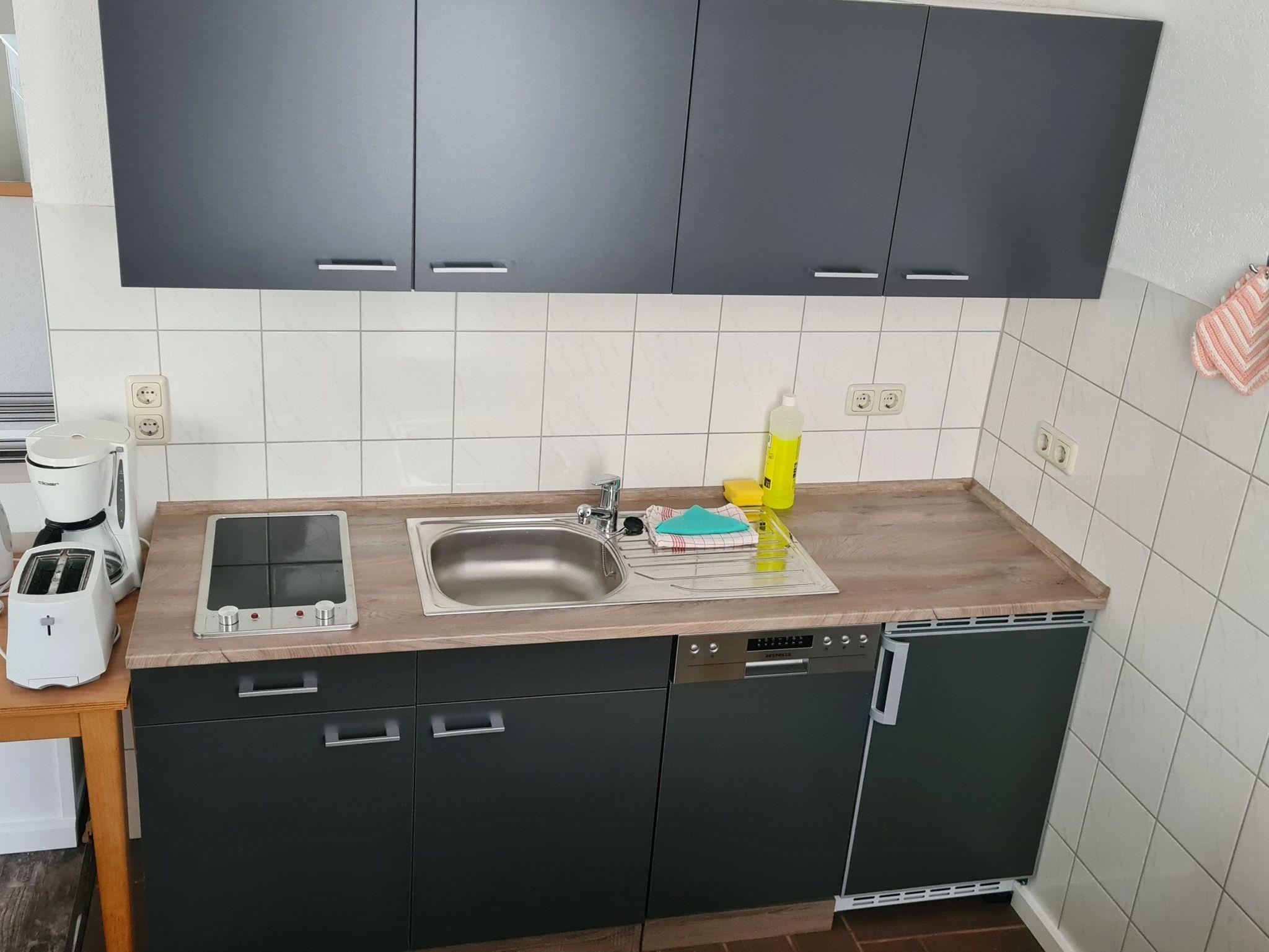 Die 52 qm große Ferienwohnung befindet sich im Obergeschoss und ist mit einem Wohnzimmer mit Sitzeck und TV und einer kleinen Küchenzeile mit Kühlschrank und Gefriermöglichkeit, 2-Platten-Ceranherd, Spülmaschine etc ausgestattet. Das Schlafzimmer verfügt über ein Doppelbett und ein Etagenbett. Bad mit Dusche und WC.