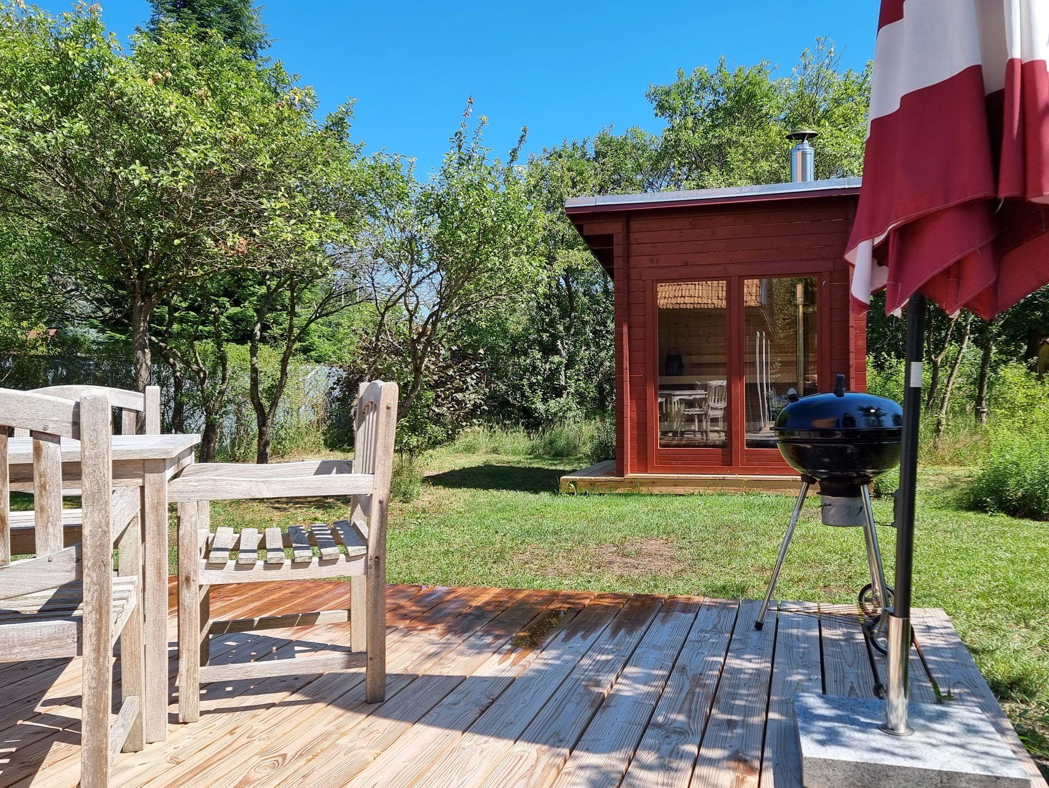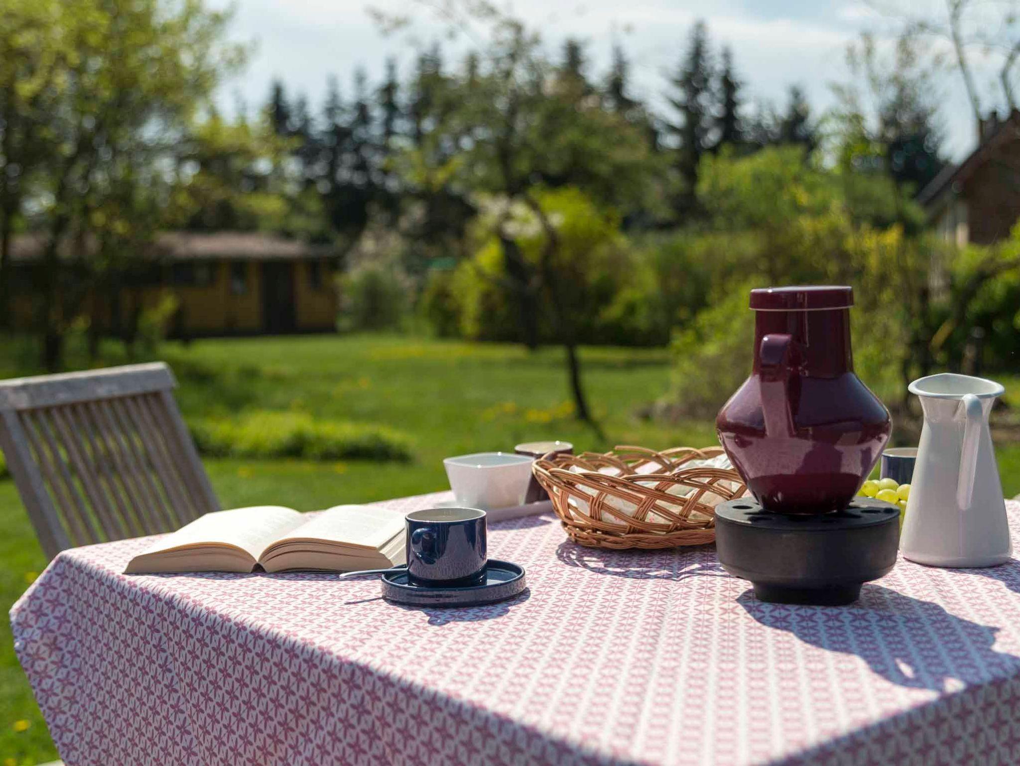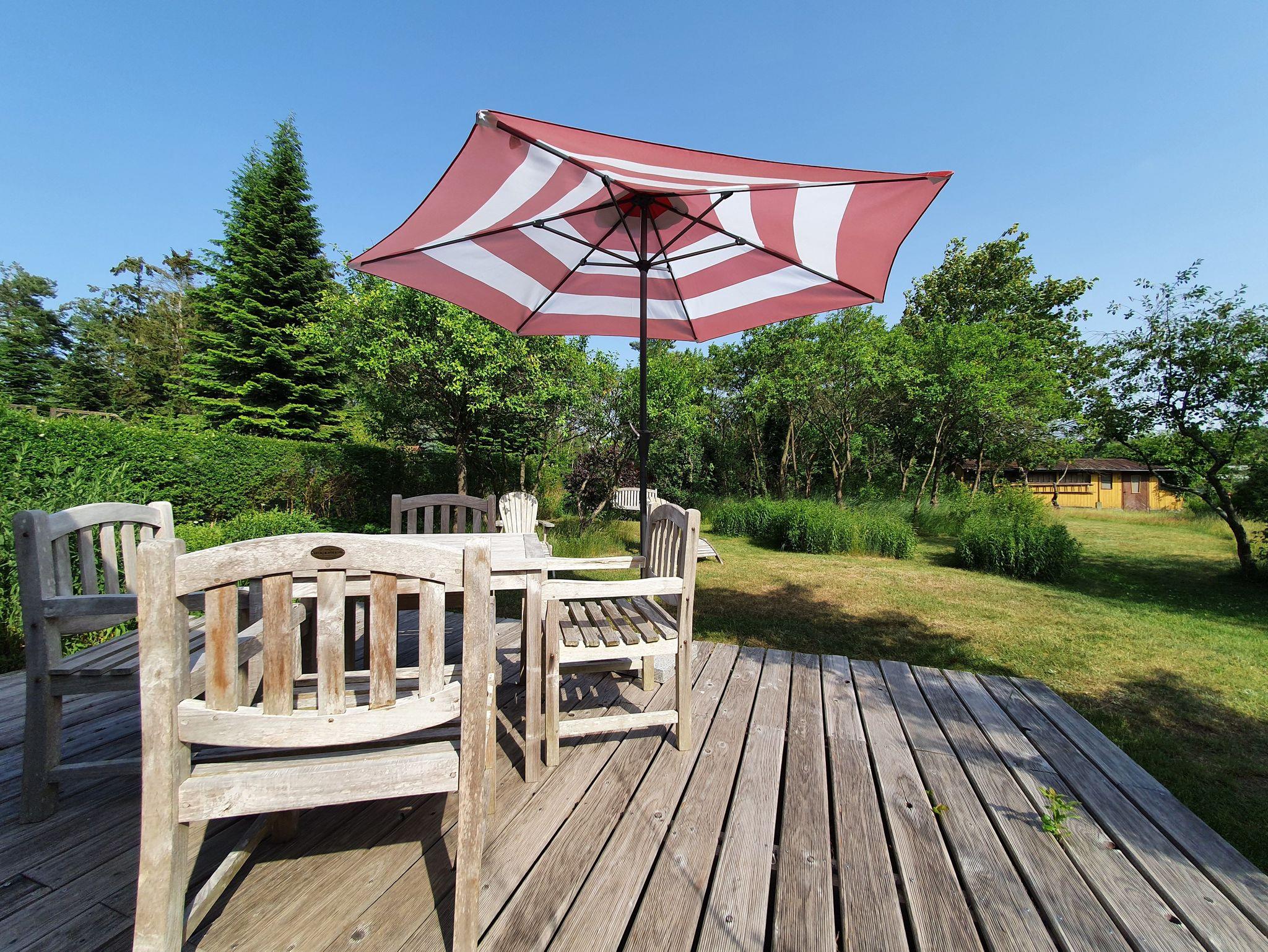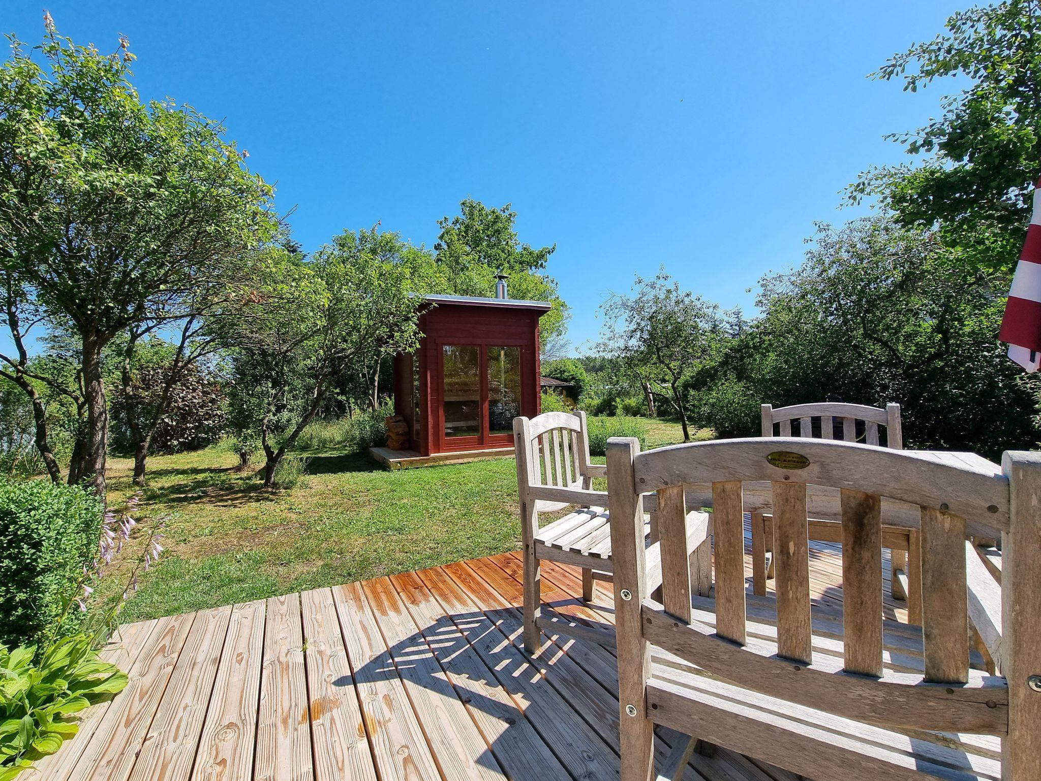 Die antike Bank unter dem Birnbaum vorm Haus, Teakmöbel auf der großen Holzterrasse und weitere Sitz und Liegemöglichkeiten stehen für Sie zum Entspannen bereit. Von hier aus schaut man in den wildromantischen Obstgarten mit seinen im Frühling prächtig blühenden Kirsch-, Apfel- und Pfirsichbäumen und gepflegten Hecken, auf eine Spielwiese mit Sandkasten für die Kleinsten und auf ein verlassenes Imkerhaus.