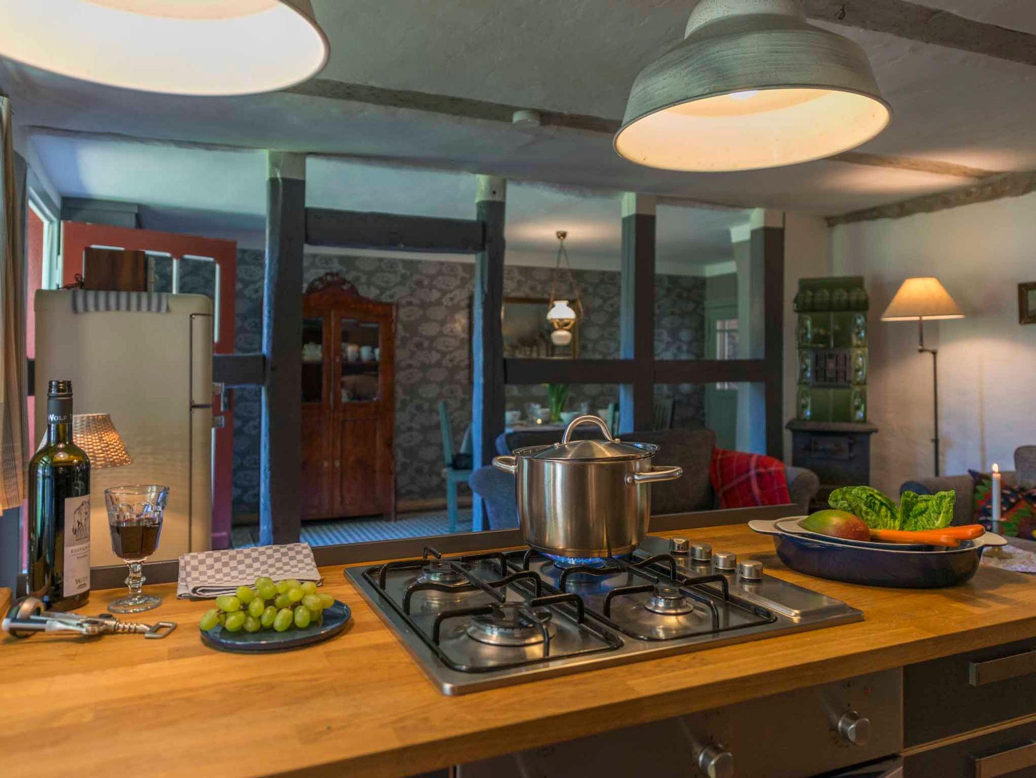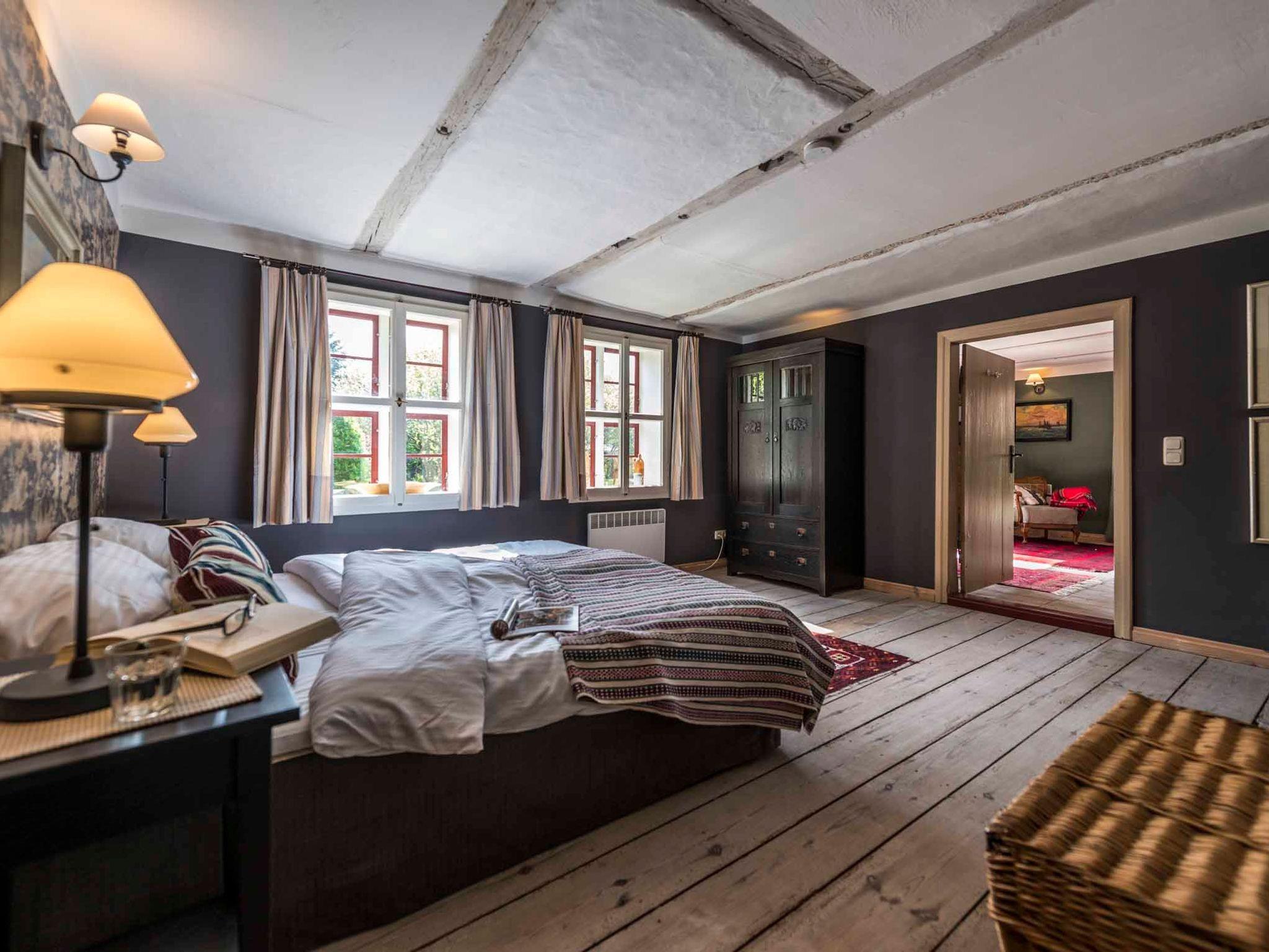 Unser Colonistenhaus ist ein liebevoll saniertes Fachwerkhaus aus dem Jahr 1757. Haben Sie schon einmal Ihren Urlaub in einem 250 Jahre alten Haus verbracht? Lieben Sie blankgegriffene Türklinken, tiefe Balkendecken, die Struktur handgeformter Lehmwände, das Spiel von Licht und Schatten auf gelaugten Dielen und antiken Möbeln? Dann lassen Sie sich von fast 100m² Geschichte im Colonistenhaus verzaubern. Bei unserem mit viel Liebe sanierten Fachwerkhaus aus dem Jahr 1757 wurde ganz besonders darauf geachtet, den ursprünglichen Charme eines historischen pommerschen Gebäudes zu bewahren und dabei viel Wert auf ökologische Materialien wie Lehm, Holz und Naturfarben gelegt. So haben wir das Haus mit der für diese Häuser typischen Holzfassade aus heimischer Fichte versehen. Das Dach wurde 2016 mit wunderbaren, historischen Tonziegeln eines Abbruchgebäudes im Nachbardorf neu gedeckt. Die zum Teil noch barocken Kastenfenster wurden aufwendig restauriert oder da wo möglich durch helle, bodentiefe Fenstertüren komplettiert, sodass direkte Zugänge zur umlaufenden großen Holzterrasse geschaffen wurden. Die urgemütliche Atmosphäre der Räume, mit niedrigen Balkendecken, edlen Tapeten und Zementfliesen, Fachwerkwänden, den antiken Schränken und Kommoden wird Sie verzaubern. Hier sorgt ein antiker Lübecker Kachelofen im Winter für wohlige Wärme. Außerdem wurde eines der beiden Schlafzimmer mit einem gusseisernen Franklin Ofen ausgestattet, der hier nun auf Wunsch für ausgesprochen romantische Abende sorgt.