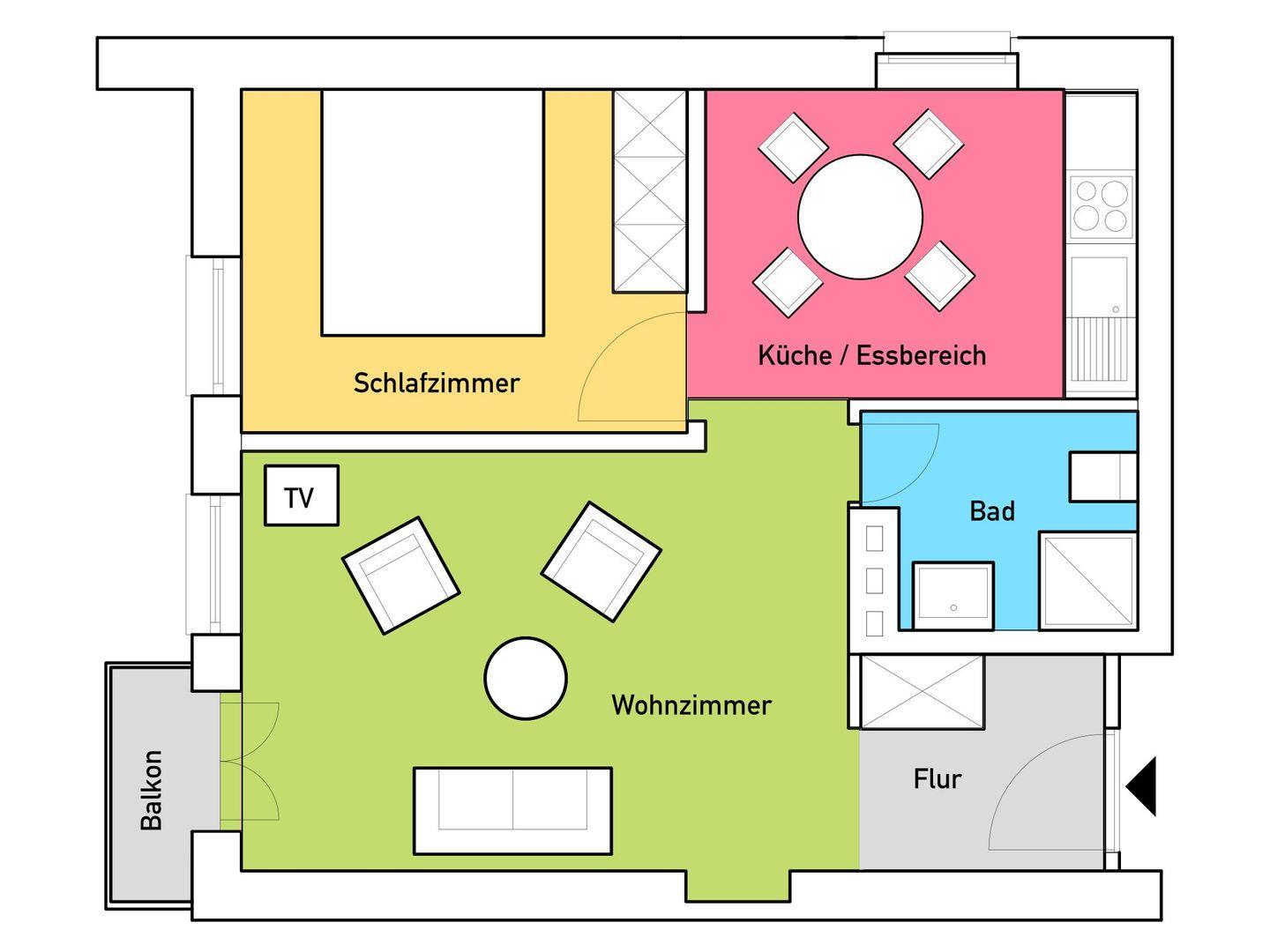Das gemütliche Wohnzimmer mit Übergang in den Küchenbereich und seinem separaten Essplatz lädt zum Verweilen ein, während die Schlafmöglichkeiten mit einem komfortablen Doppelbett ( 180 x 200 cm ) im Schlafzimmer und einer Schlafcouch ( 140 x 190 cm ) im Wohnzimmer für Flexibilität sorgen. Die Küche ist voll ausgestattet und ermöglicht Ihnen eine unabhängige Selbstverpflegung während Ihres Aufenthalts. Das Bad mit seiner superflachen Dusche rundet das Angebot ab.
