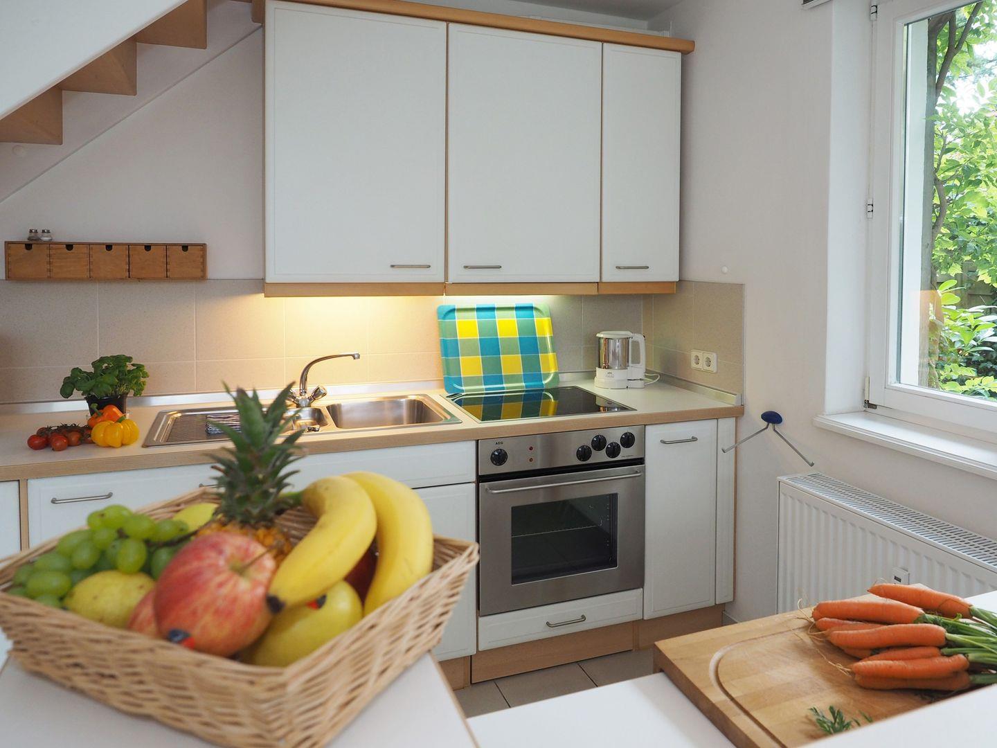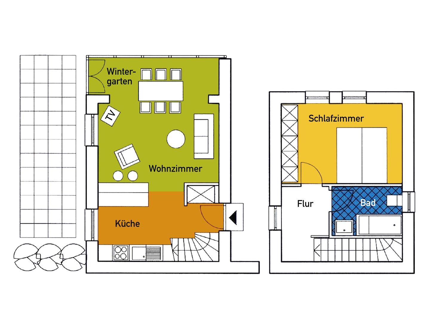 Im Wintergarten mit Blick in den Garten finden Sie einen Essplatz mit Übergang in den großzügigen Wohnbereich. Für Flexibilität sorgen die Schlafmöglichkeiten mit einem komfortablen Doppelbett ( 180 x 200 cm ) im Schlafzimmer im OG und einer Schlafcouch ( 140 x 200 cm ) im Wohnzimmer. Neben dem Schlafzimmer befindet sich ein Bad mit Badewanne und Duschmöglichkeit. Die separate offene Küche ist voll ausgestattet und ermöglicht Ihnen eine unabhängige Selbstverpflegung während Ihres Aufenthalts.