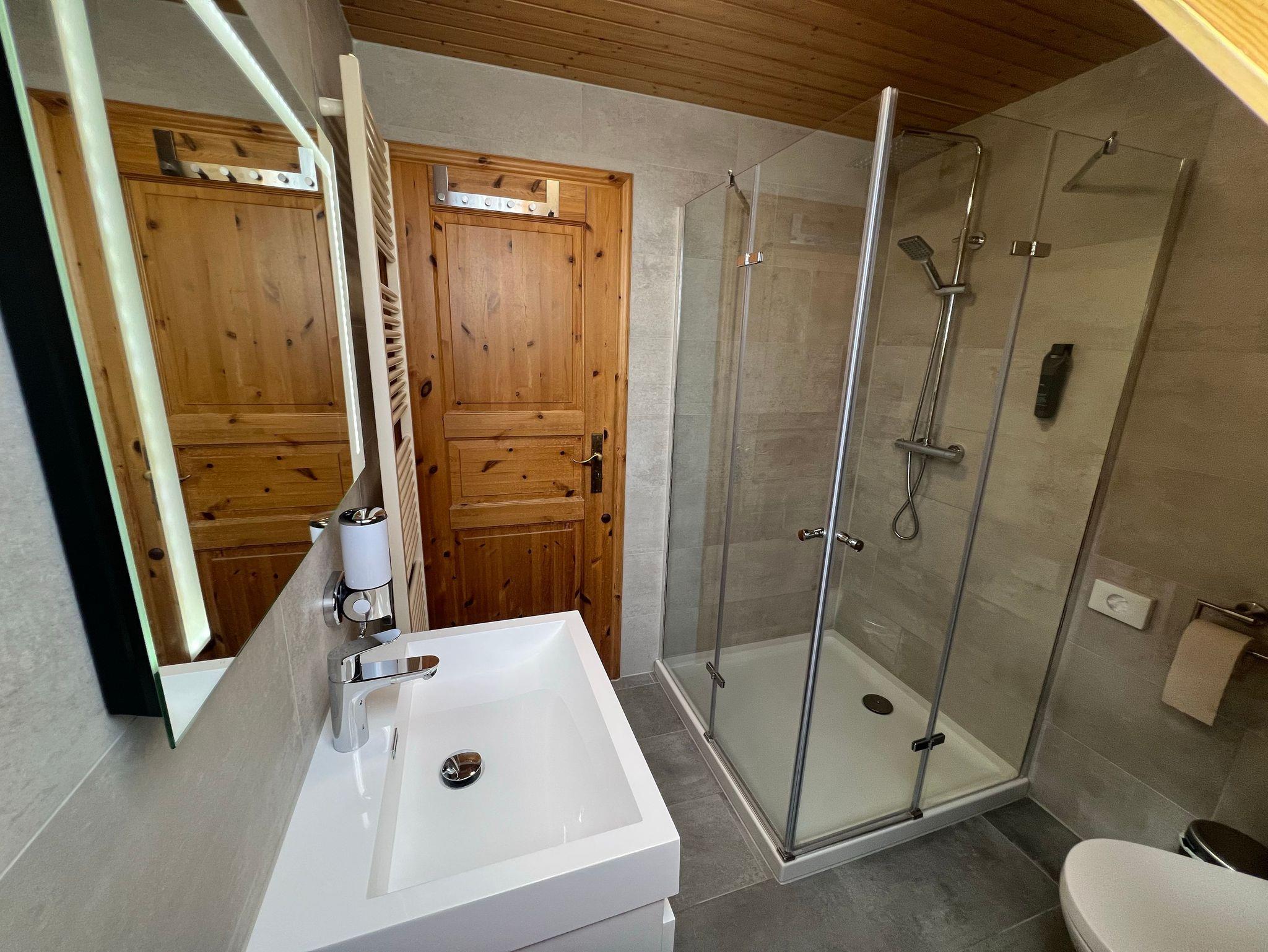 Wohnbereich verbunden. Das Badezimmer verfügt über Dusche und WC.
