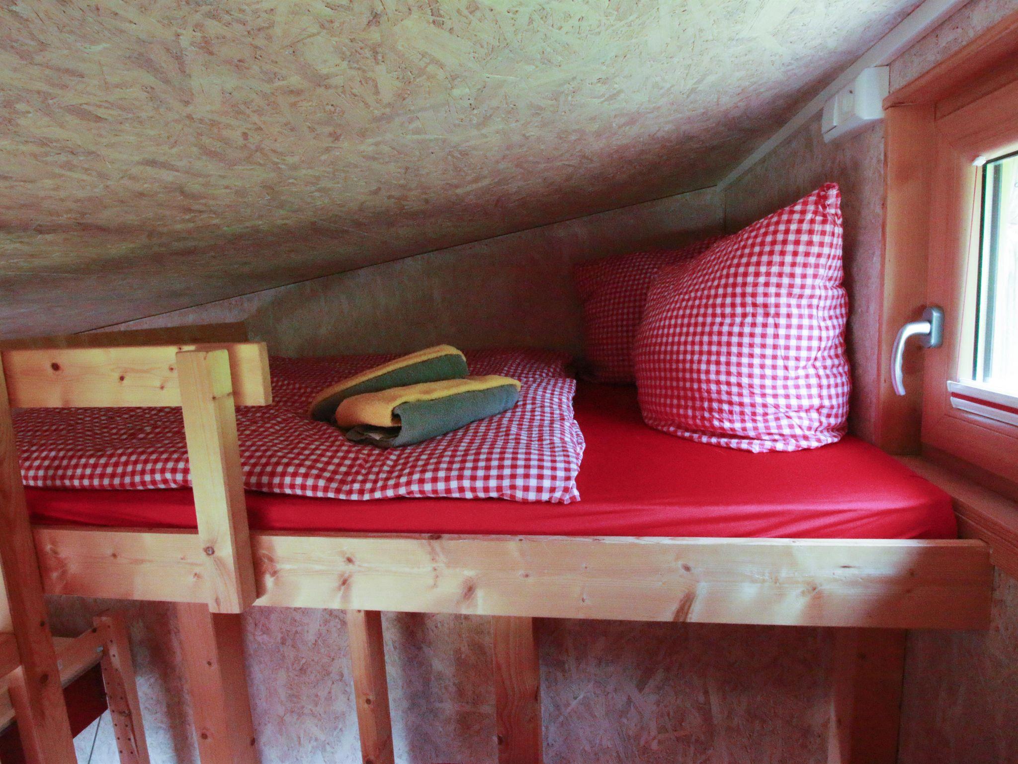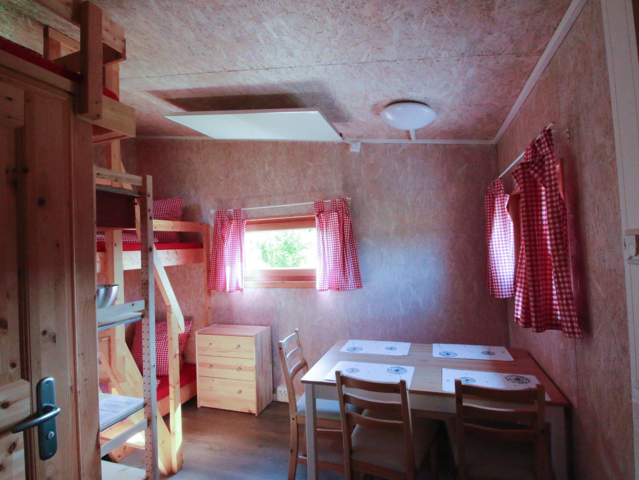 Eine spannende Unterkunft für Himmelsstürmer sind unsere neu dazugekommenen Stelzenhäuser auf der obersten Etage des Sonnencamping. In diesen ganz aus Holz gefertigten Mietunterkünften übernachten Sie ohne eigene Ausrüstung. Der kombinierte Schlaf-/Wohnraum ist mit einer Essecke und Schlafmöglichkeiten für 4 Personen ausgestattet: ein Etagenbett bietet Platz für 2 Personen (2 Betten à 0,90 x 2,00), ebenso die 1,40 x 2,00 m große Liegefläche.
