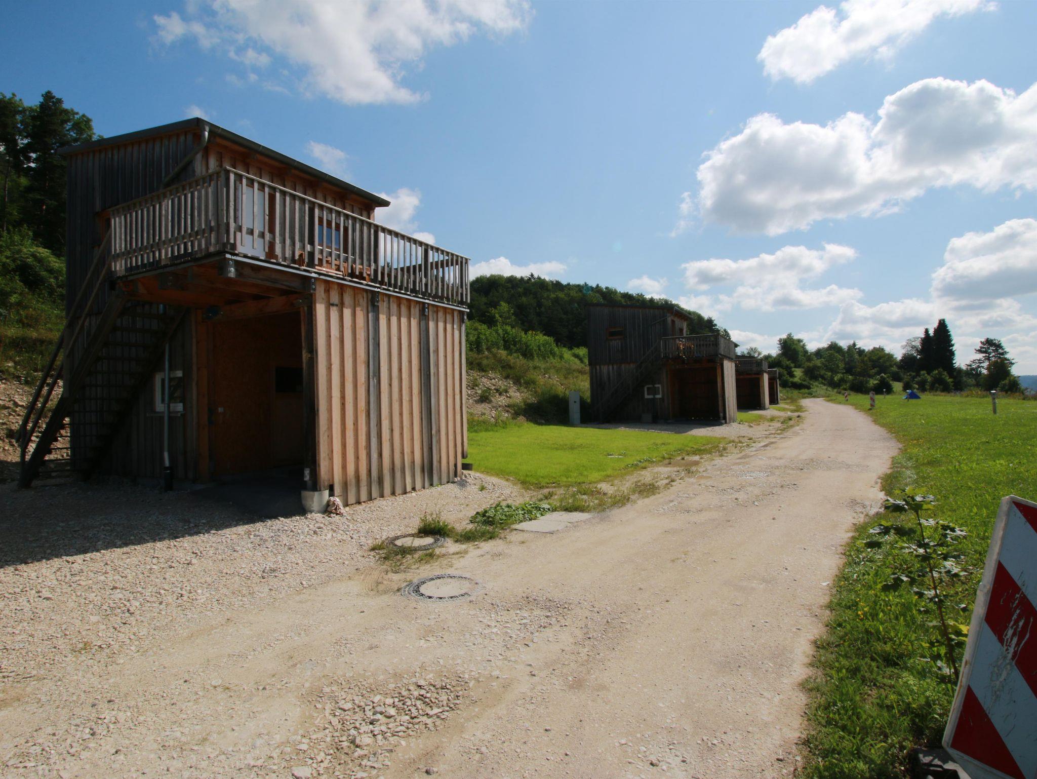Das Küchenmodul ist mit Kühlschrank, 2-Plattenherd und Spüle ausgestattet. Stauraum ist ausreichend vorhanden. Über die Außentreppe erreichen Sie das im Erdgeschoss befindliche Bad (nicht beheizbar) mit Waschbecken und WC . Von der großzügigen Terrasse der Stelzenhäuser haben Sie einen wunderbaren Rundumblick auf die Hügel der Schwäbischen Alb.