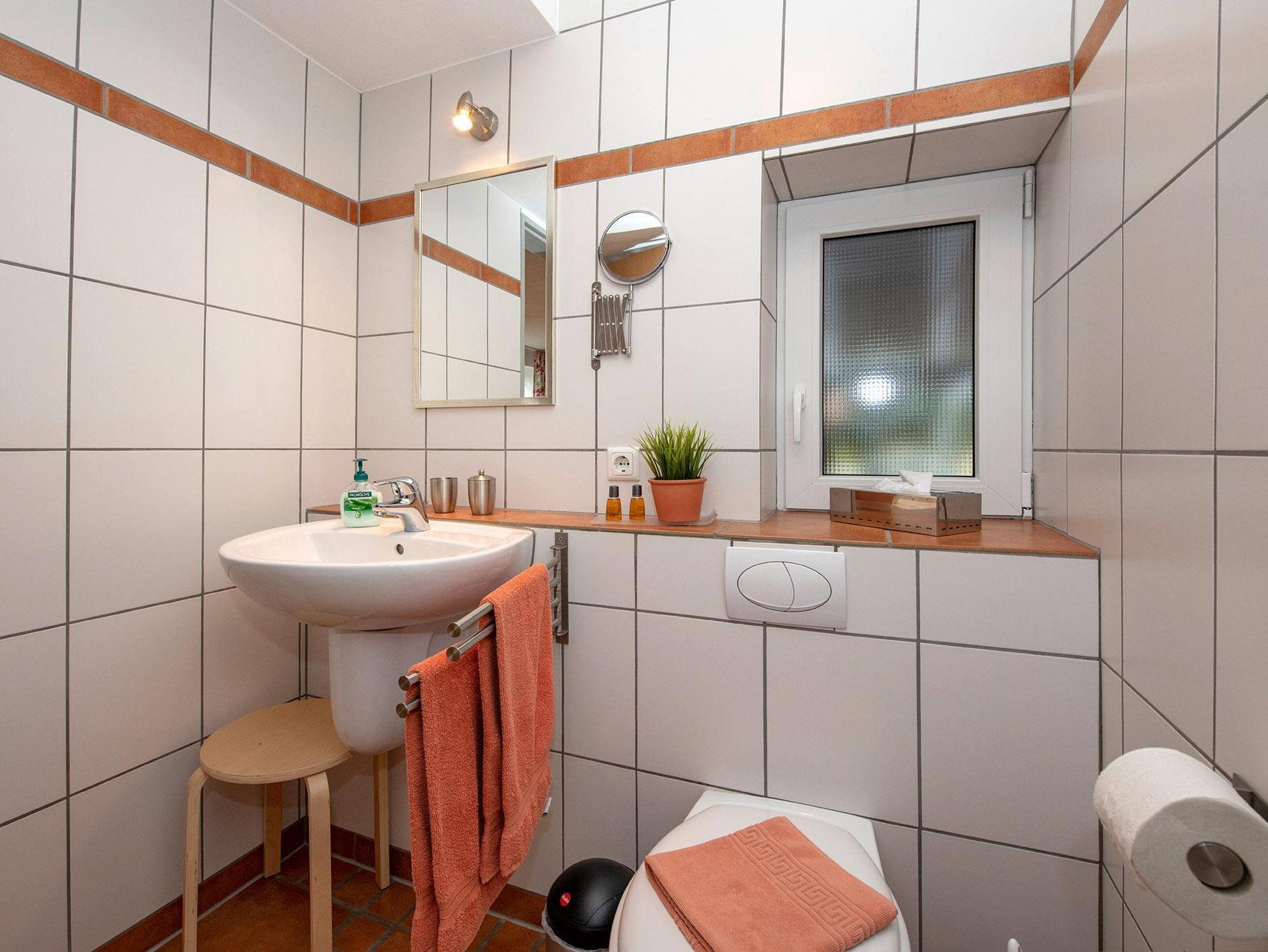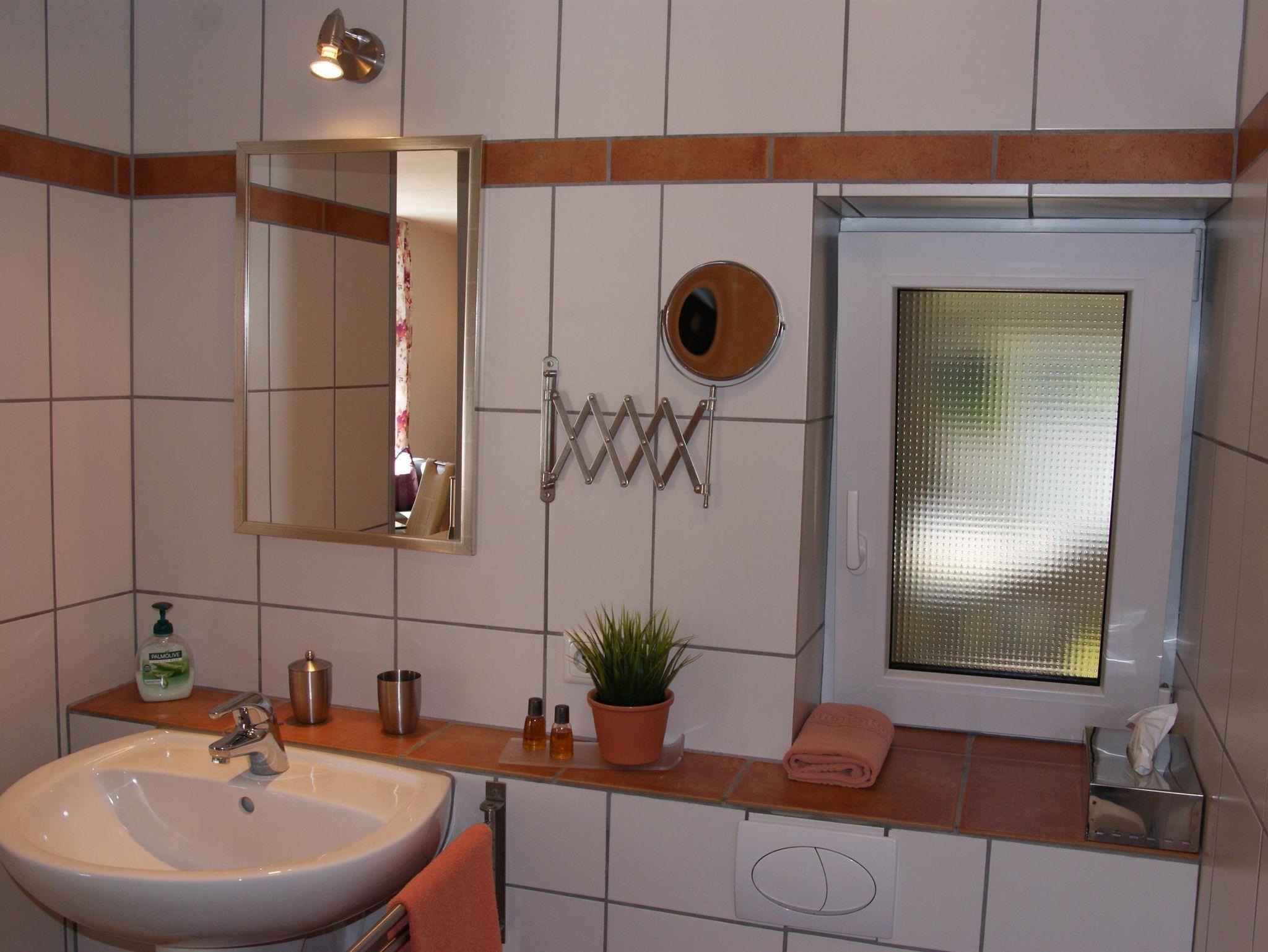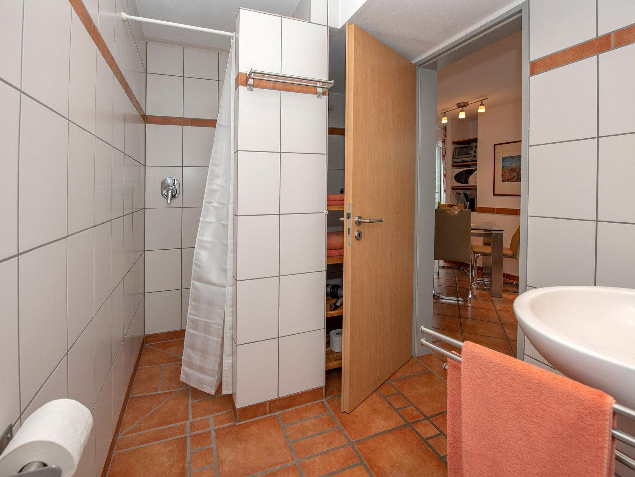 Im Bad finden Sie Hygieneartikel, Fön, Kosmetikspiegel, Wäscheständer, Papiertücher und Toilettenpapier. Die Dusche ist bodengleich. Hand- und Duschtücher inklusive (Handtücher-Wechsel bei längerem Aufenthalt).