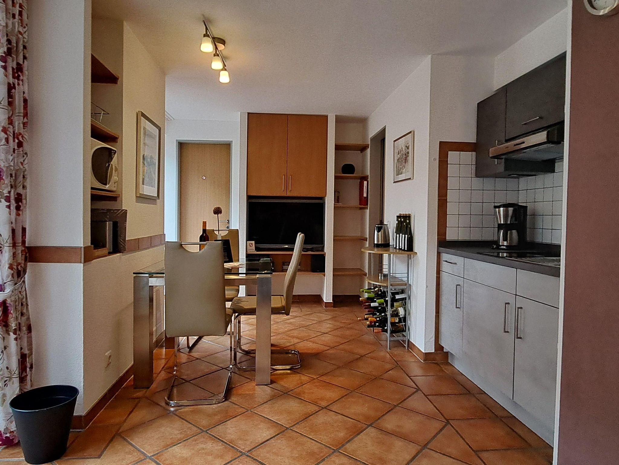 Die Ferienwohnung besitzt einen Esstisch mit drei Stühlen. Auf Wunsch kann ein vierter hinzugestellt werden, z.B. wenn Ihre Freunde/ Bekannte unsere Ferienwohnung Arras (liegt direkt neben der Ferienwohnung Mosel) gebucht haben und Sie mit Ihnen gemeinsam Frühstücken oder Essen möchten.