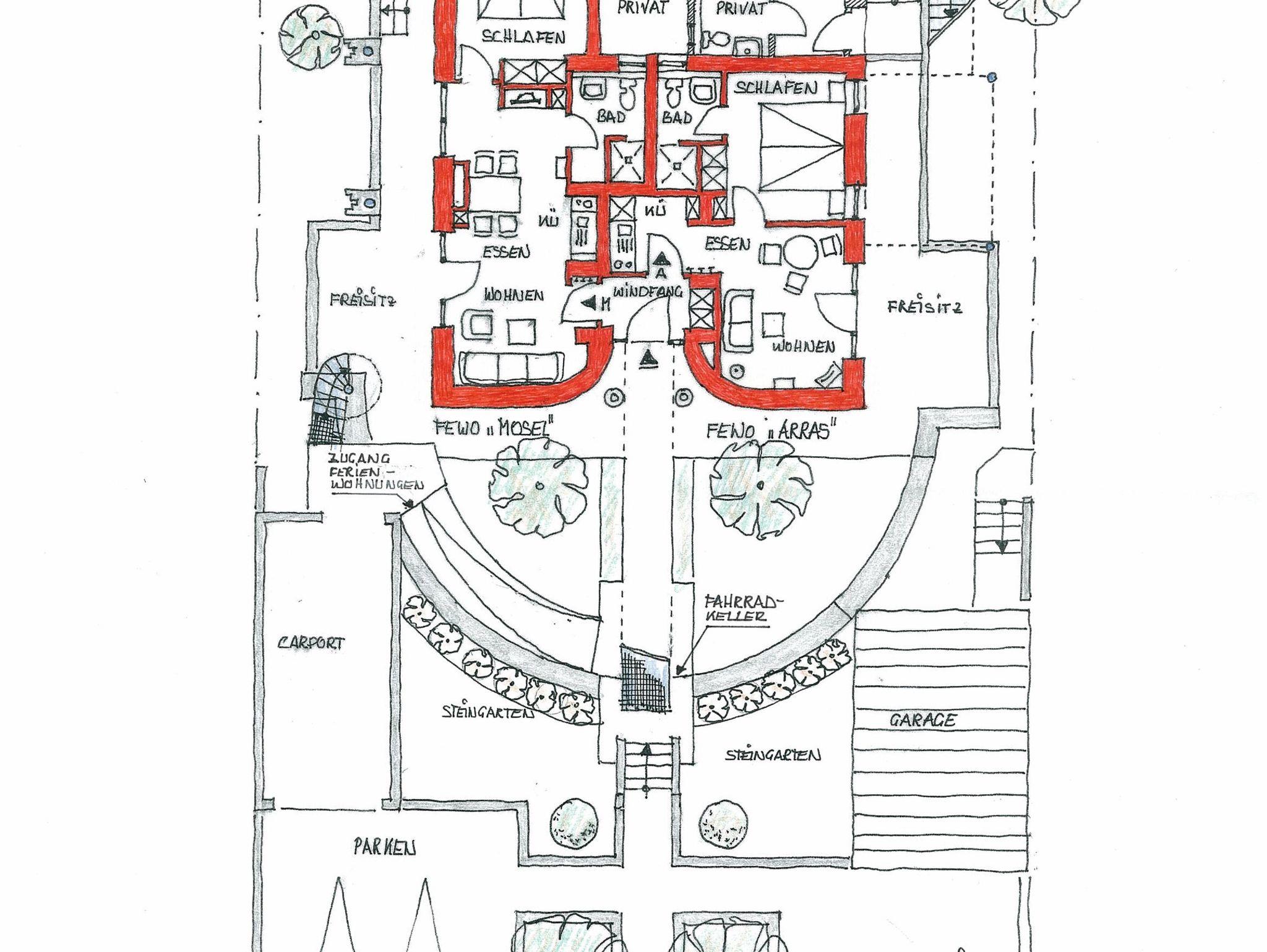 Wenn Sie für 4 Personen eine Ferienwohnung suchen bietet sich die Möglichkeit die Ferienwohnung Mosel und Arras zu mieten. Sie liegen unmittelbar nebeneinander (siehe Grundriss). Es besteht dann z.B. die Möglichkeit gemeinsam in der Fewo Mosel zu frühstücken.