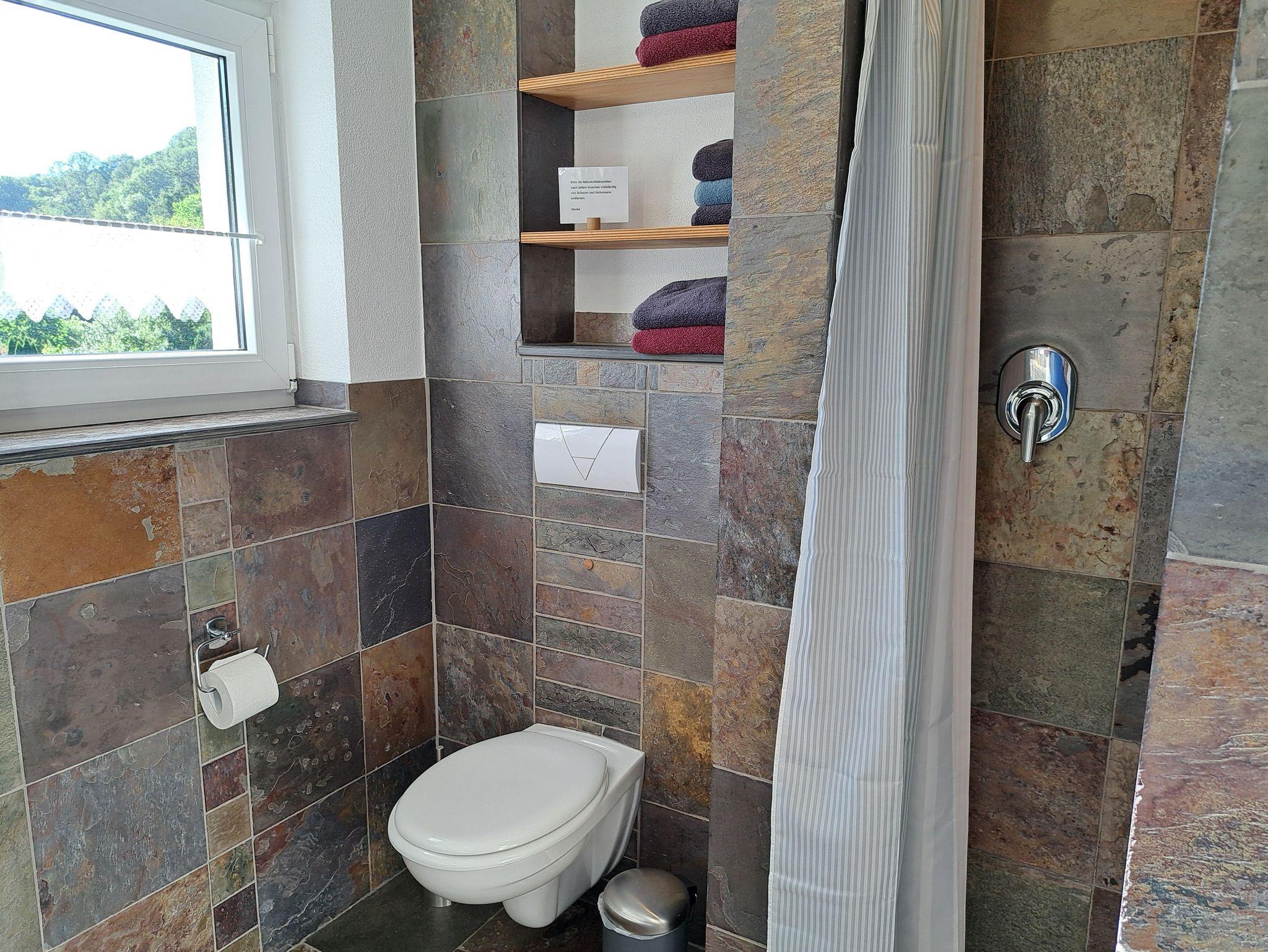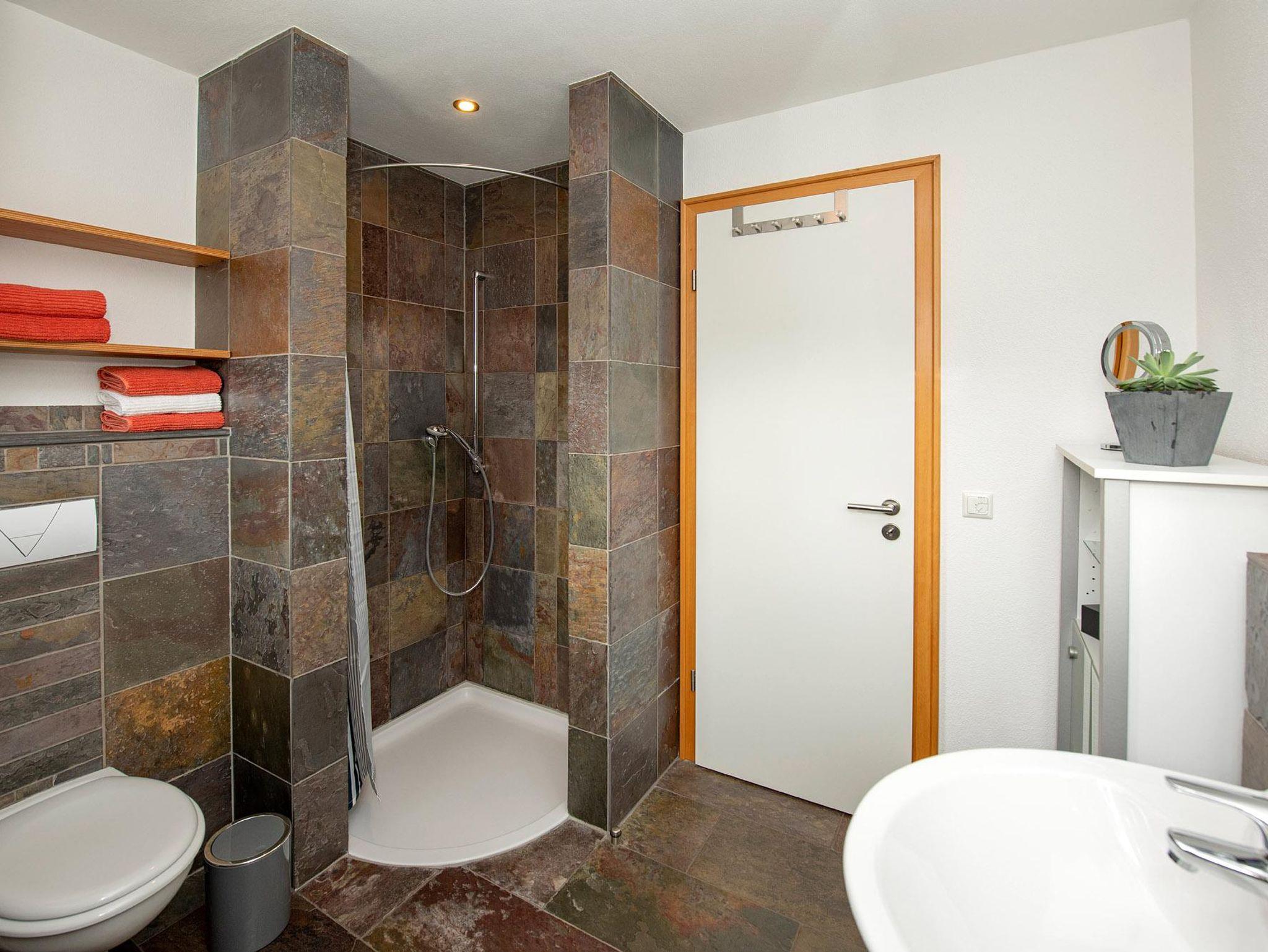 Im Bad finden Sie Hygieneartikel, Fön, Kosmetikspiegel, Wäscheständer, Papiertücher und Toilettenpapier. Die Dusche ist bodengleich. Hand- und Duschtücher inklusive (Handtücher-Wechsel bei längerem Aufenthalt).
