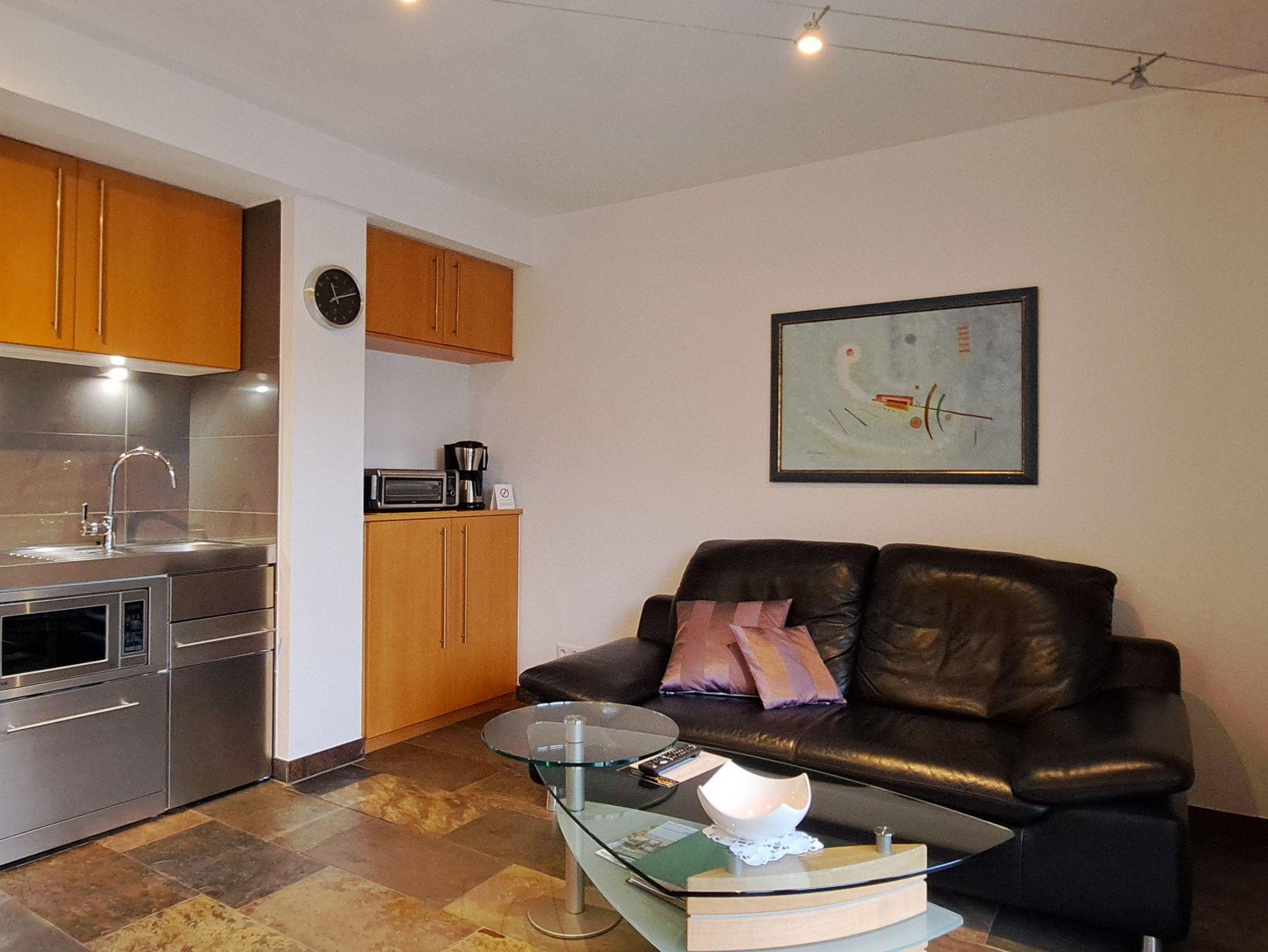 Im Kochbereich befindet sich eine Pantryküche mit 2-Platten-Ceran-Kochfeld, Kühlschrank mit Gefrierfach und kleiner Spülmaschine. Weiterhin ist die Küche mit ausreichendem Koch- und Essgeschirr, Gewürze, Mikrowelle, kleinem Backofen, Wasserkocher, Kaffemaschine und Toaster ausgestattet. Auch weitere Annehmlichkeiten wie Filtertüten, Mülltüten, Spülmittel, Spültücher finden Sie hier. Geschirtücher sind natürlich inklusive. Der Essbereich ist für 2 Personen ausgelegt.
