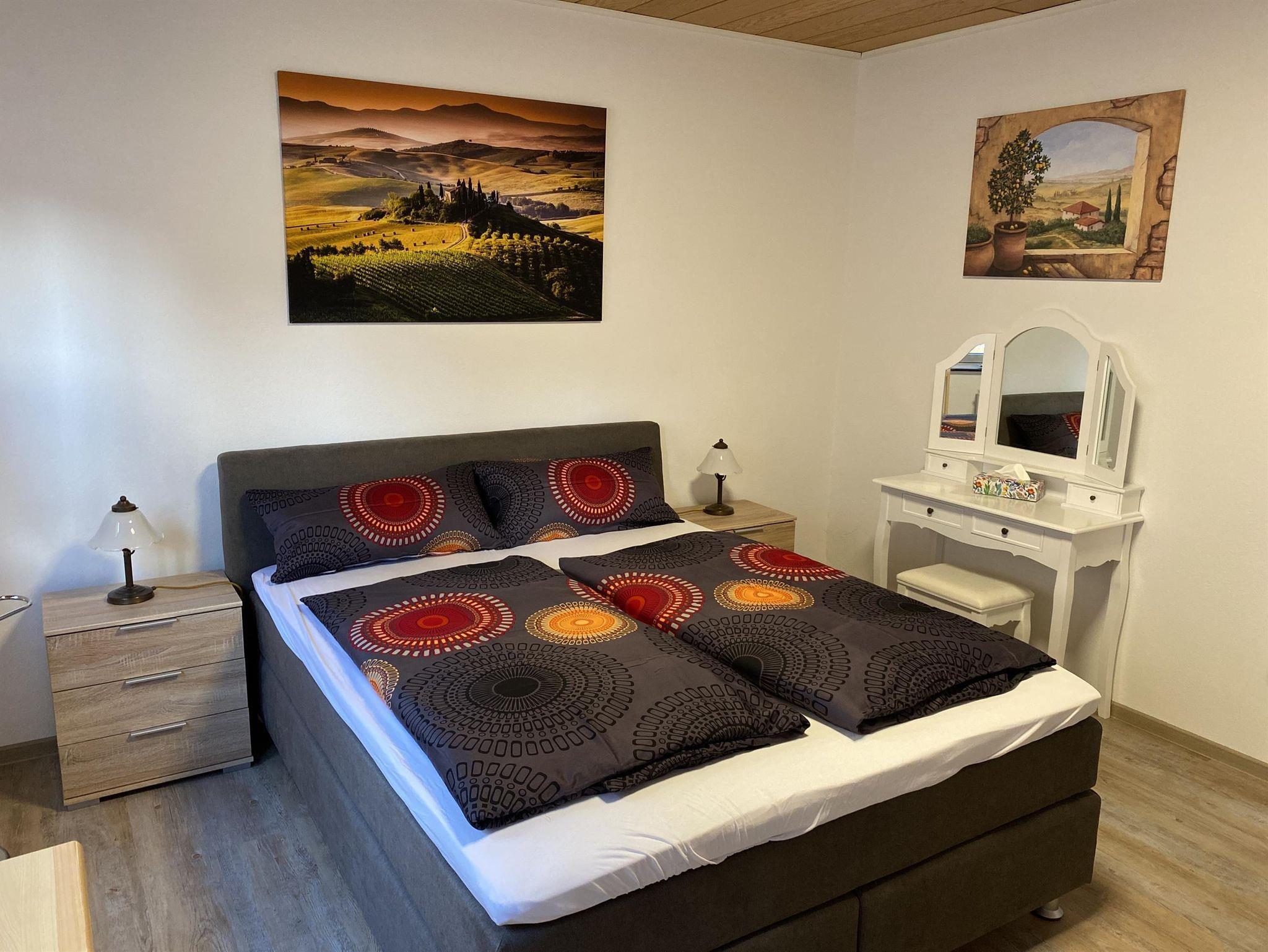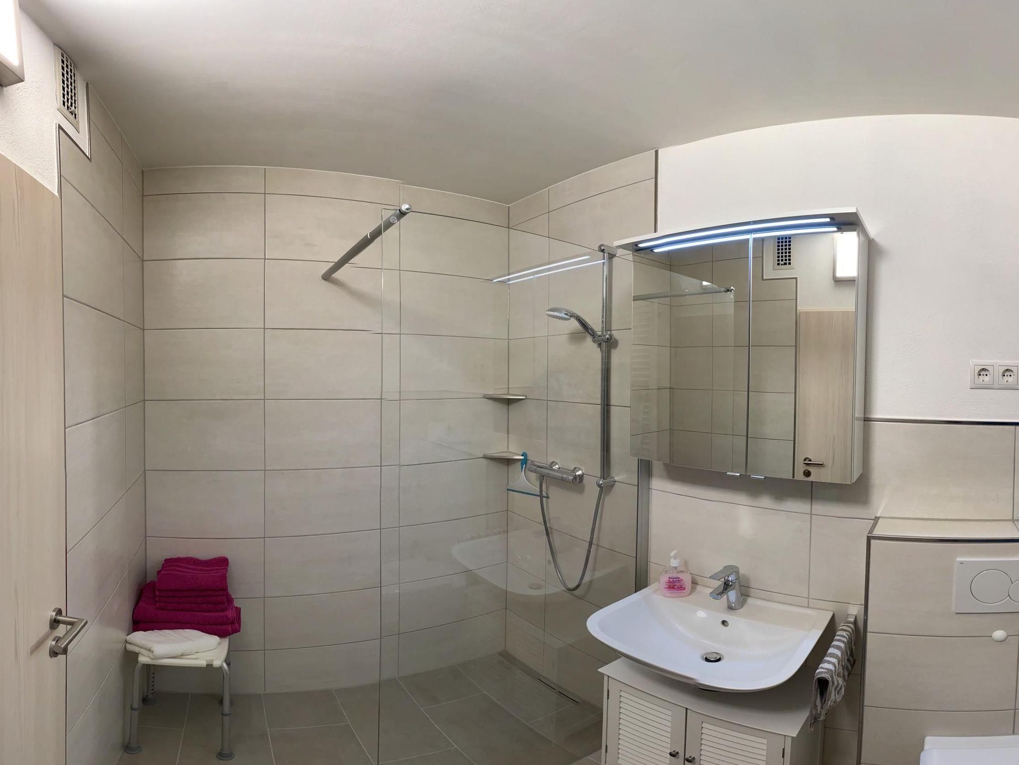 Das Schlafzimmer ist mit einem Orthopädie-Boxspringbett (1,60 x 2,00 m) und einem weiteren TV ausgestattet. Ebenfalls befinden sich dort ein Safe und ausreichend Platz für Ihre Kleidungstücke. Unser großes, neues und modernes Badezimmer mit begehbarer Dusche bietet alles, was das Herz begehrt. Zur Ausstattung gehört neben einem Sitzhocker auch ein Fön.
