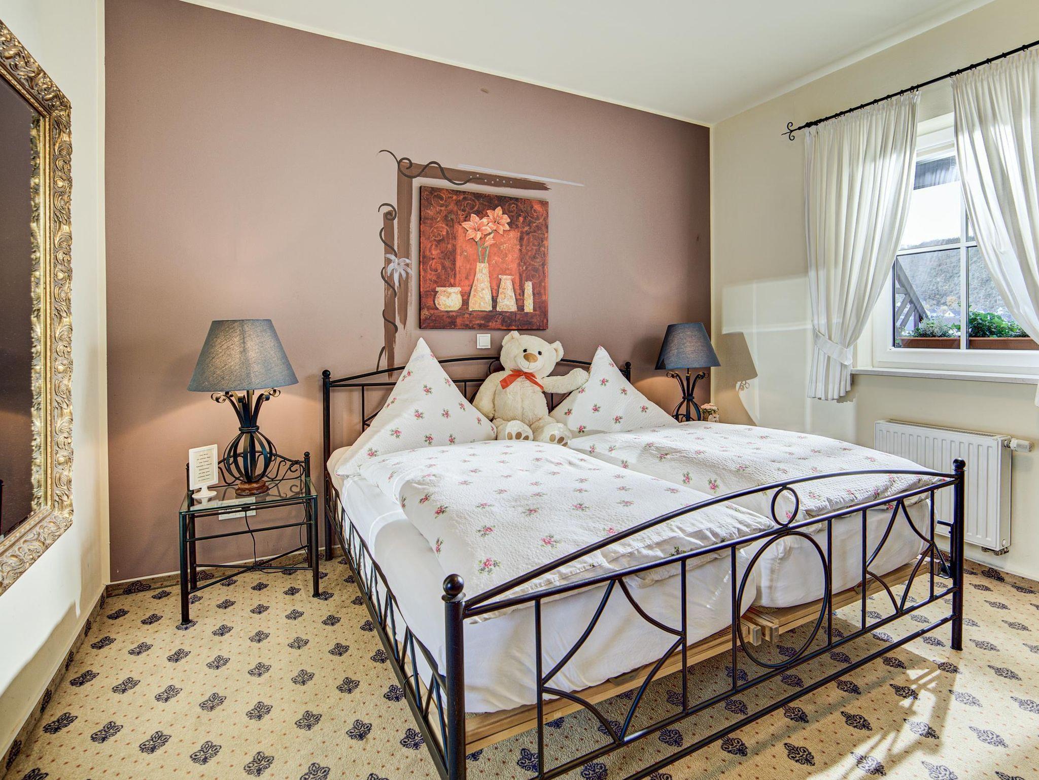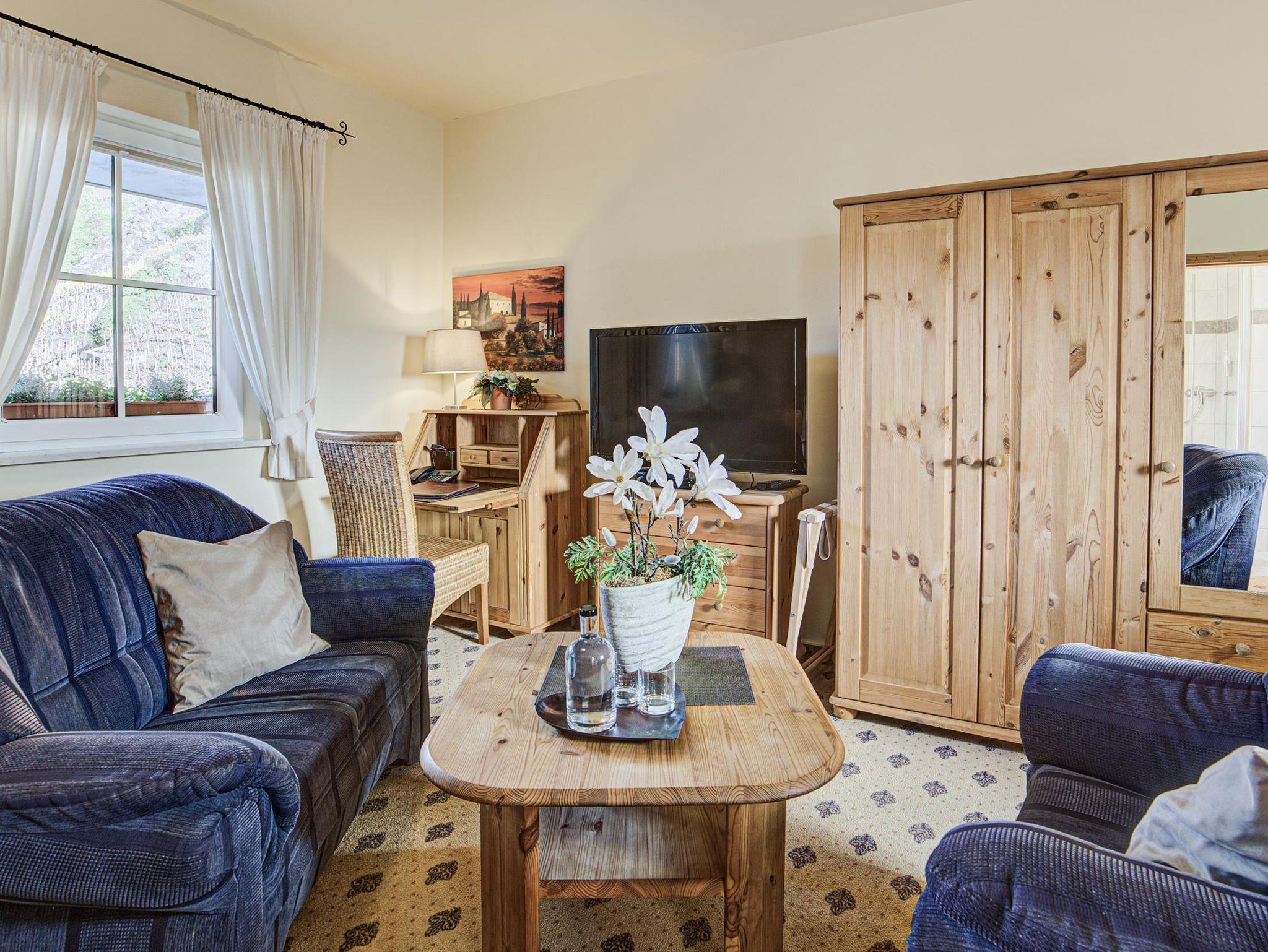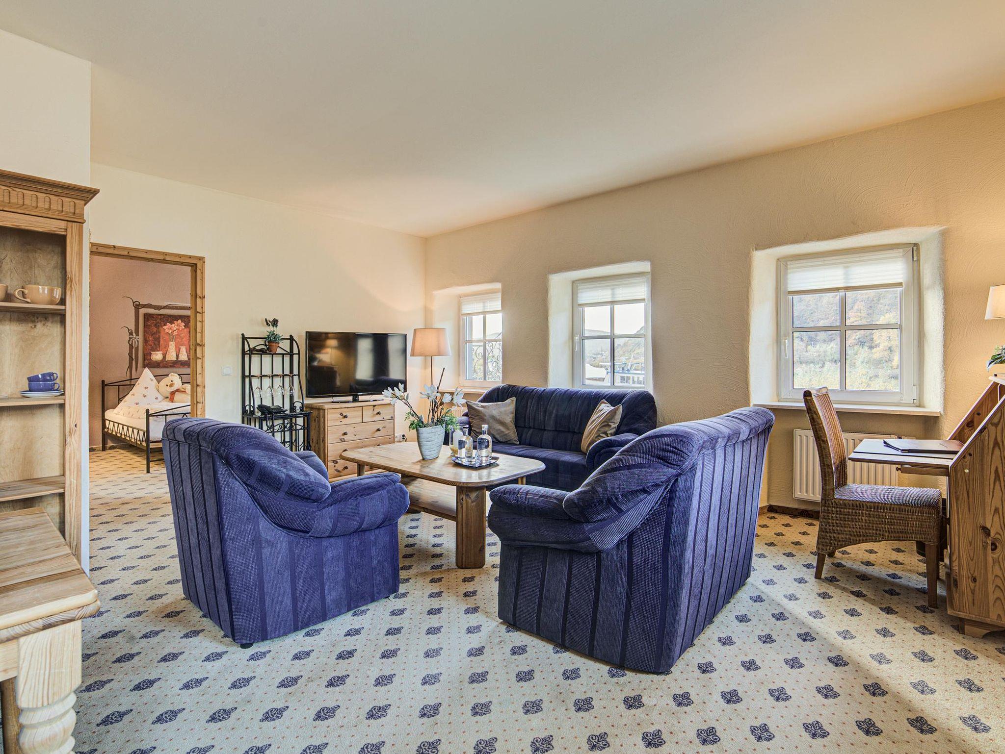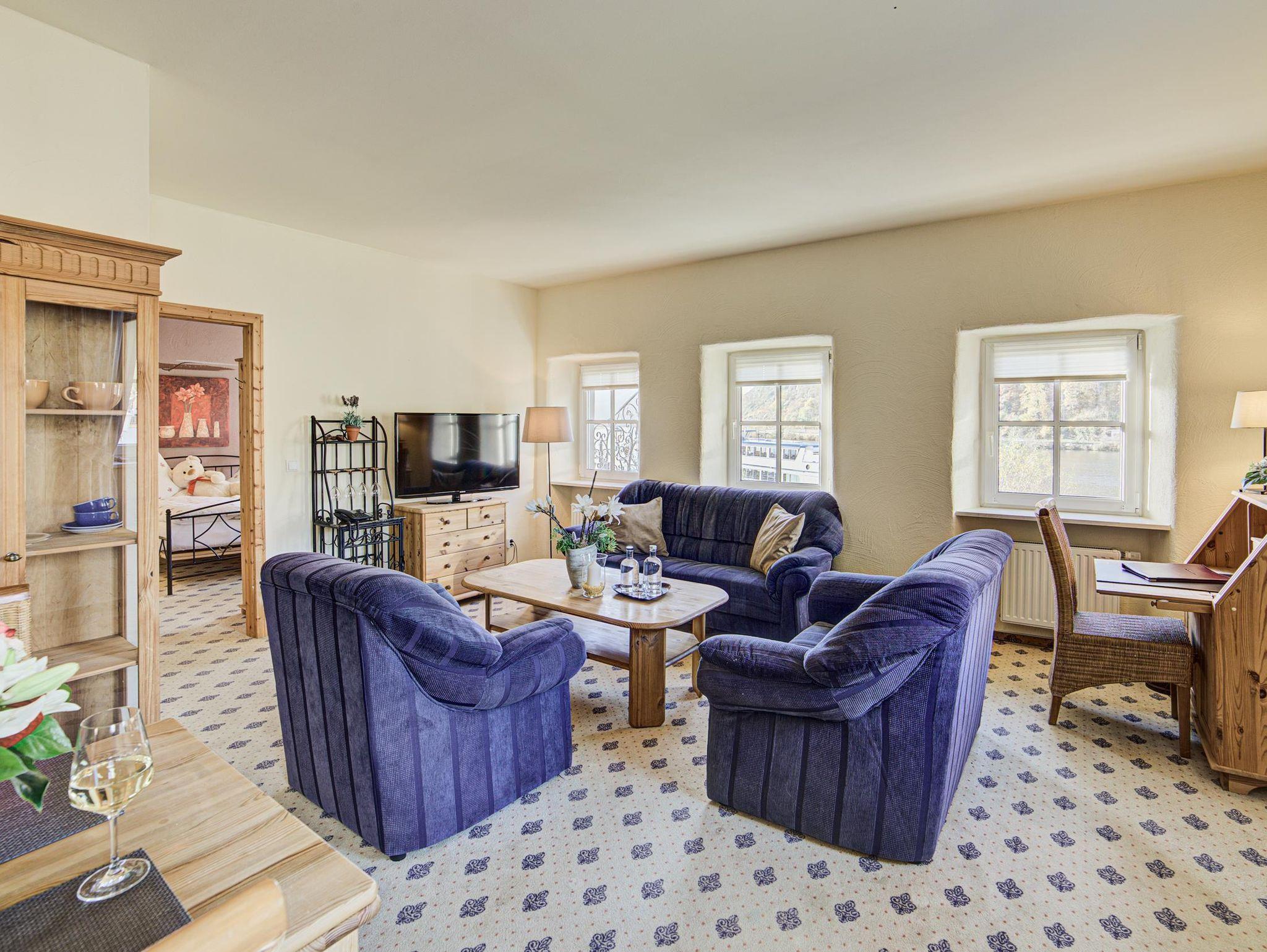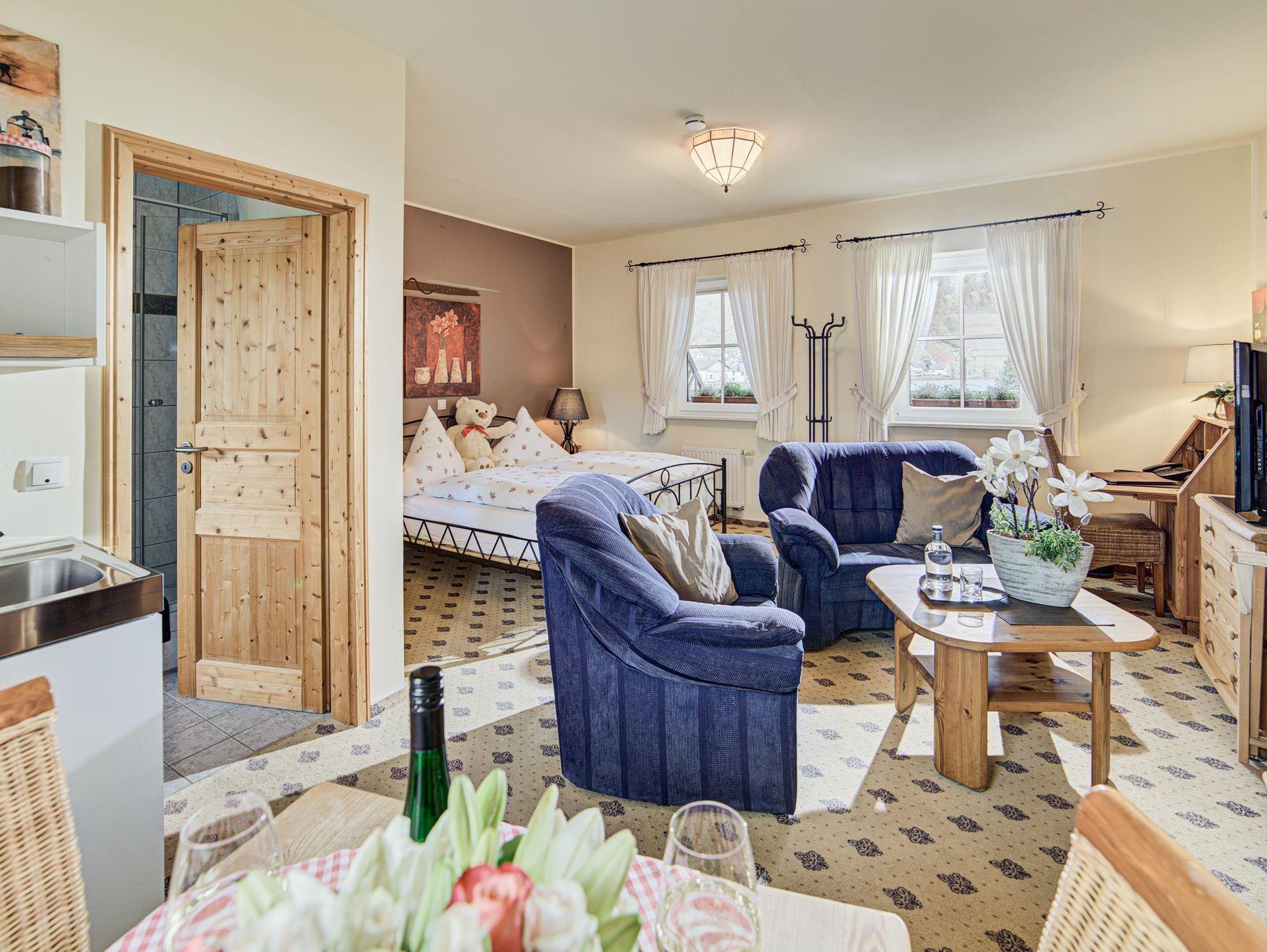 Unser Apartment Nr. 3 liegt im 1. OG und bietet Ihnen einen Schlaf- Wohnbereich mit Komfortbetten. Eine Kaffee- & Teeküche, Minibar und Terrasse mit Sitz- und Liegebereich sind einige der Zahlreichen Annehmlichkeiten die das Zimmer zu bieten hat. Von der Terrasse aus genießen Sie einen herrlichen Blick auf die Mosel und die teils eigenen Weinberge am Haus. Freies WLAN und kostenlose Parkplätze stehen Ihnen am Hotel kostenfrei Verfügung. Unser Täglicher Zimmerservice sorgt für gemachte Betten und steigert Ihren Wohlfühlfaktor. Durch unser Angeschlossenes Restaurant sind Sie natürlich auch bestens versorgt. Hier laden wir Sie ein, die kulinarischen Köstlichkeiten unserer Region mit spitzen Weinen zu genießen.