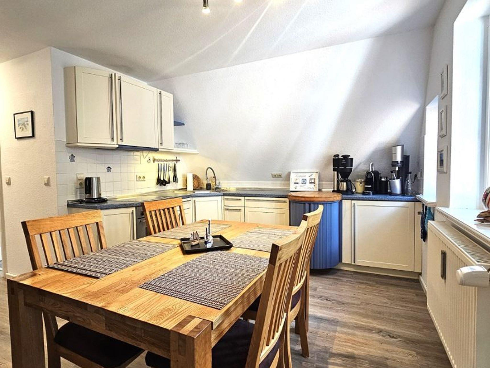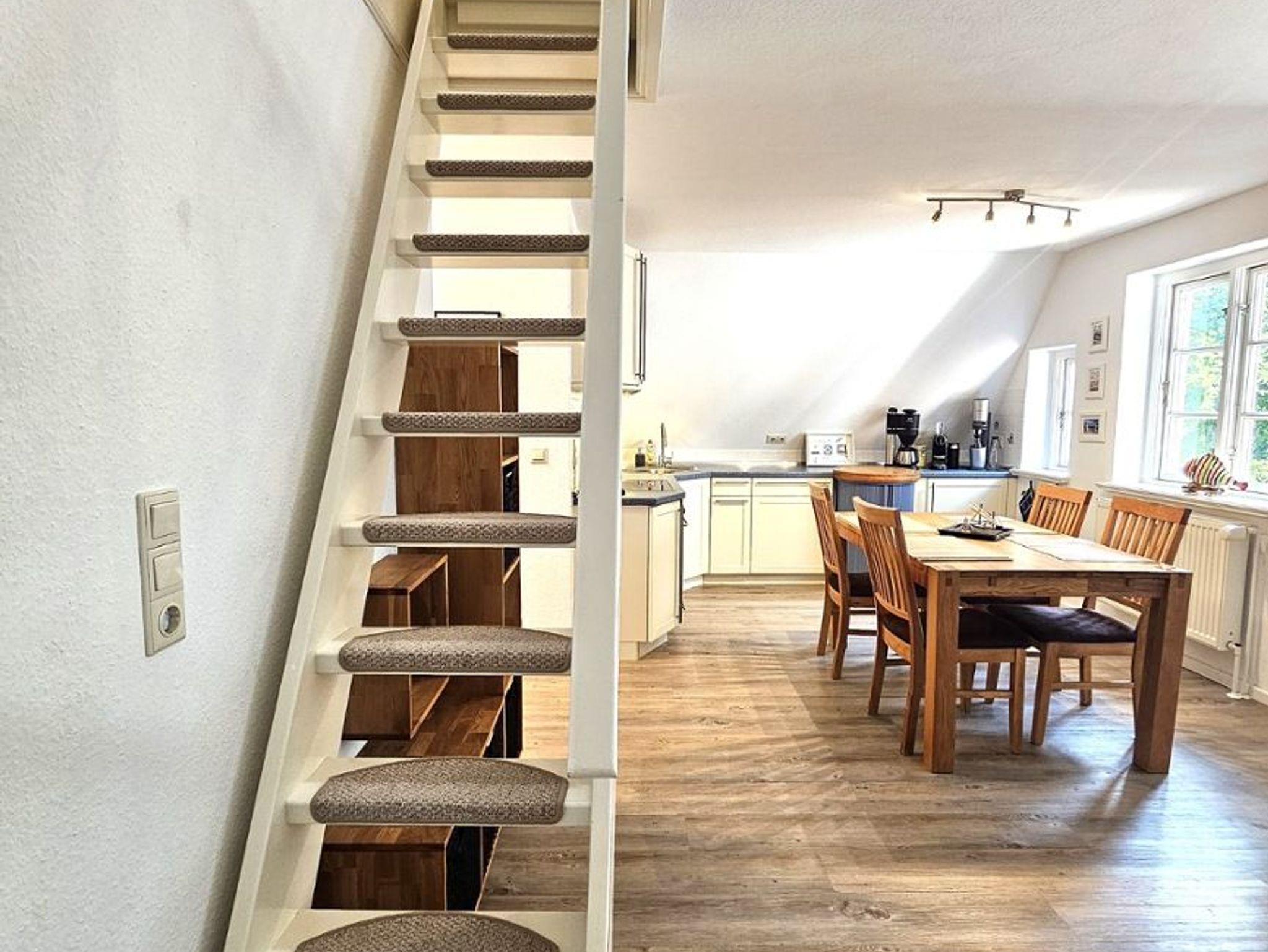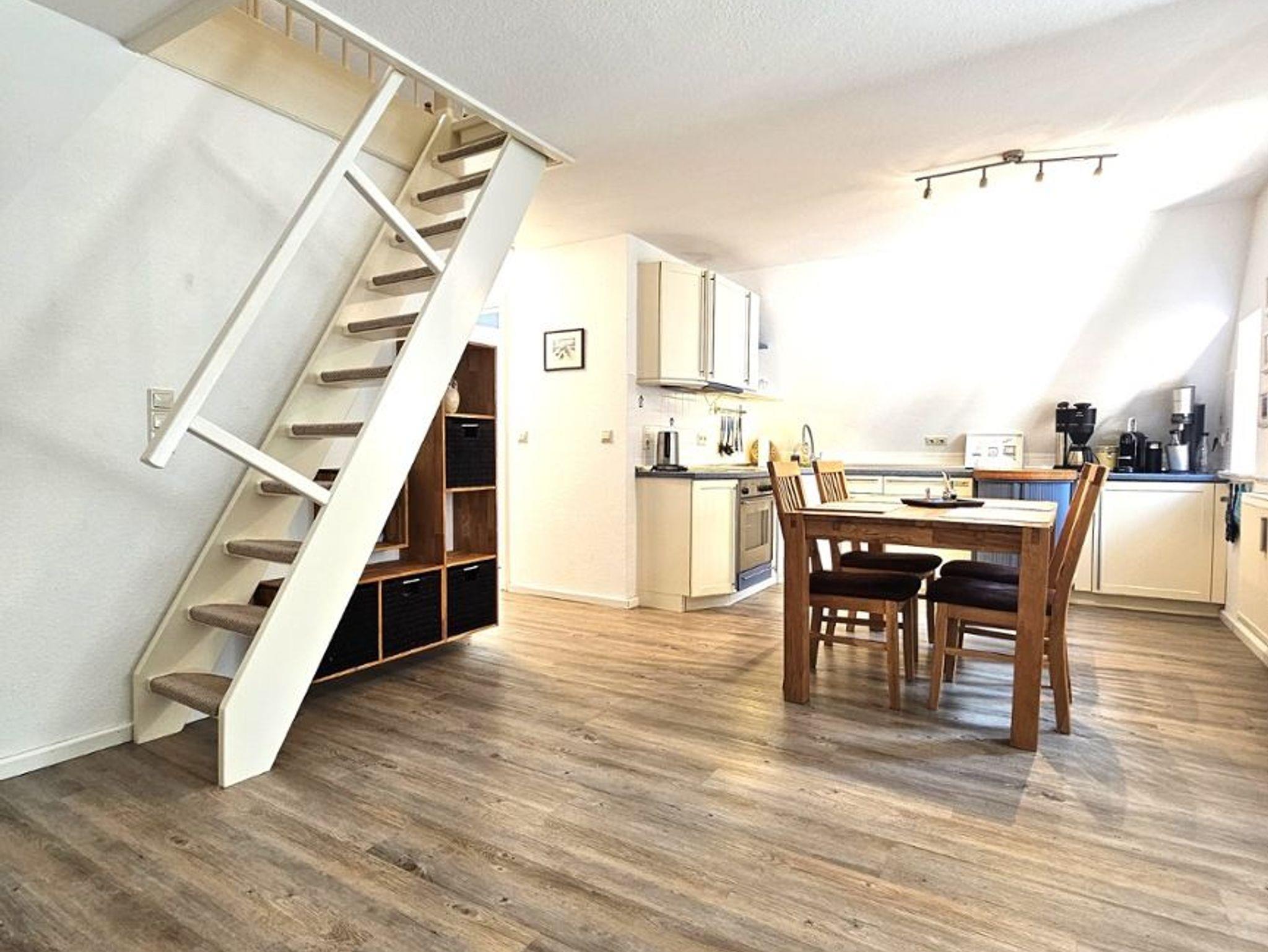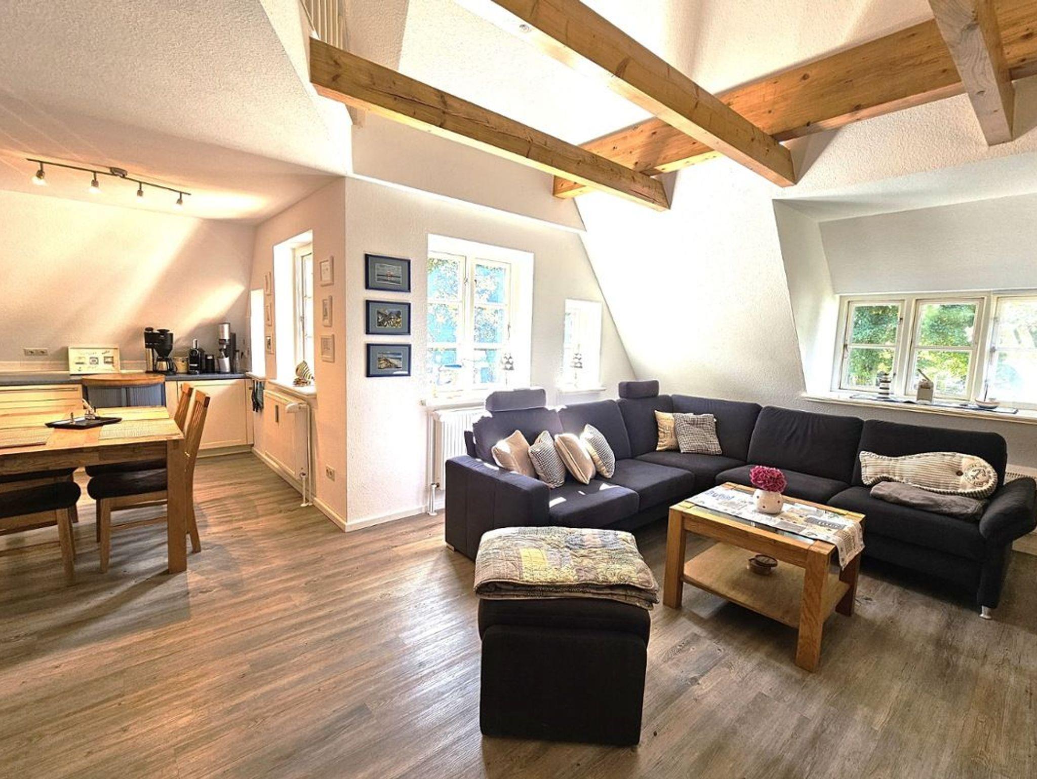 Die moderne und komfortable Ferienwohnung befindet sich unter Reet im 1. OG und bietet Platz für bis zu 4 Personen. Die komplett eingerichtete Küche enthält neben einem Backofen und Geschirrspüler auch eine Nespressomaschine und einen Sodastream. Die Wohnung verfügt über ein Schlafzimmer mit Doppelbett. Vom Wohnzimmer gelangen Sie über eine kleine Treppe in die offene Galerie, in der sich zwei Einzelbetten befinden. Ein eigener Parkplatz und eine eigene Terrasse stehen Ihnen vor dem Haus zur Verfügung.