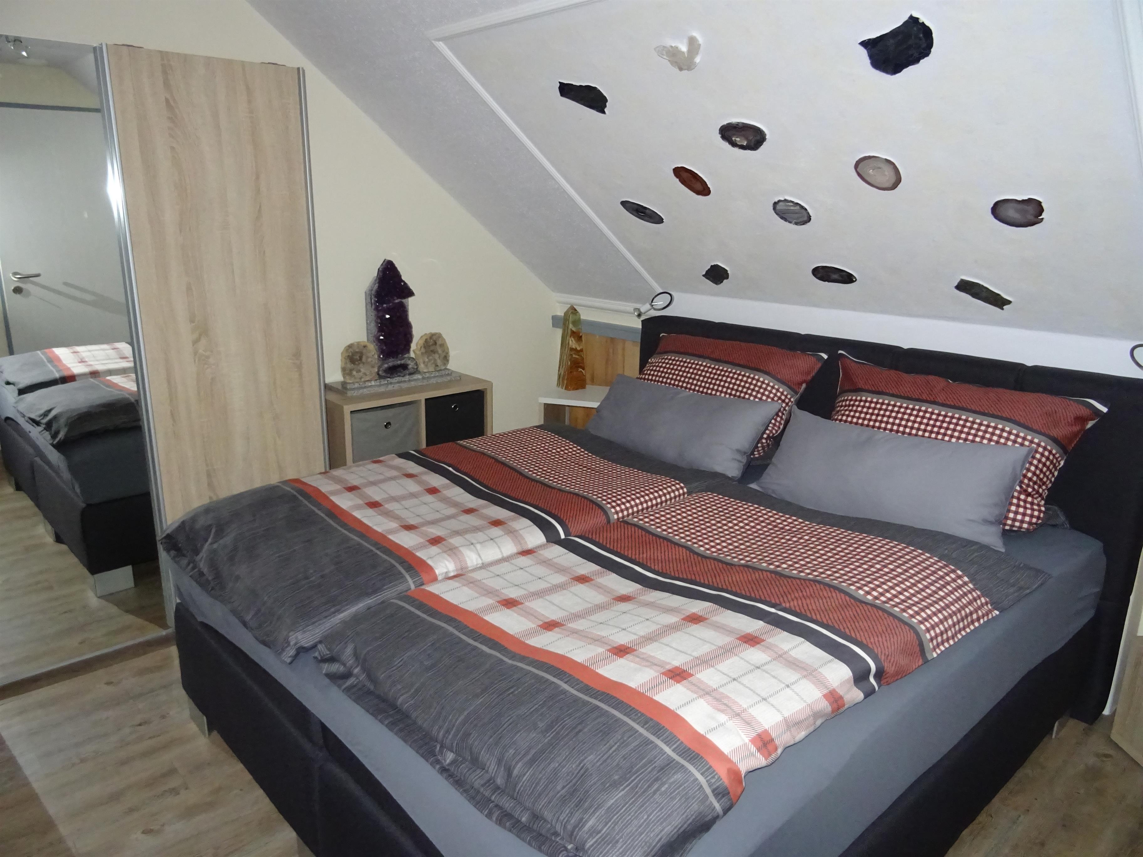 2. Stockwerk, Wohnraum mit Kaminofen und Küchenecke mit Essbereich, Bad mit sep. Toilette, ein Schlafzimmer mit Boxspring-Doppelbett und Schwebetürenschrank, zweites offenes Schlafzimmer im Maisonette mit zwei Boxspring-Einzelbetten, 7m² großer Balkon mit einmaligem Ausblick