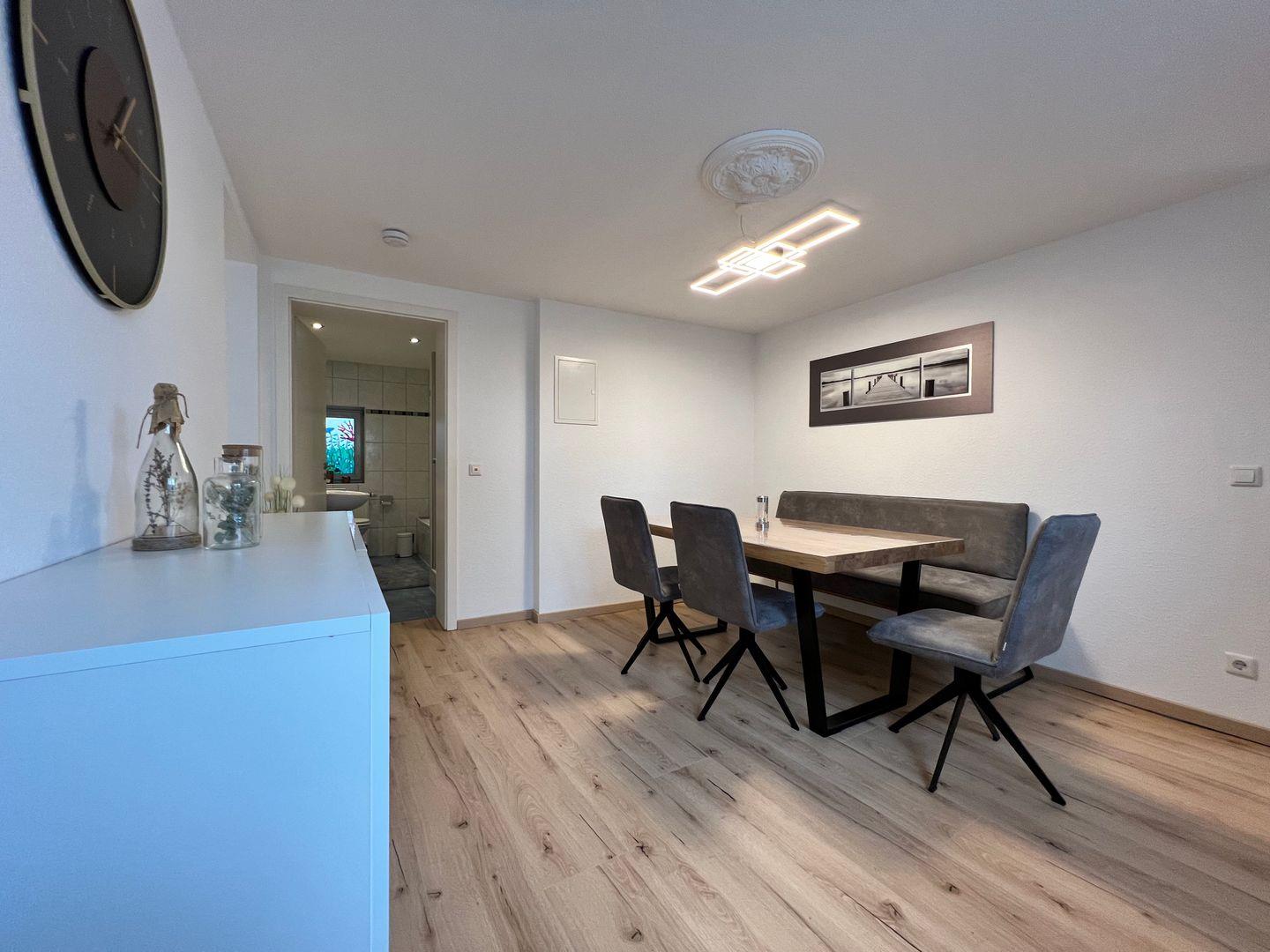 Beim Betreten der Ferienwohnung werden Sie von einem freundlichen und lichtdurchfluteten Ambiente begrüßt. Die Verwendung von Holz in der Möblierung vermittelt eine natürliche und gemütliche Atmosphäre. Die geschmackvolle Einrichtung zieht sich durch alle Räume der Ferienwohnung und schafft ein harmonisches Gesamtbild. Von den bequemen Sitzmöglichkeiten im Wohnzimmer über den stilvollen Essbereich bis hin zu den liebevoll gestalteten Schlafzimmern - überall wird Ihnen ein modernes und gleichzeitig maritimes Flair geboten. Zudem ist die Wohnung kinderfreundlich gestaltet, um den Kleinen einen angenehmen Aufenthalt zu ermöglichen. Die Verbindung von moderner Ausstattung, maritimen Akzenten und der Verwendung von Holz in der Ferienwohnung SEEGlück schafft eine einladende und behagliche Atmosphäre. Hier können Sie sich nach einem ereignisreichen Tag am Bodensee zurücklehnen, entspannen und den besondere Charme dieser liebevoll gestalteten Unterkunft genießen.