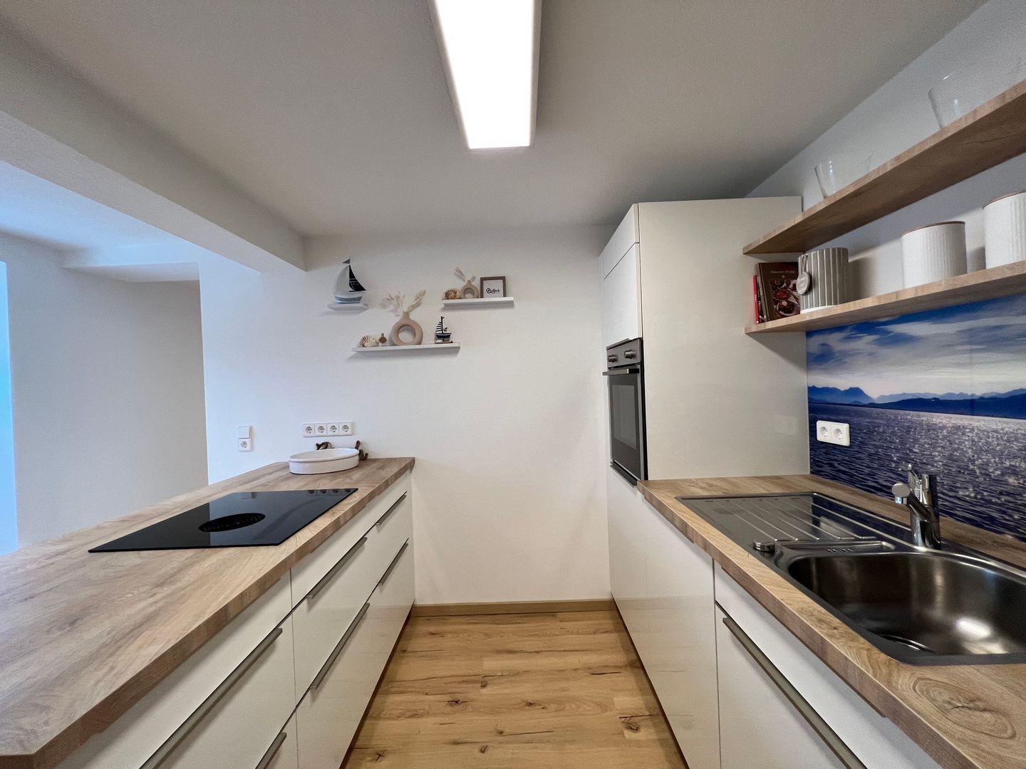 Die Ferienwohnung beeindruckt mit einer neuen Küche, die mit einer stilvollen Kücheninsel ausgestattet ist. Die Küche in der Ferienwohnung SEEGlück lässt keine Wünsche offen und ist mit einer Vielzahl von modernen Annehmlichkeiten ausgestattet. Zu den Ausstattungsmerkmalen der Küche gehören eine praktische Pad-Kaffeemaschine und ein Wasserkocher, um Ihren Tag mit einer aromatischen Tasse Kaffee oder Tee zu beginnen. Ein Herd und ein Backofen stehen Ihnen ebenfalls zur Verfügung, damit Sie Ihre Lieblingsgerichte zubereiten können. Um den Komfort weiter zu erhöhen, ist die Küche mit einer Spülmaschine sowie einer Waschmaschine ausgestattet. Die Küche verfügt zudem über eine großzügige Auswahl an Geschirr und Küchenutensilien. Hier können Sie Ihre kulinarischen Kreationen zubereiten und den Essbereich genießen, der sich harmonisch in das offene Wohnzimmer integriert.