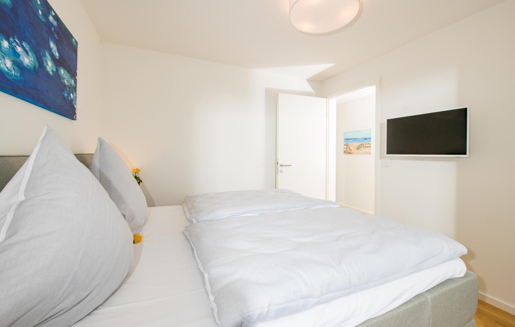 Det hyggelige soveværelse, udstyret med en dobbeltseng med boxspring og et ekstra fladskærms-tv, giver mulighed for en afslappende søvn. Endnu en seng i fuld størrelse (soveareal: 160 x 200 cm) er tilgængelig på den komfortable boxspringsofa i stuen.