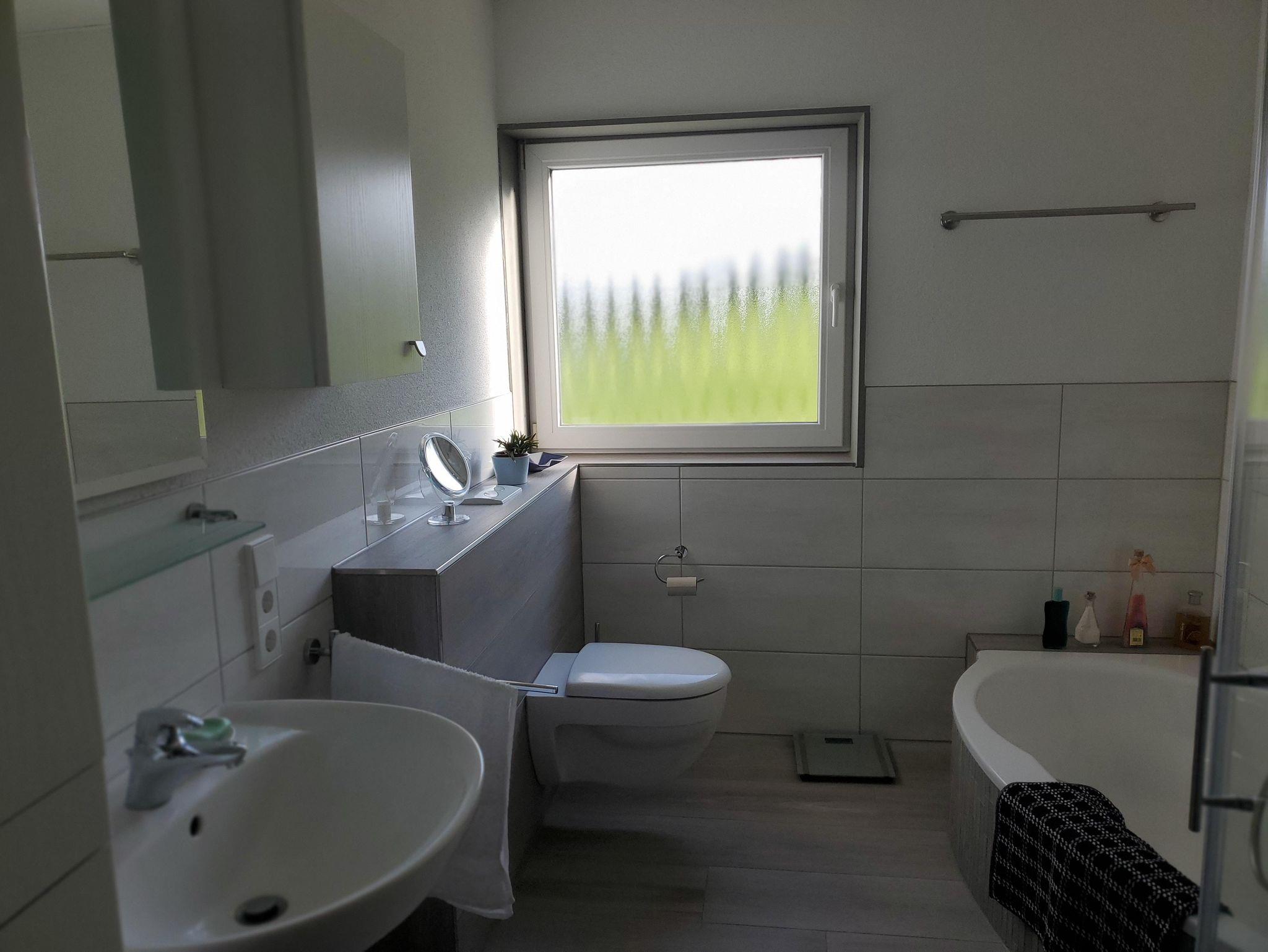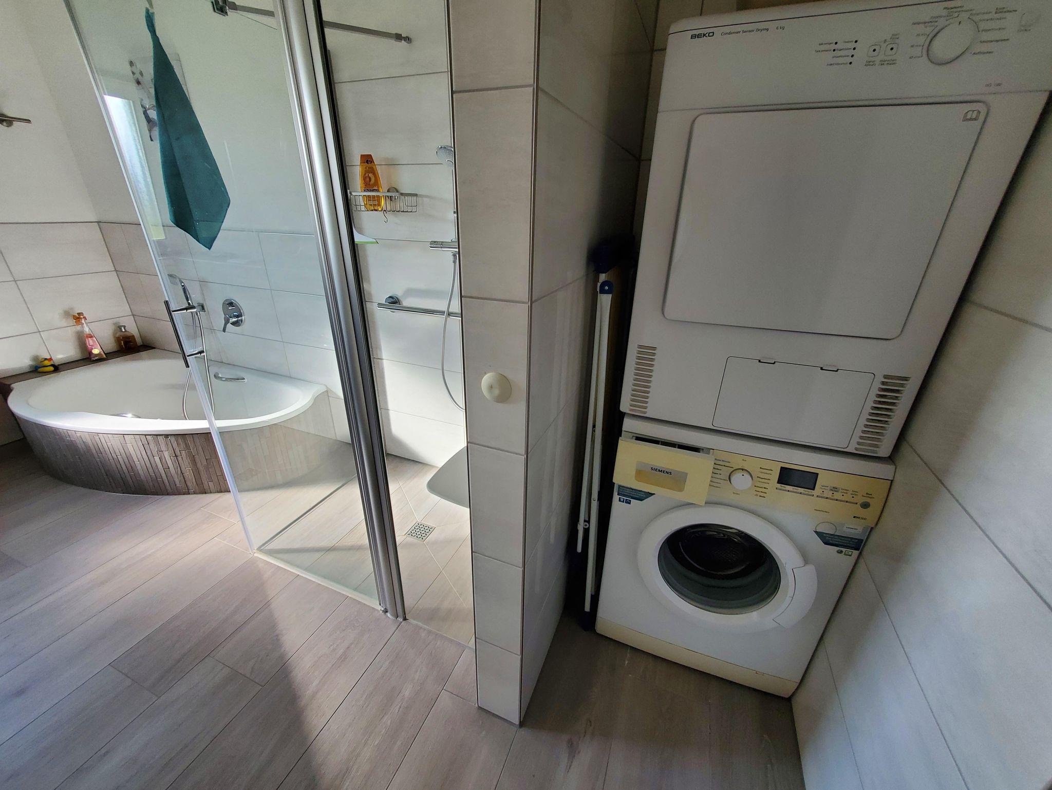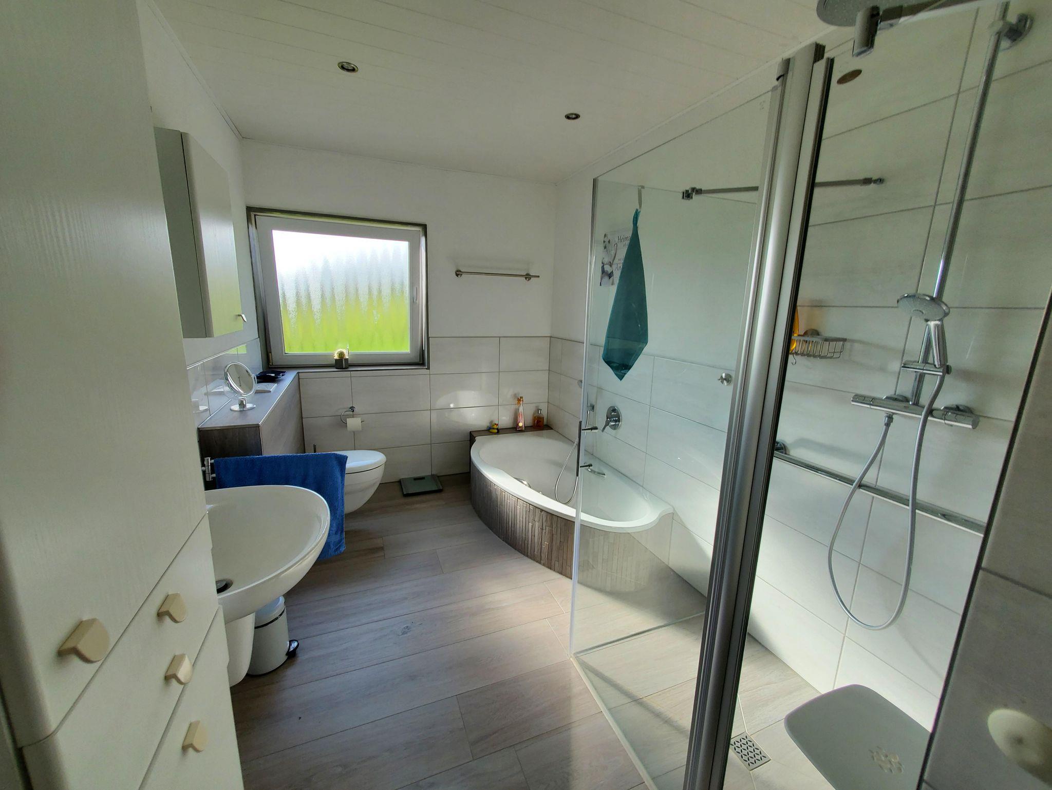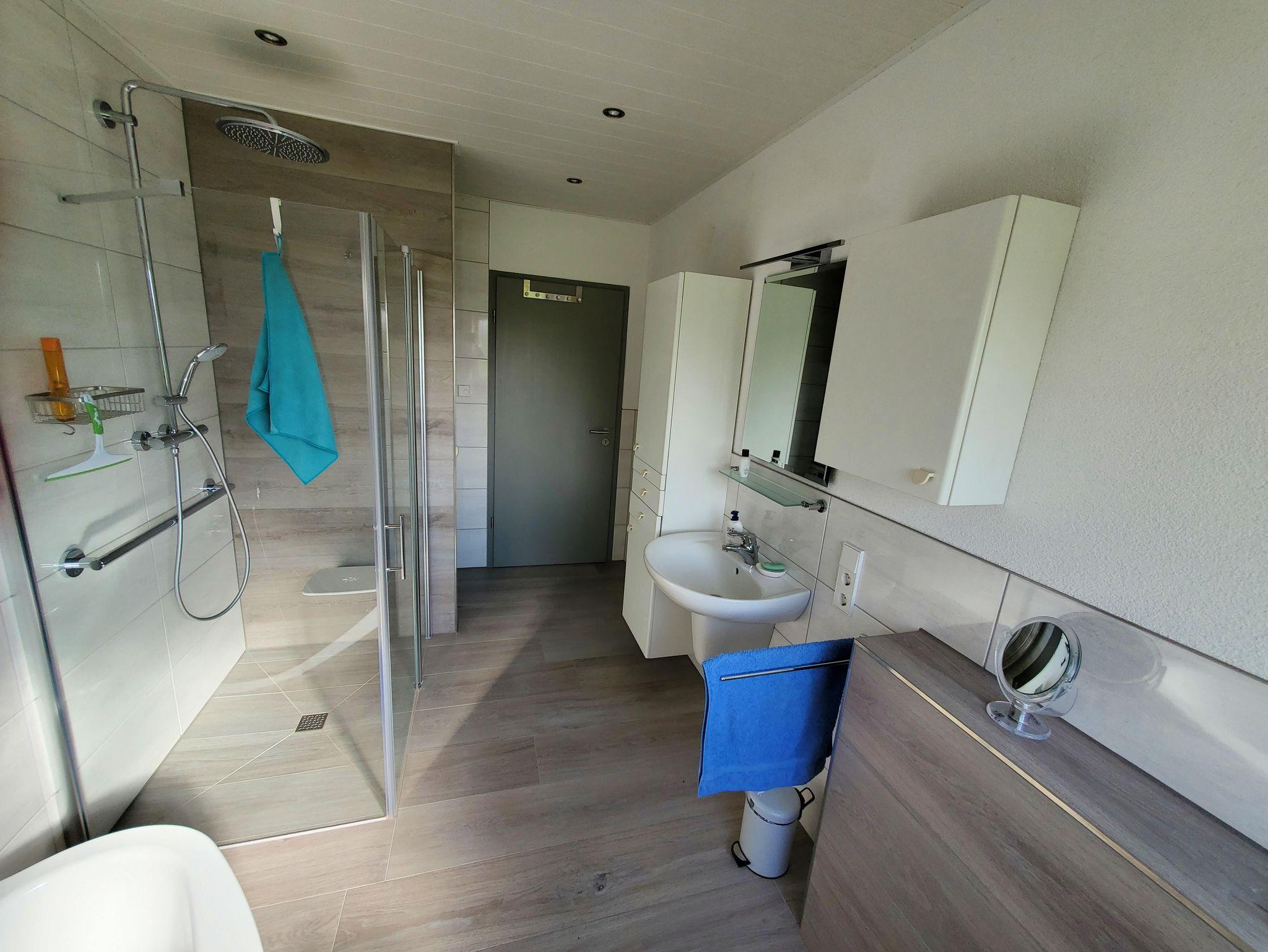 - Bad mit Badewanne und bodengleicher Dusche mit Duschklappsitz