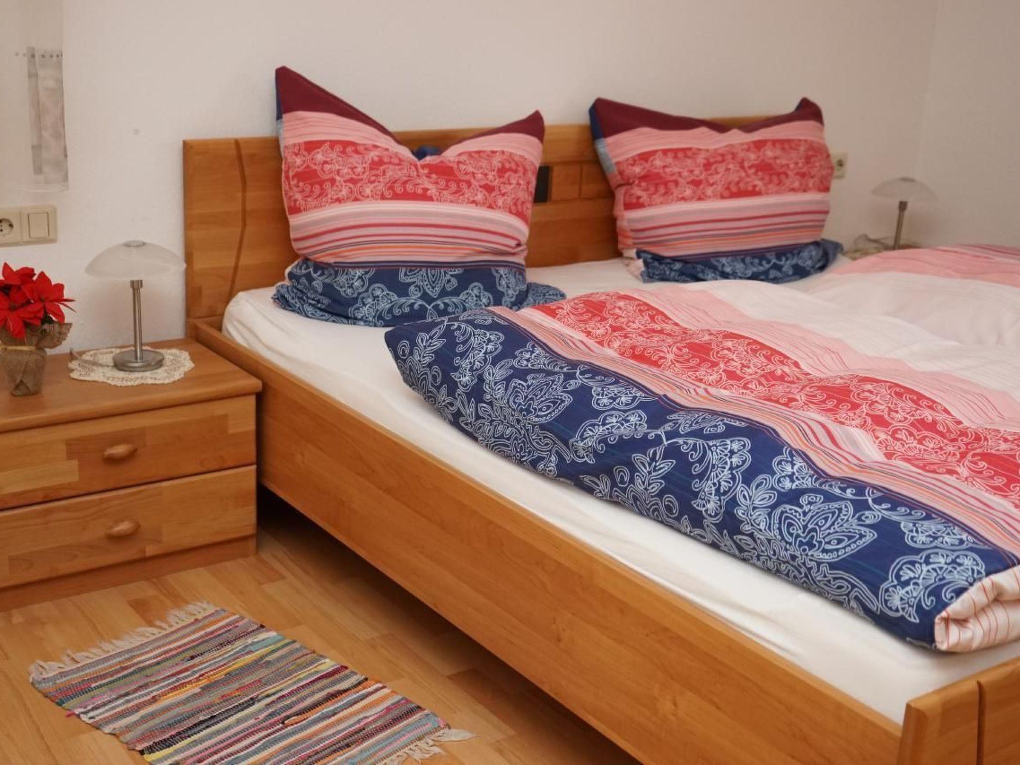 The holiday flat has two large bedrooms, each with a double bed (1.80 m width) and a large wardrobe. If required, the seating area in the living room can be extended to sleep two people.
