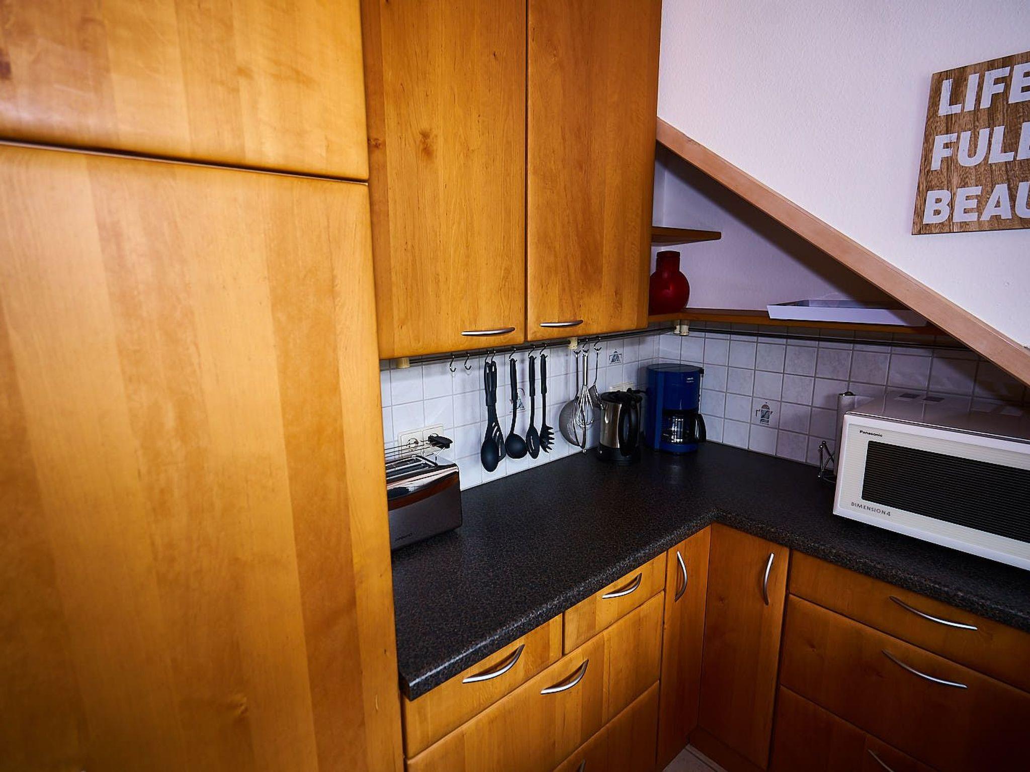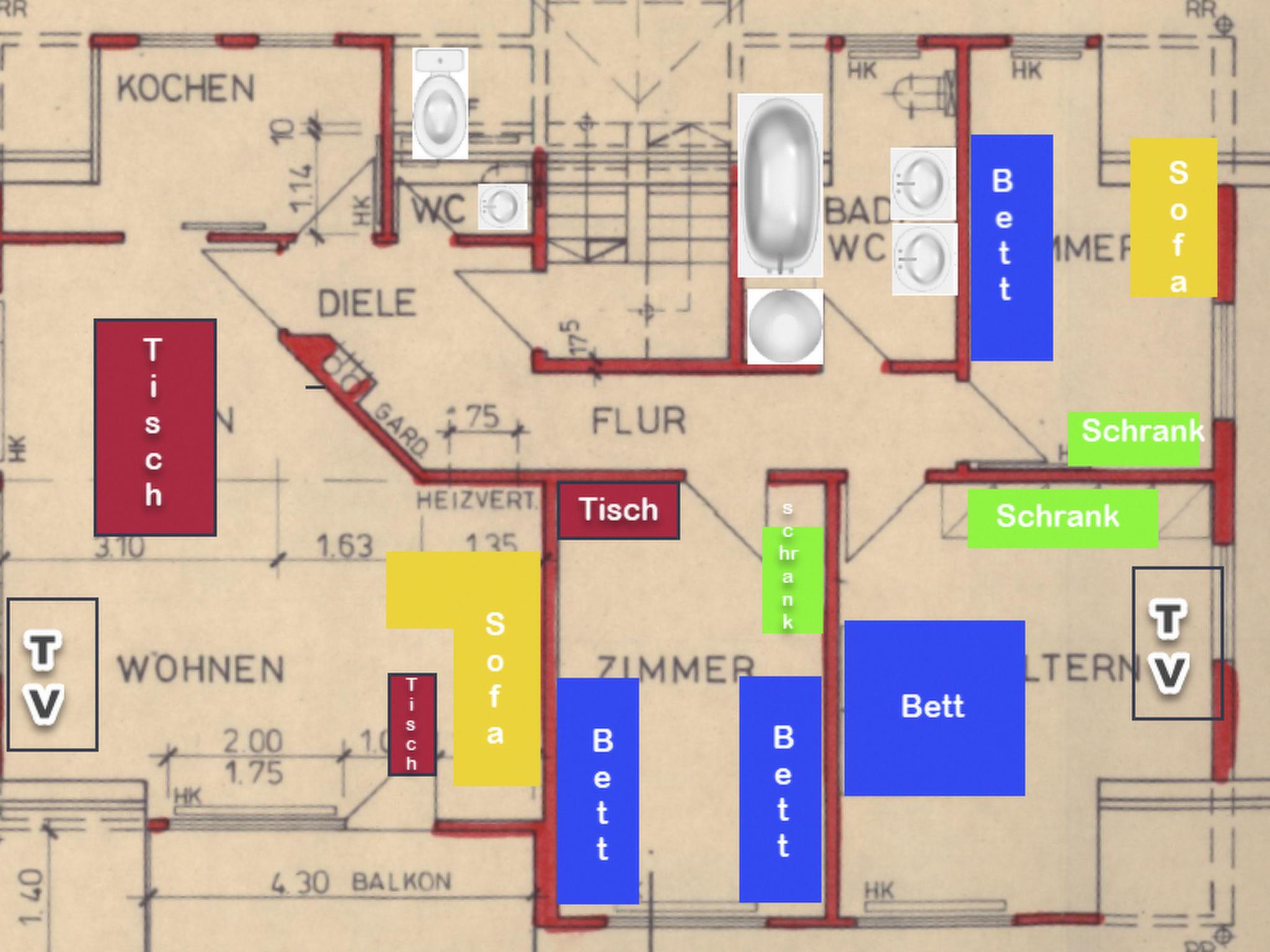 Inside, the 103 m² flat boasts cosy, high-quality furnishings. The living room invites you to relax with a cosy sofa, a large TV with satellite channels and free WiFi. A dining area for 6 people is available for communal meals. There are three bedrooms for sleeping: one with a large double bed, TV and spacious wardrobe, another with two single beds and a wardrobe and a third with a bunk bed, which also offers adults a comfortable night's sleep, and a small sofa. The kitchen is fully equipped with a fridge, oven, microwave, 4-ring hob, coffee machine, espresso machine (Nespresso), toaster and kettle. The interior is complemented by a spacious bathroom with shower, bathtub, two washbasins, WC and an additional guest WC.
