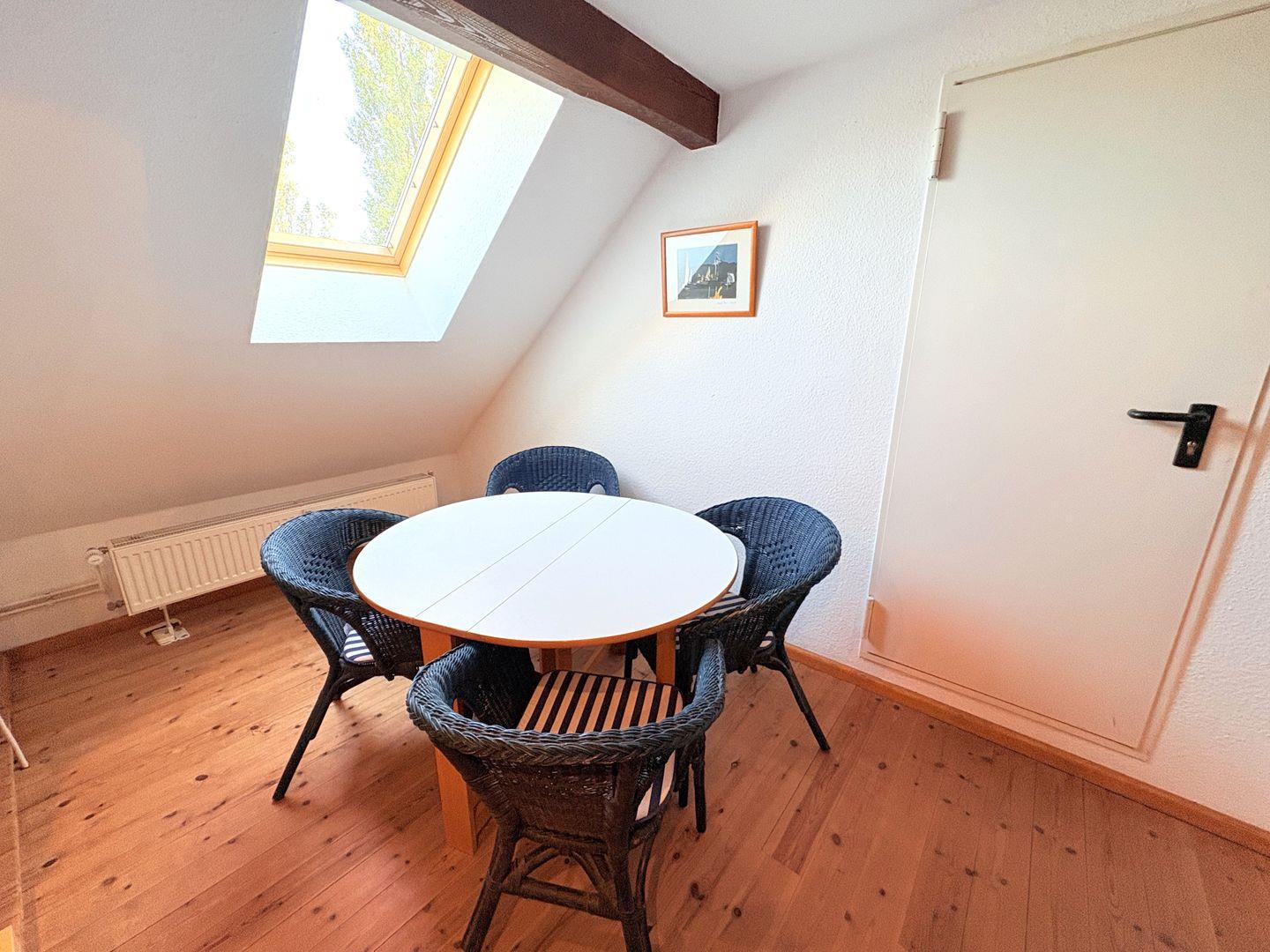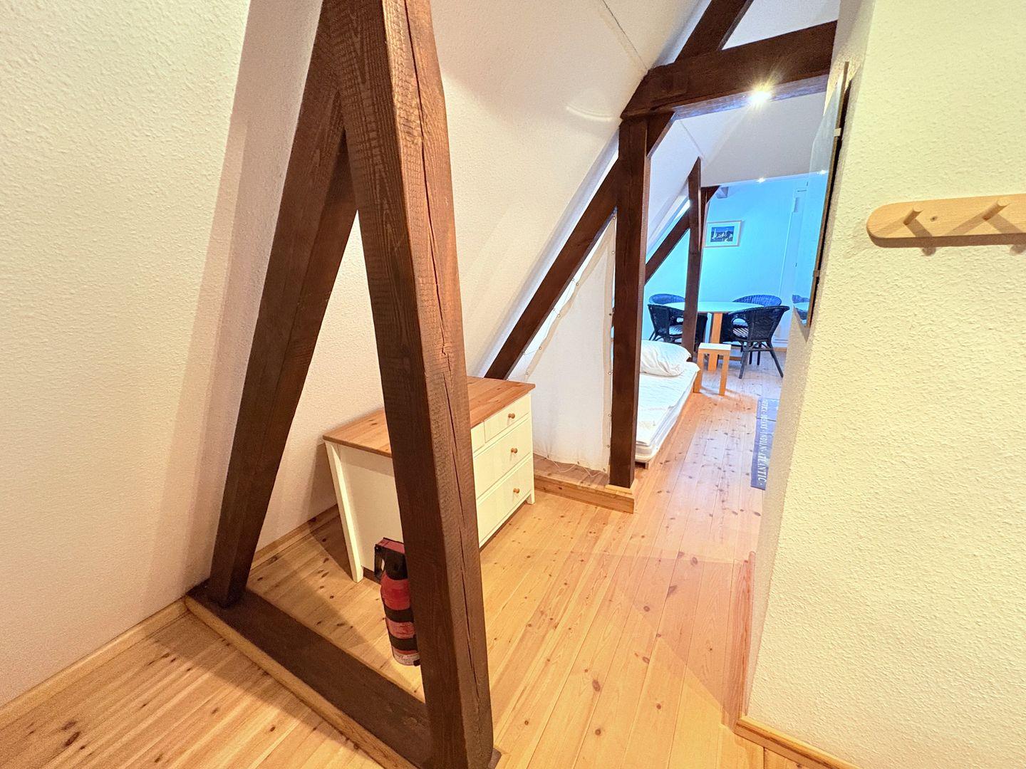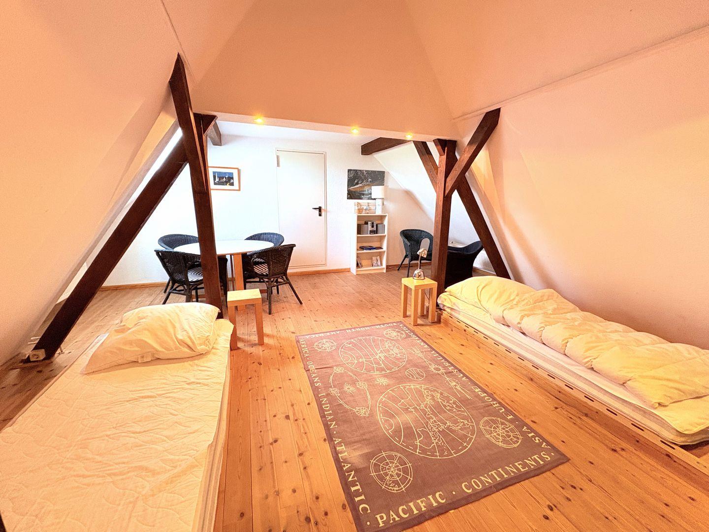 Ein gemütliches Schlafzimmer für zwei Personen liegt ebenfalls auf der ersten Etage, sowie das Badezimmer mit Dusche & WC. Eine Wendeltreppe führt nach oben zu einem großzügigen Wohn- und Schlafraum für weitere drei Personen. Schräge Wände, Dachbalken und eine weitere Sitzecke geben der oberen Etage eine sehr besondere Atmosphäre.