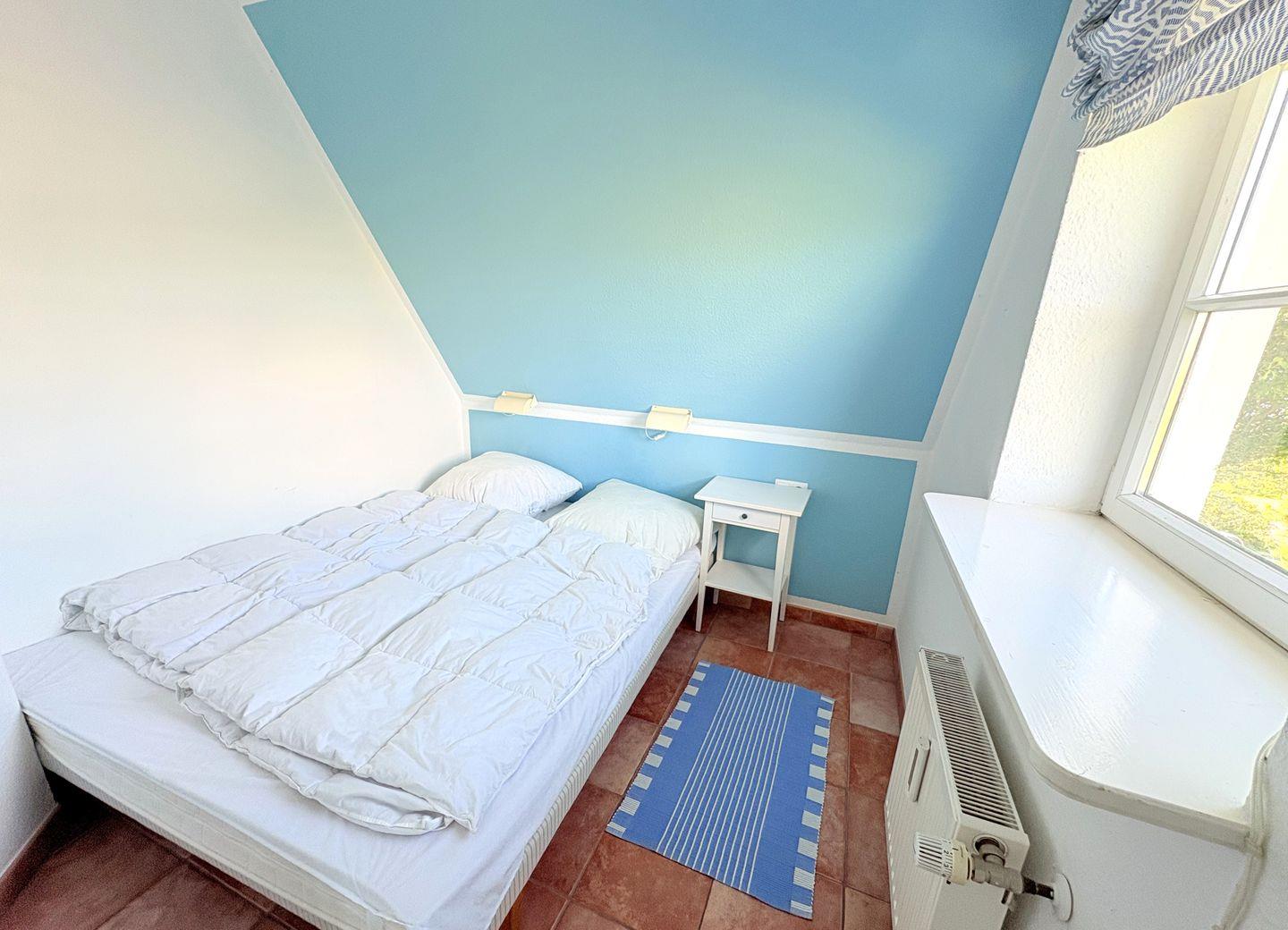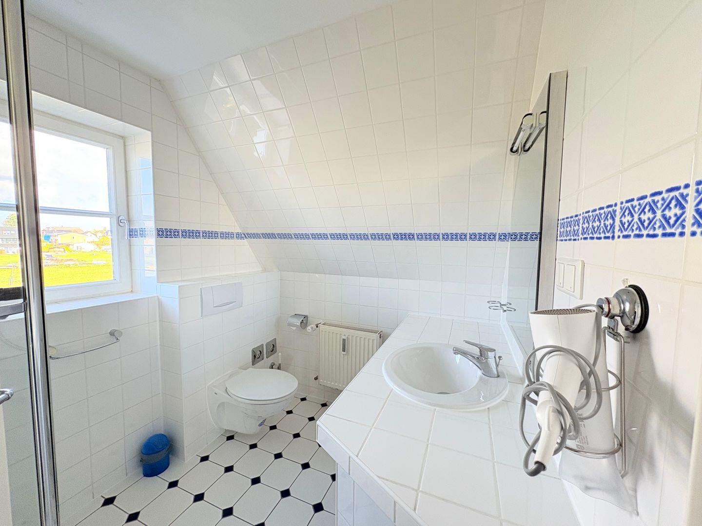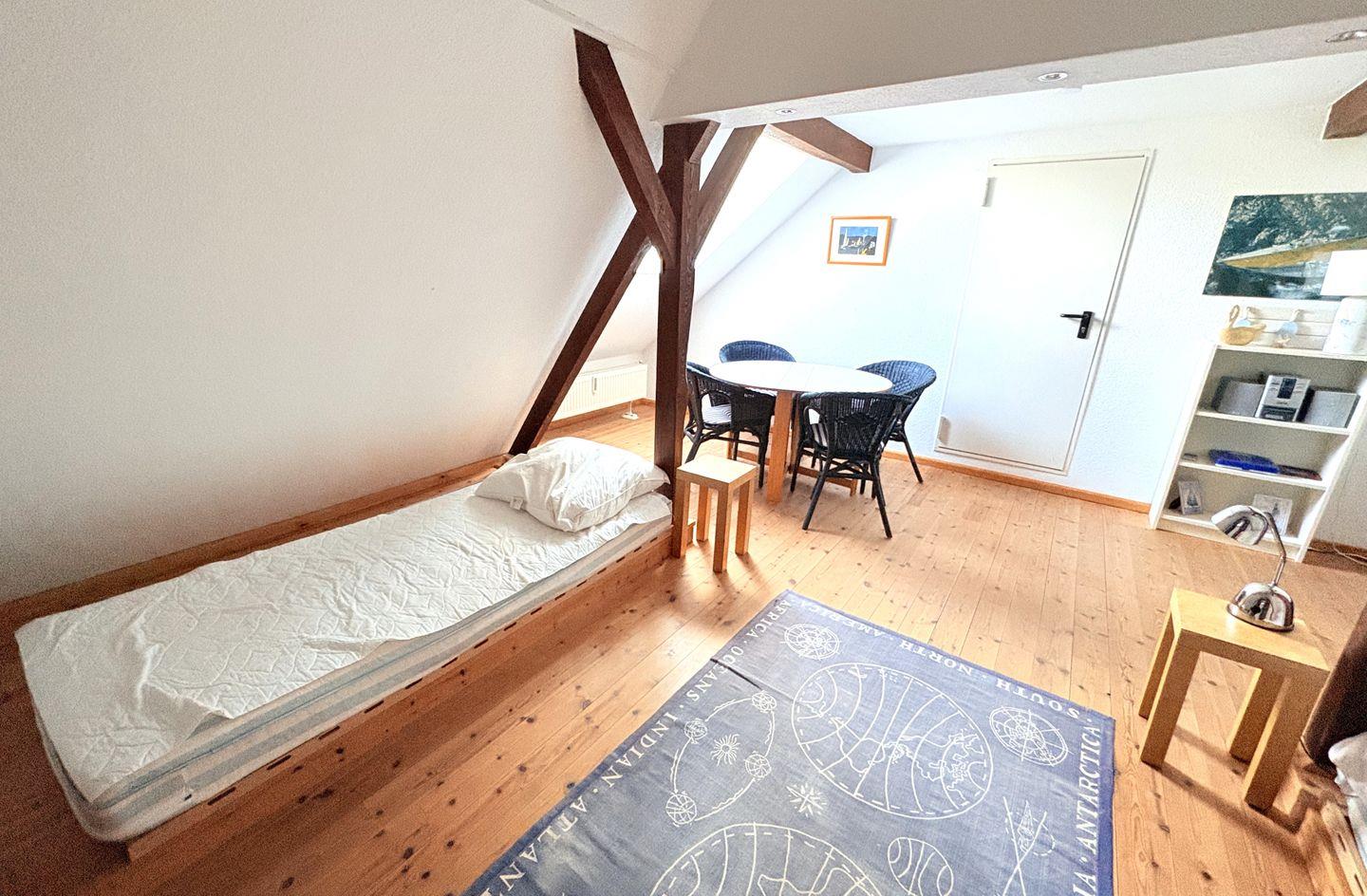 Ein gemütliches Schlafzimmer für zwei Personen liegt ebenfalls auf der ersten Etage, sowie das Badezimmer mit Dusche & WC. Eine Wendeltreppe führt nach oben zu einem großzügigen Wohn- und Schlafraum für weitere drei Personen. Schräge Wände, Dachbalken und eine weitere Sitzecke geben der oberen Etage eine sehr besondere Atmosphäre.