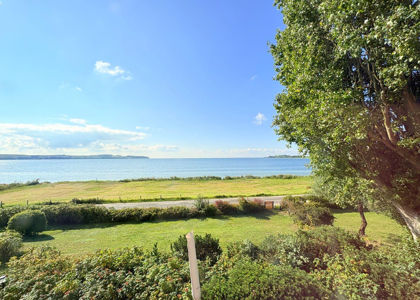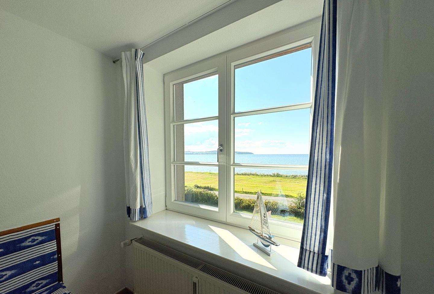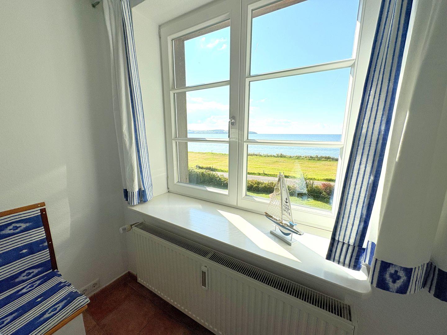Selbstverständlich bietet auch das Apartment Drachen, selbst im süßen, maritimen blau-weiß gestaltet, einen wunderbaren Blick auf Wasser.