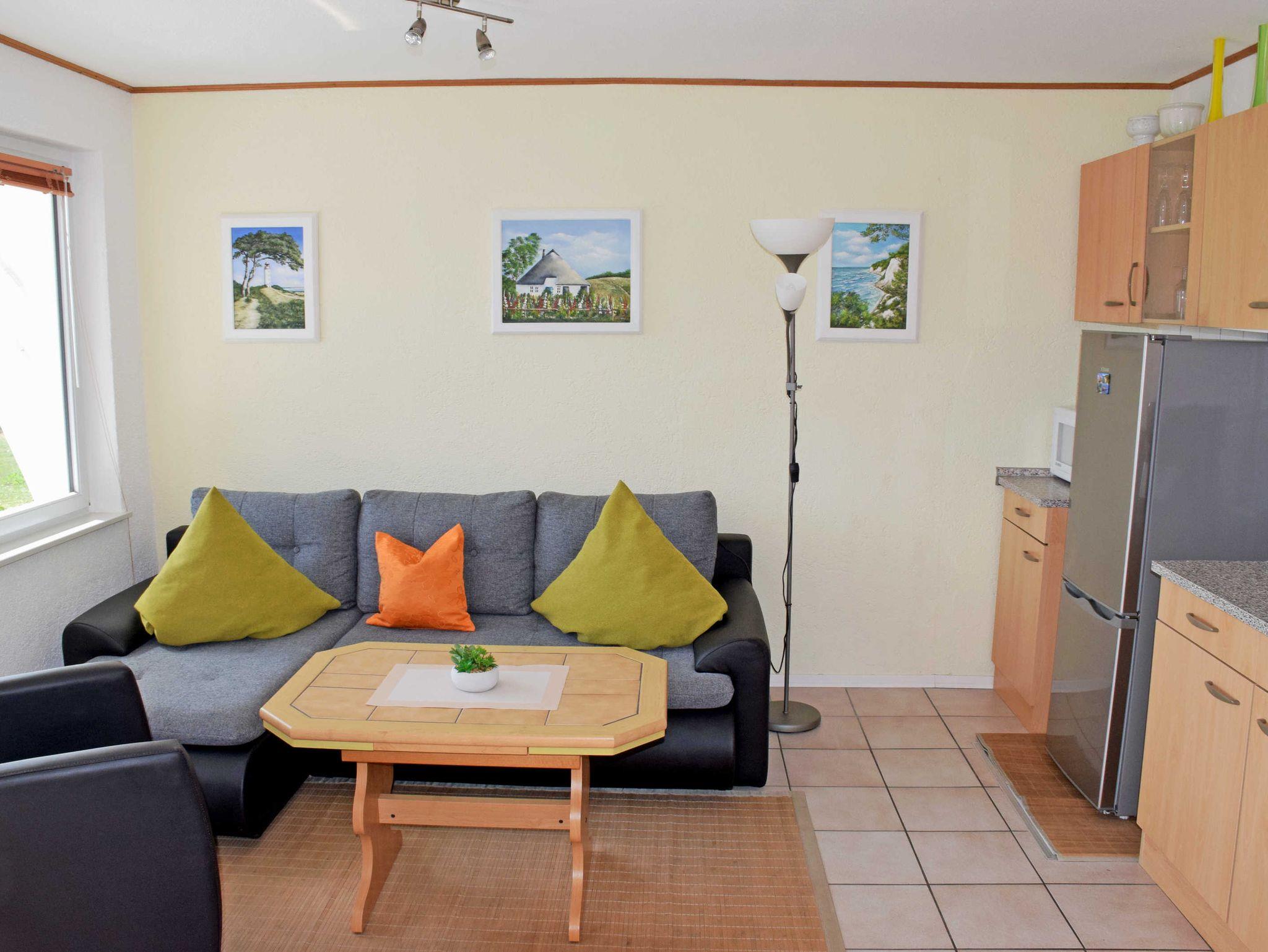 Im Wohnzimmer stehen eine Couch, Sessel und Tisch sowie und ein modernes Flachbild-TV-Gerät. Hier steht auch ein Esstisch mit Stühlen. Aus dem Wohnzimmer heraus hat man einen schönen Ausblick über den Sund nach Stralsund. WLAN kann kostenfreu mitgenutzt werden.