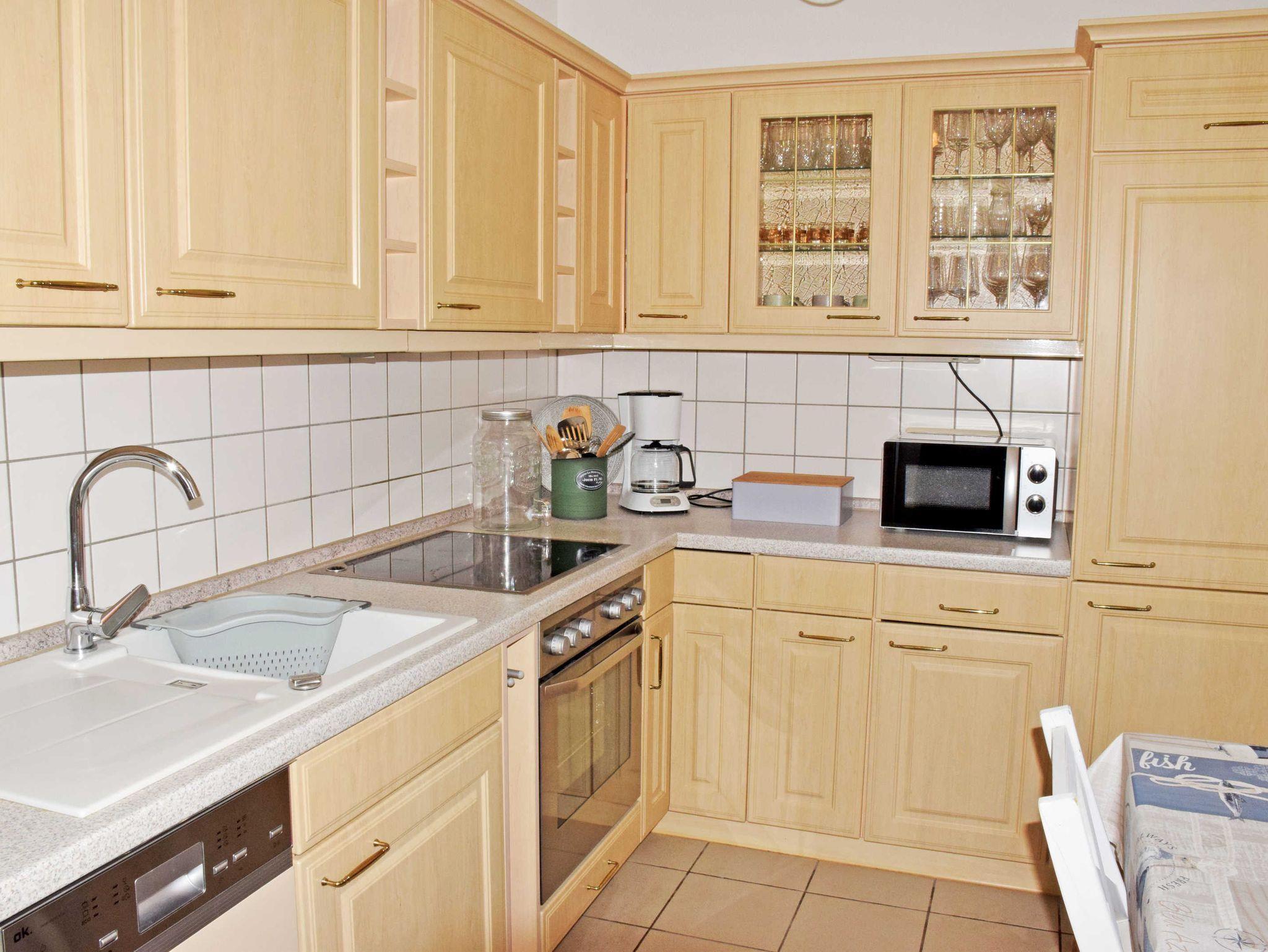 Das große Bad ist mit ebenerdiger Dusche, Waschtisch und WC ausgestattet. Ebenfalls vom Flur aus erreichen Sie die hell und modern eingerichtete Küche mit kleinem Esstisch und einer Küchenzeile mit Cerankochfeldherd-Backofen,Spülmaschine, Kühl- und Gefrierschrank und Mikrowelle. Wasserkocher, Toaster und Kaffeemaschine gehören selbstverständlich ebenfalls zur Ausstattung.