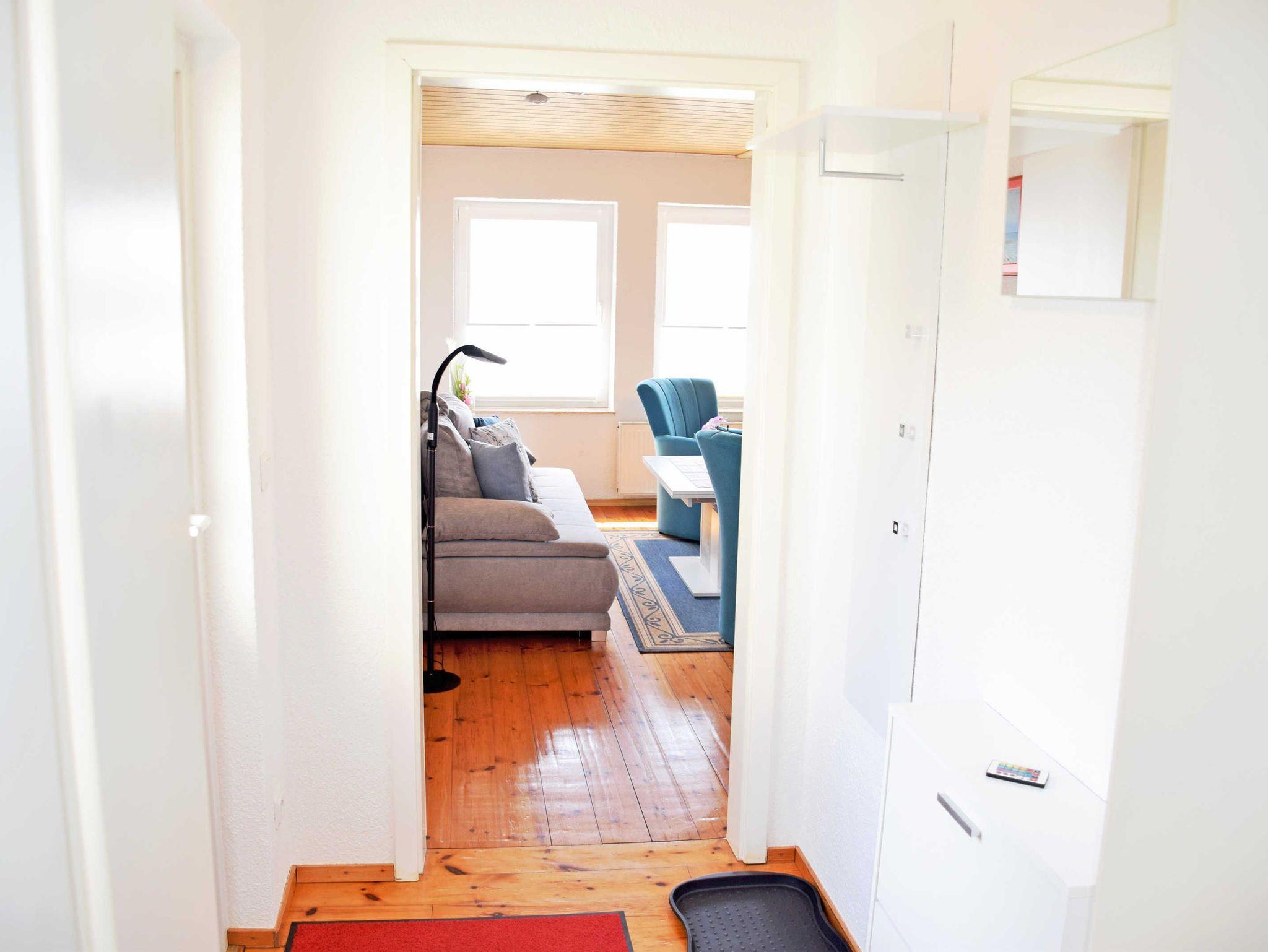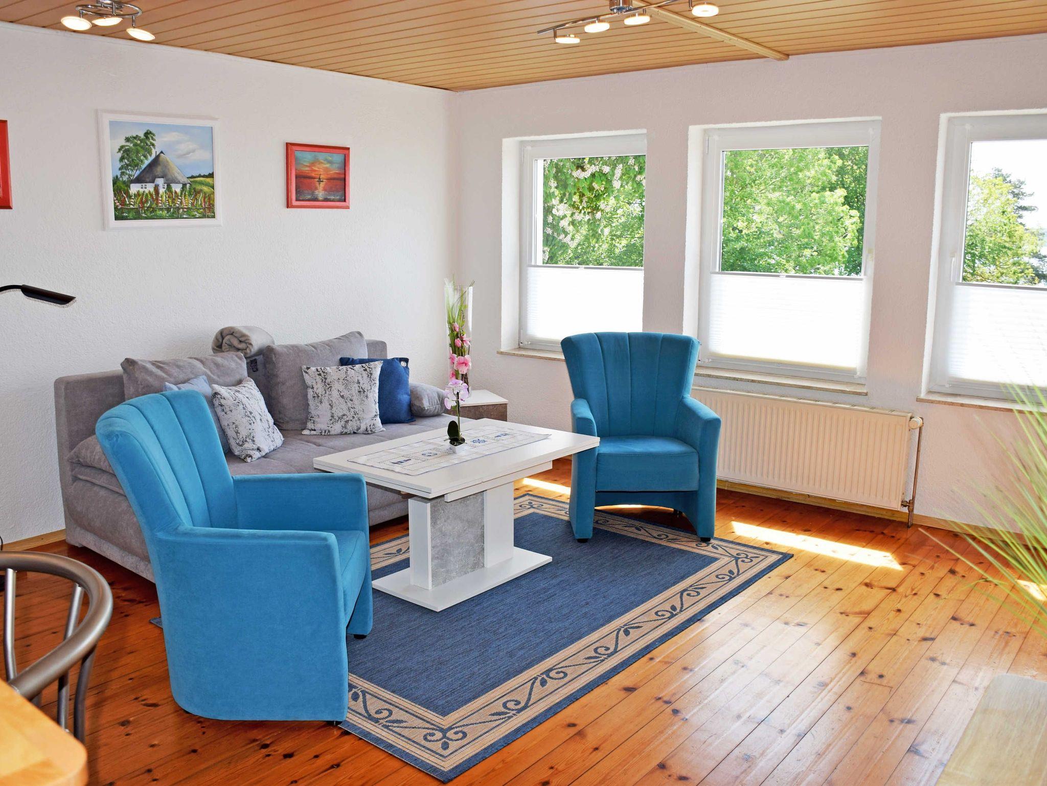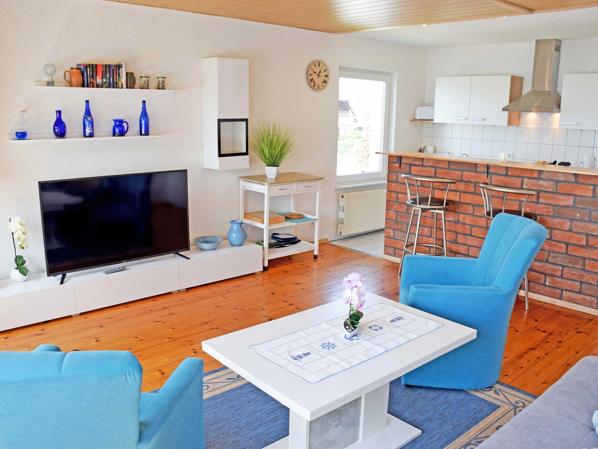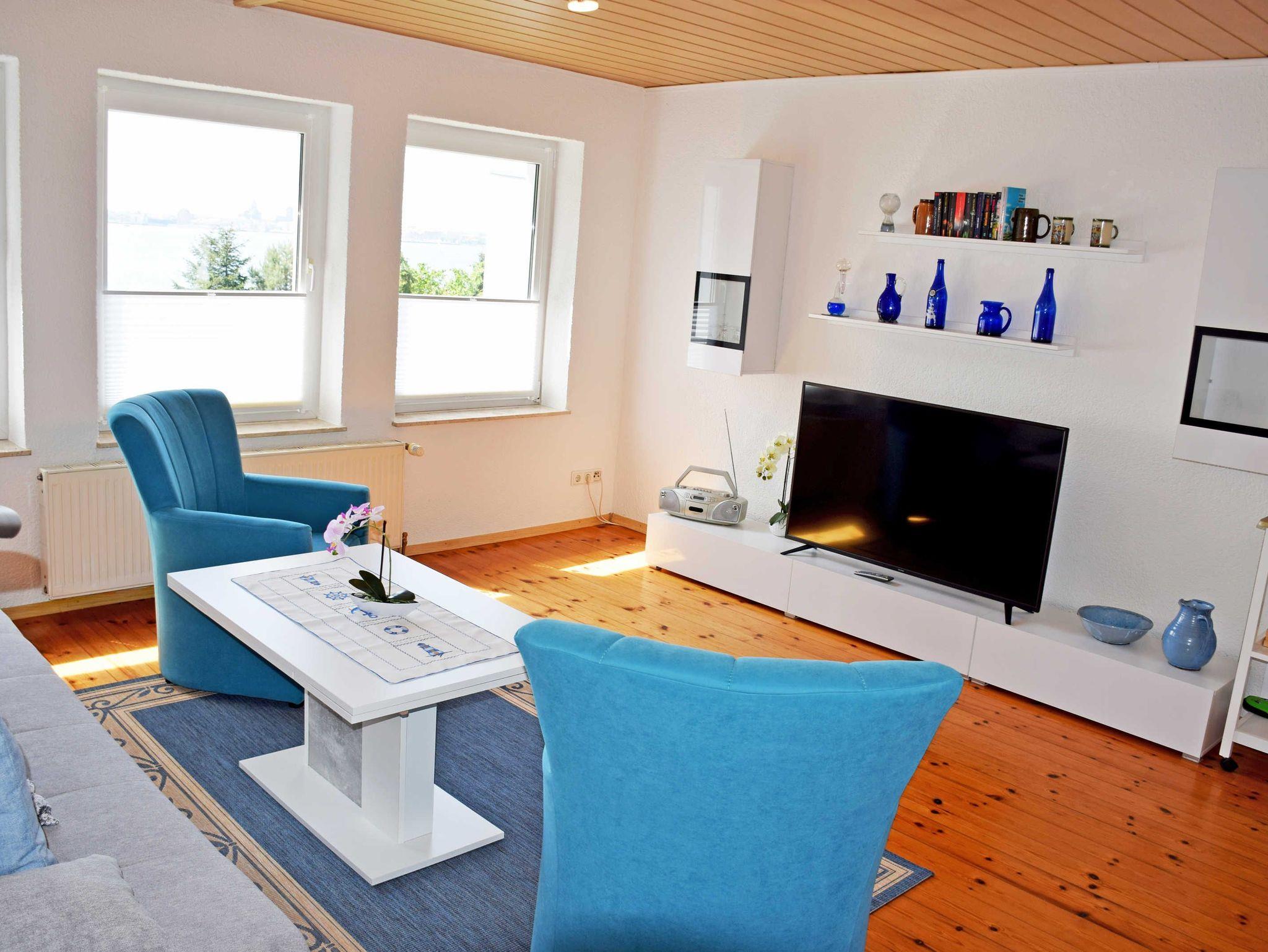 Im Wohnzimmer stehen eine Schlafcouch, Sessel und Tisch sowie ein modernes Flachbild-TV-Gerät. Hier steht auch ein Esstisch mit Stühlen. Aus dem Wohnzimmer heraus hat man einen schönen Ausblick über den Sund nach Stralsund. Die Küchenzeile ist mit einem Herd, Backofen, Abzugshaube, Wasserkocher, Kaffeemaschine, Toaster und Kühlschrank mit Gefrierfach komplett ausgestattet.